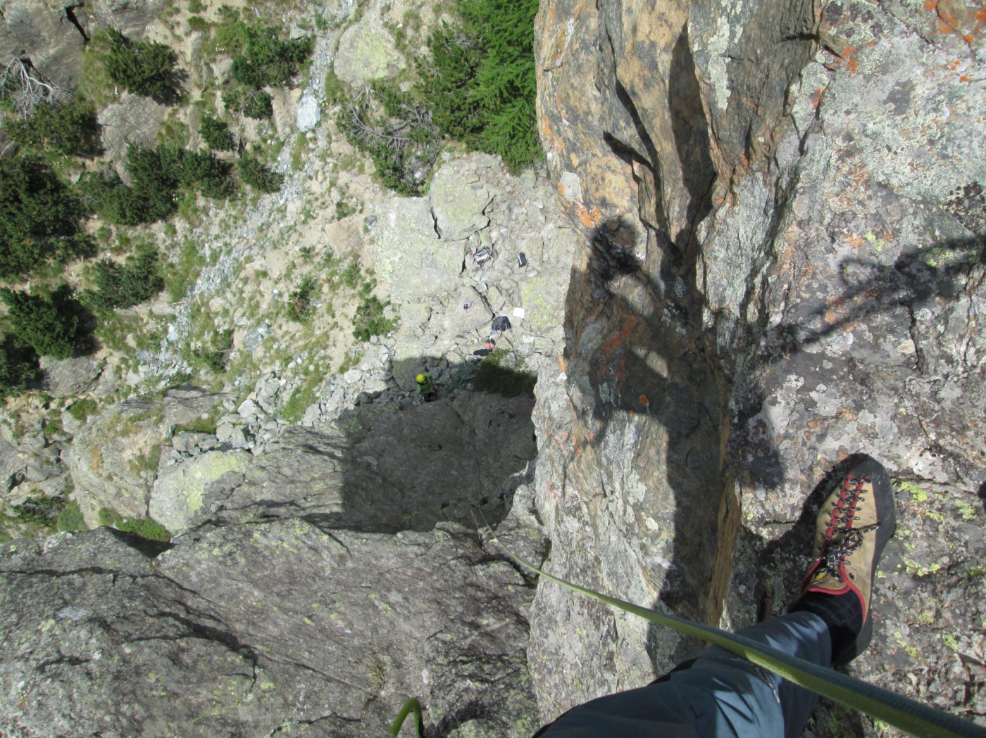 Discesa: se si sono lasciati gli zaini alla base, meglio calarsi con una doppia di 30 metri direttamente sul lato nord, altrimenti è anche possibile una doppia più lunga e aerea sul lato sud.