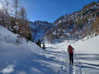 Saliti su traccia già presente che segue il sentiero estivo. Dall’arrivo degli impianti proseguito nel bosco fino all’uscita sulla spalla. Parte finale un po’ lavorata dal vento.