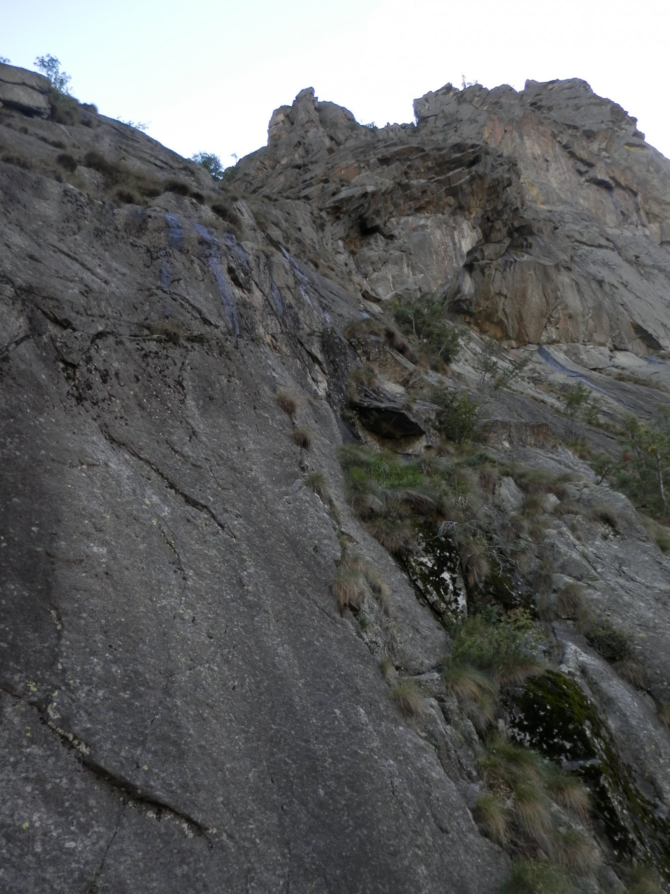 L1,Partenza su placca ,poi in alto due possibilita’ :diretti su muretto verticale con arbusto in uscita ,oppure a dx traverso e ritorno al di sopra a sx .Ancora placca e sosta sotto un tetto. 45mt. 6a+ 6spit. L2 ,traverso a dx in mezzo a ciuffi erbosi che non danno troppo fastidio poi verso una placchetta sospesa nel vuoto(molto carino) ristabilimento sopra ad un tettino e sosta. 40mt, 6a+4spit L3,diedrini e placche in salita verso sx 25 mt ,6a 1spit L4,tiro di trasferimento ,salire per placchette tra erba alla meglio in direzione di uno spit sul bordo sx di una parete verticale ,dallo spit scendere sull’evidente cengia alla base della torre. 40mt, facile 1 spit L5,salire il diedro e spostarsi a sx arrivando ad un breve tettino di 6c che si risolve anche in A0 ancora dritti con bella scalata e poi sosta a sx.30m ,6c,7spit L6,a dx della sosta per fessure poi spigolo DOC fessurato 25mt,6b3spit L7,tiro breve che conviene fare in moulinette ma molto bello fessurato che conduce in vetta .Dalla sosta dritti per fessura sino in vetta moscettone di calata. 15mt, 5c nulla