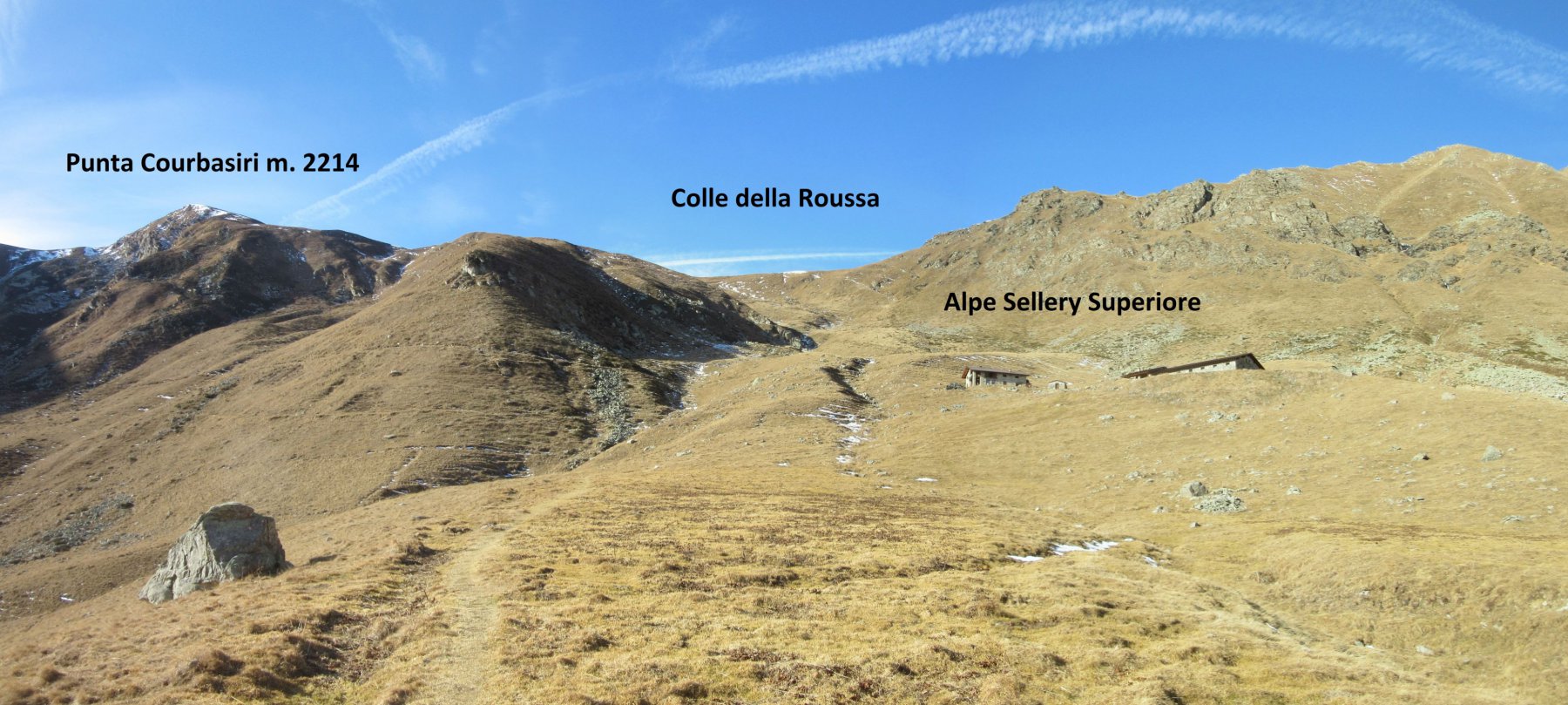 Da dietro il rifugio parte un sentiero (palina) che con ripide svolte raggiunge il colle della Roussa 2017 m. La vetta della Courbasiri 2214 m, ben visibile sulla sinistra, si raggiunge in circa 30 minuti su comodo sentiero. Per raggiungere il Monte Bocciarda 2204 m si scende verso est nell’erba per circa 80 metri di dislivello fino al largo colle che divide le due punte e si risale su modeste pendenze al grosso ometto della cima. Poco distante una croce e una immagine in lamiera di un alpino.