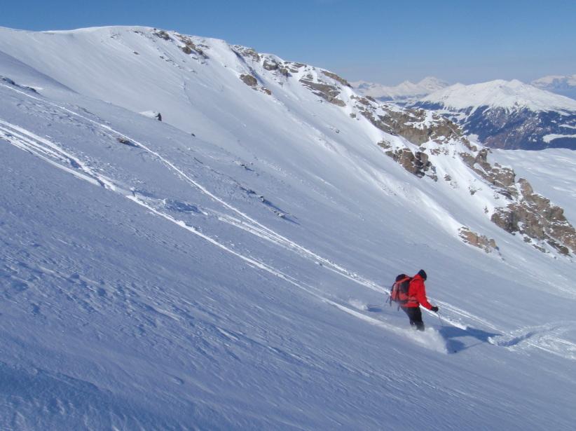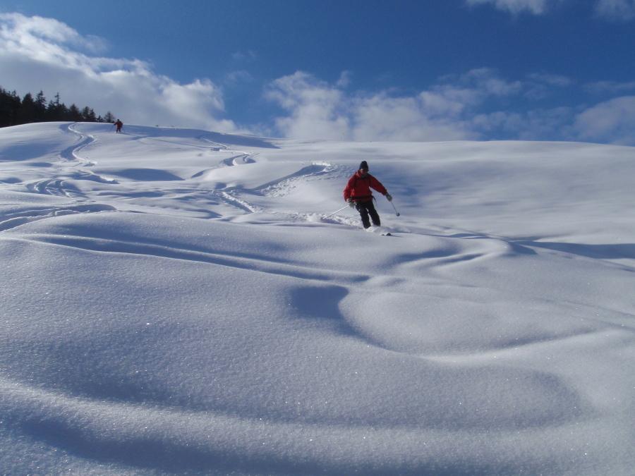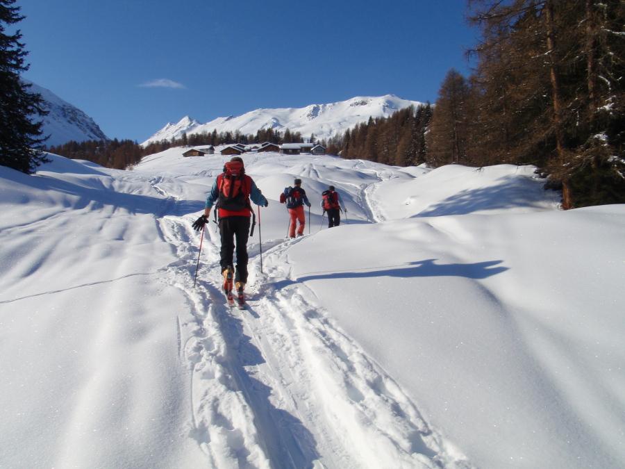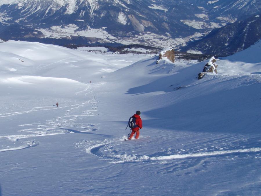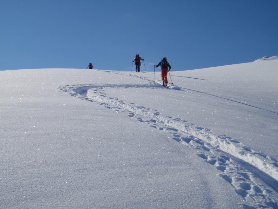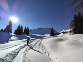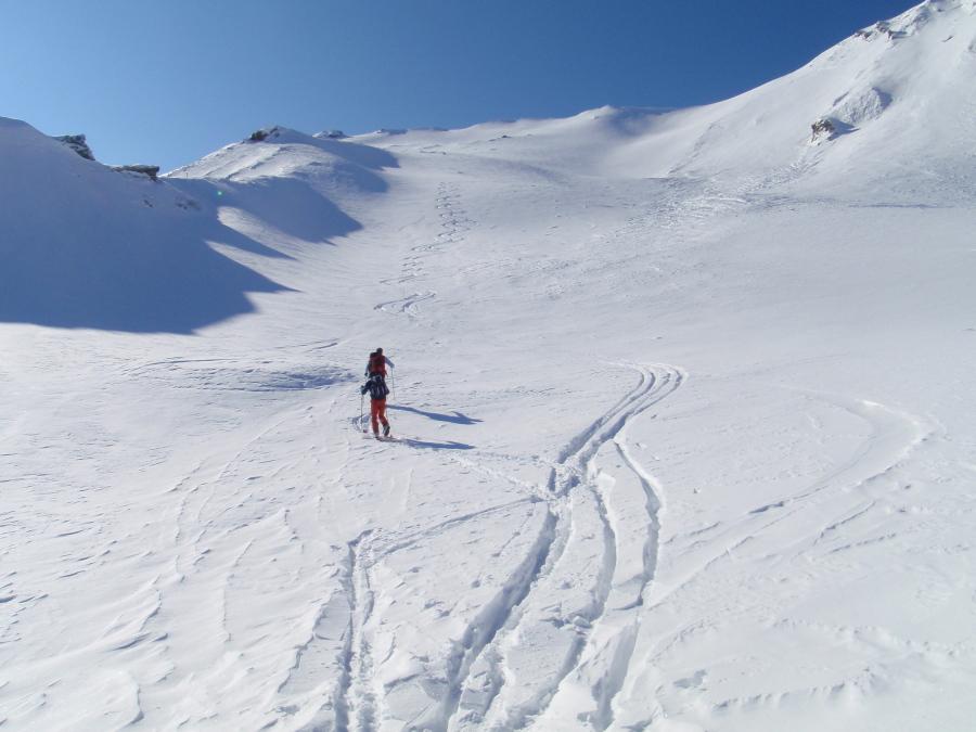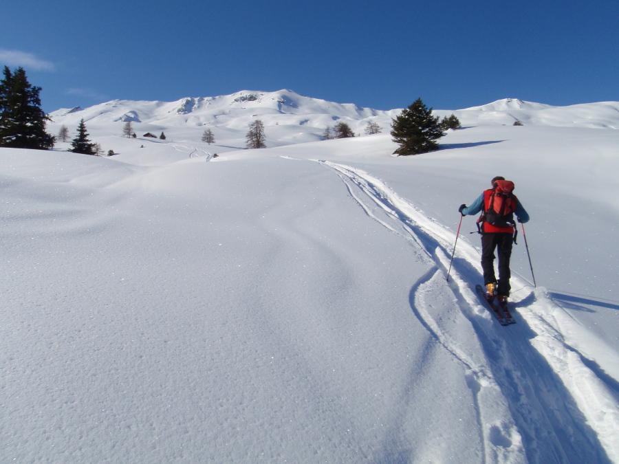 Da qui tenendosi leggermente a sinistra dell’ultima baita entrare nel bosco ben praticabile e superarlo per spuntare sulle radure di Munter (1944m). D’ora in avanti l’itinerario si fa aperto e evidente: risalendo gli ampi e moderatamente inclinati pendii esposti a NE portarsi sino alla base delle costole rocciose che portano alla vetta e, a seconda delle condizioni arrivare in cima direttamente tenendosi a destra dell’ultima costola o risalire il pendio centrale.
