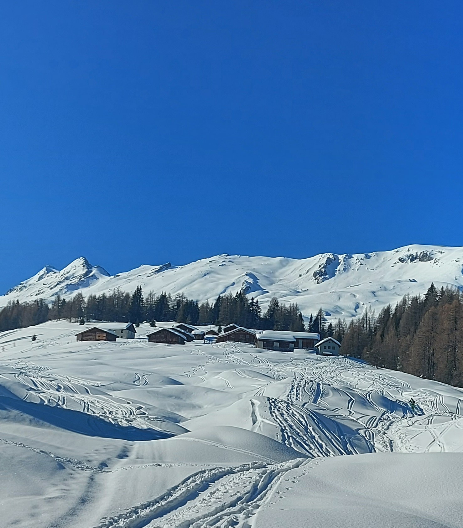 Seguire la stradina per ca. 100 mt. fino ad un sentiero che sale a sinistra (cartello). Seguirlo fino ad una baita dopo il bosco. Si seguono le radure successive su dei bei pendii fino ad incrociare la strada che proviene da Mon e porta a Sturvis. Risalire in direzione S gli evidenti e ampi prati che, intervallati da piccole radure di alberi, portano sino alle case di Planezza (1661m).