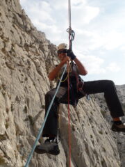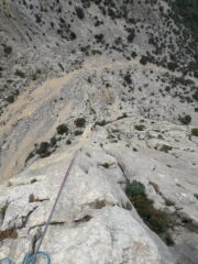 Arrivati a terra dopo 4 calate sulla supercrack siamo risaliti a piedi alla 3° sosta sull’albero della nostra via + a dx per calarci ancora con due doppie alla base dove avevamo lasciato le scarpe, mancavano forse 2/3m con la corda da 60m, non ho visto e non me la sono sentita, ma credo si possa fare