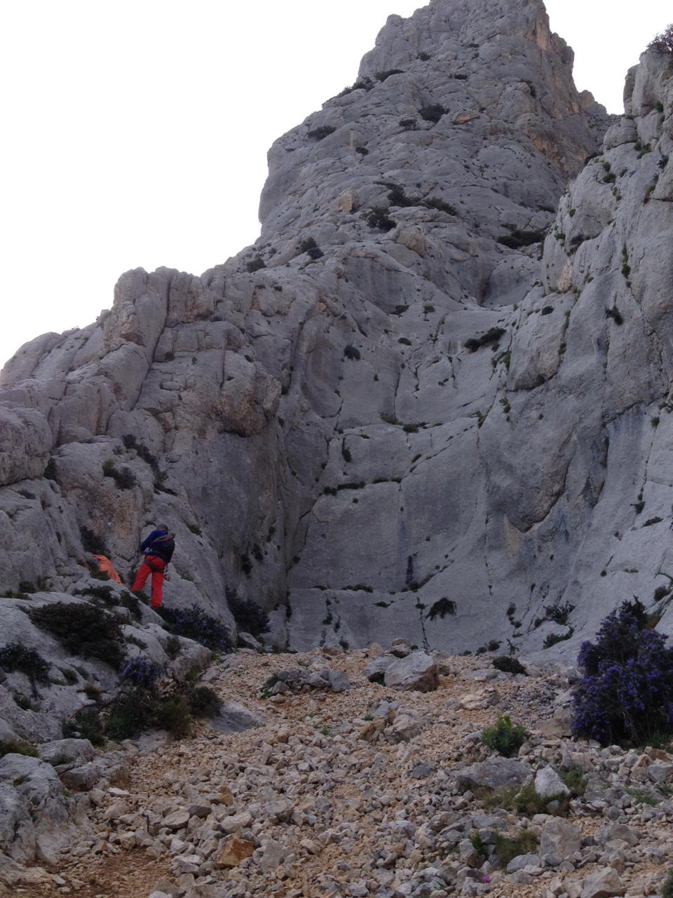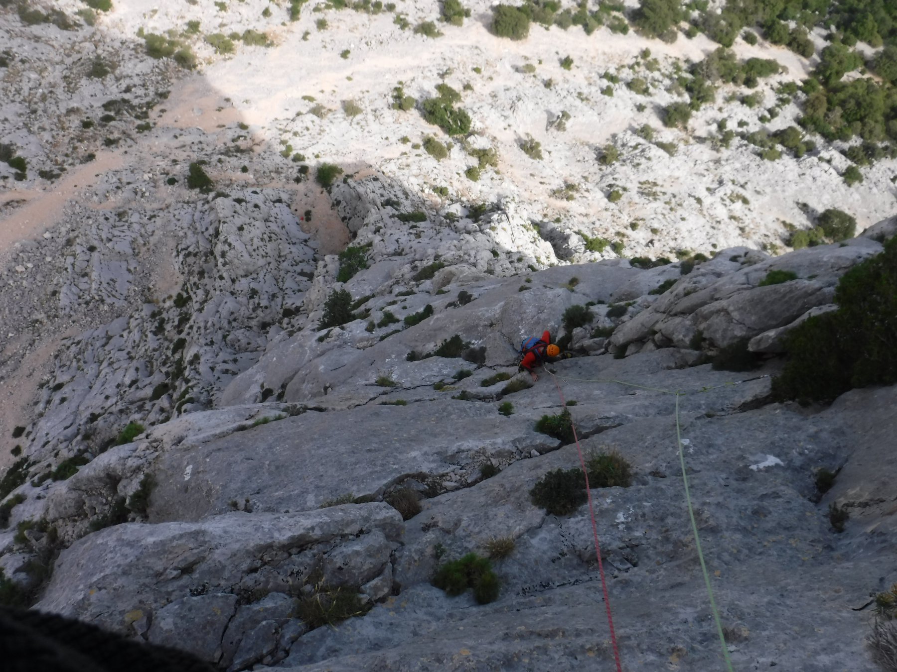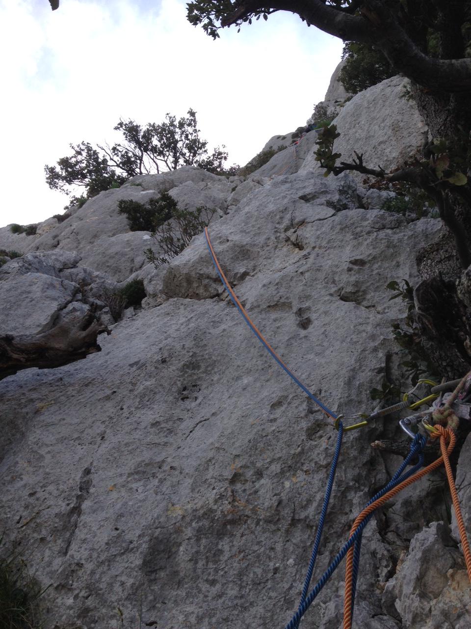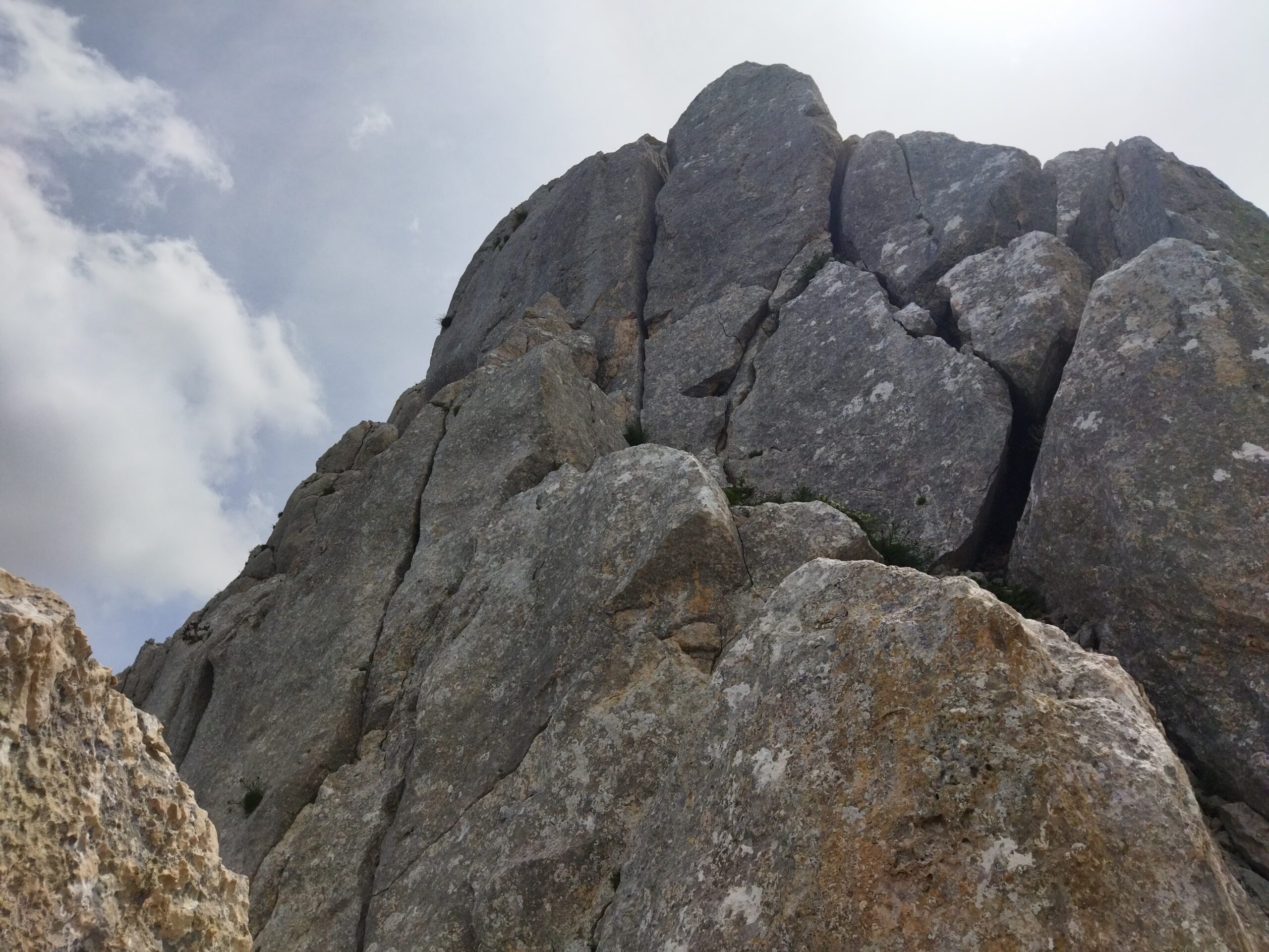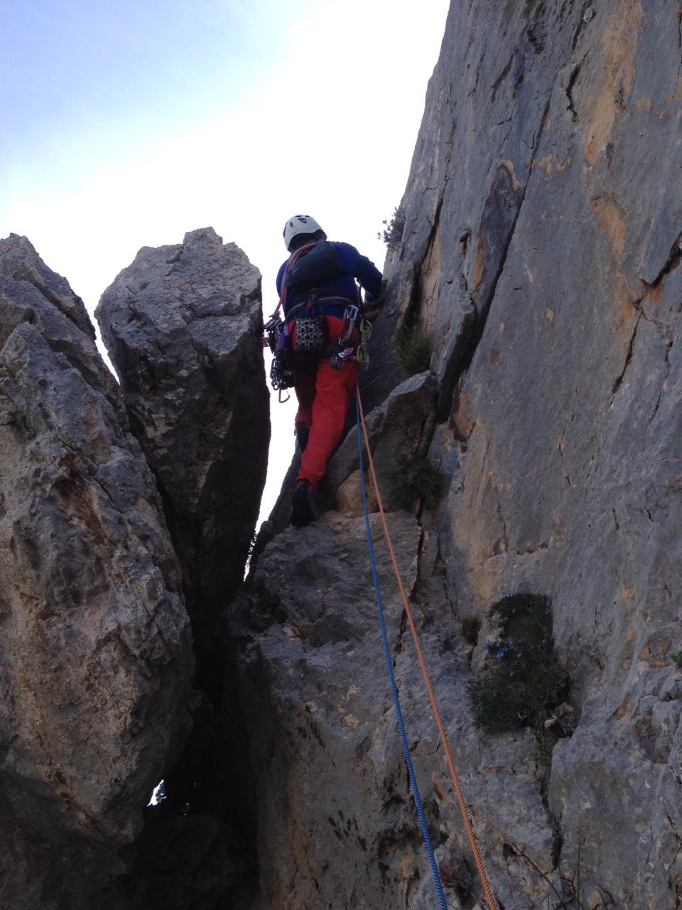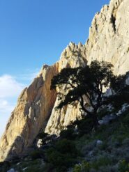 - Salire la crestina lungo una fessura e sostare sulle roccette soprastanti in centro al pilastro (50 m, un passo di IV+). Salire per roccette facili sino a sostare su alberello leggermente sulla destra di un grosso blocco staccato (50 m, III).