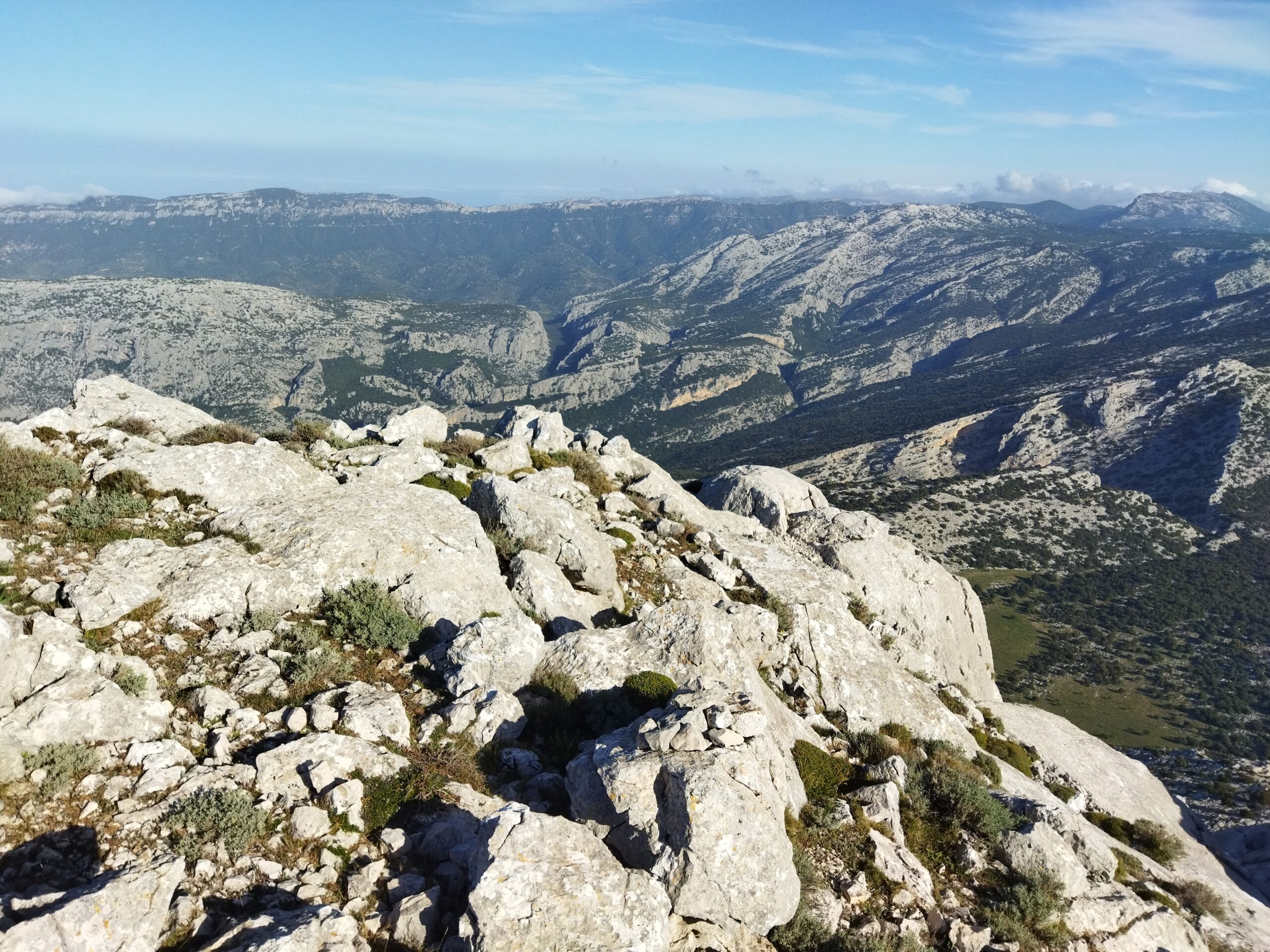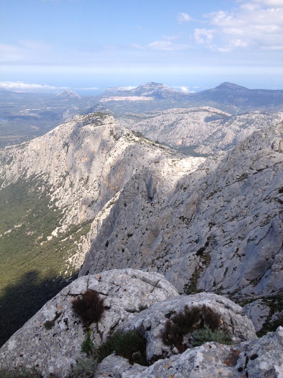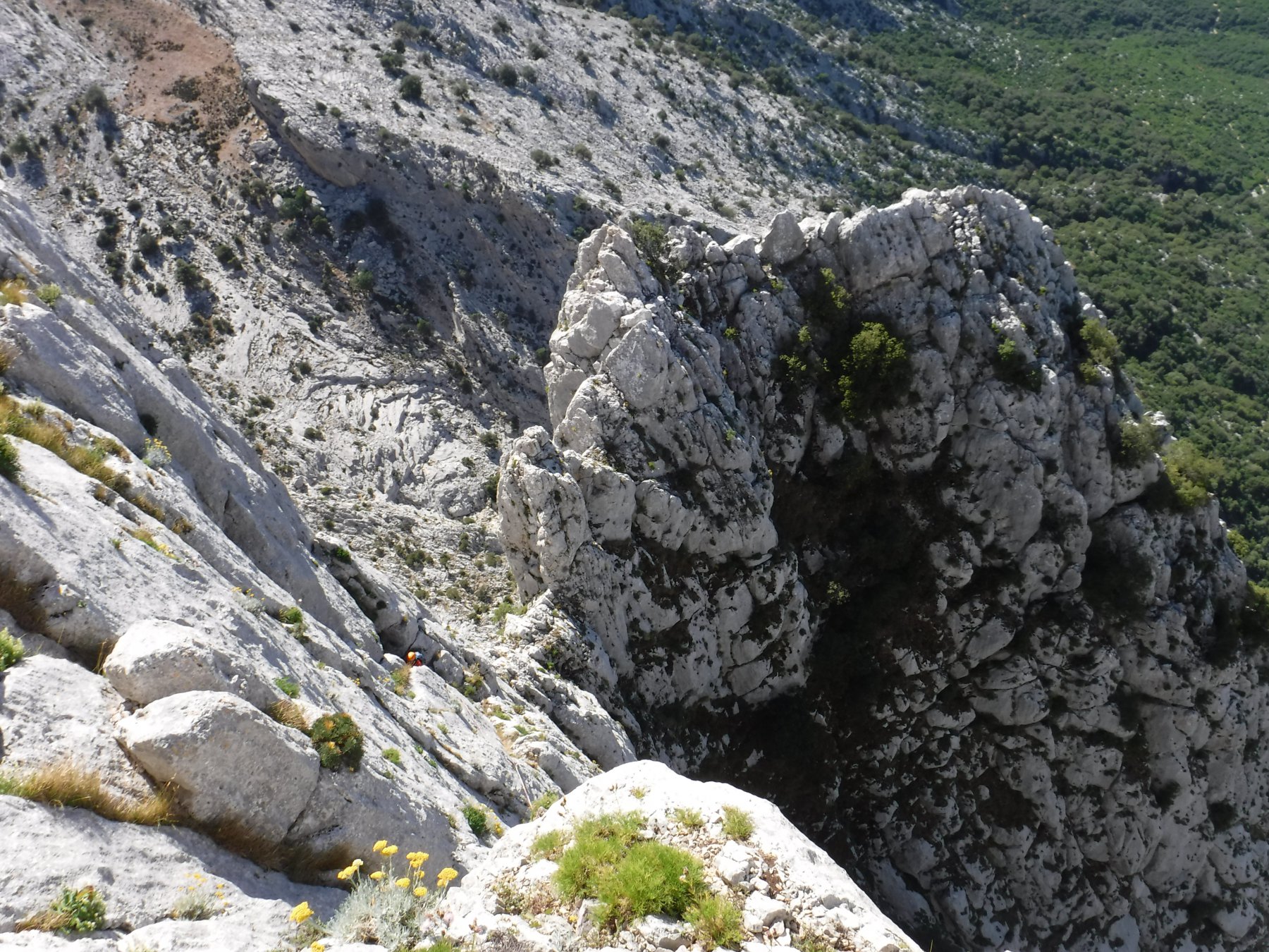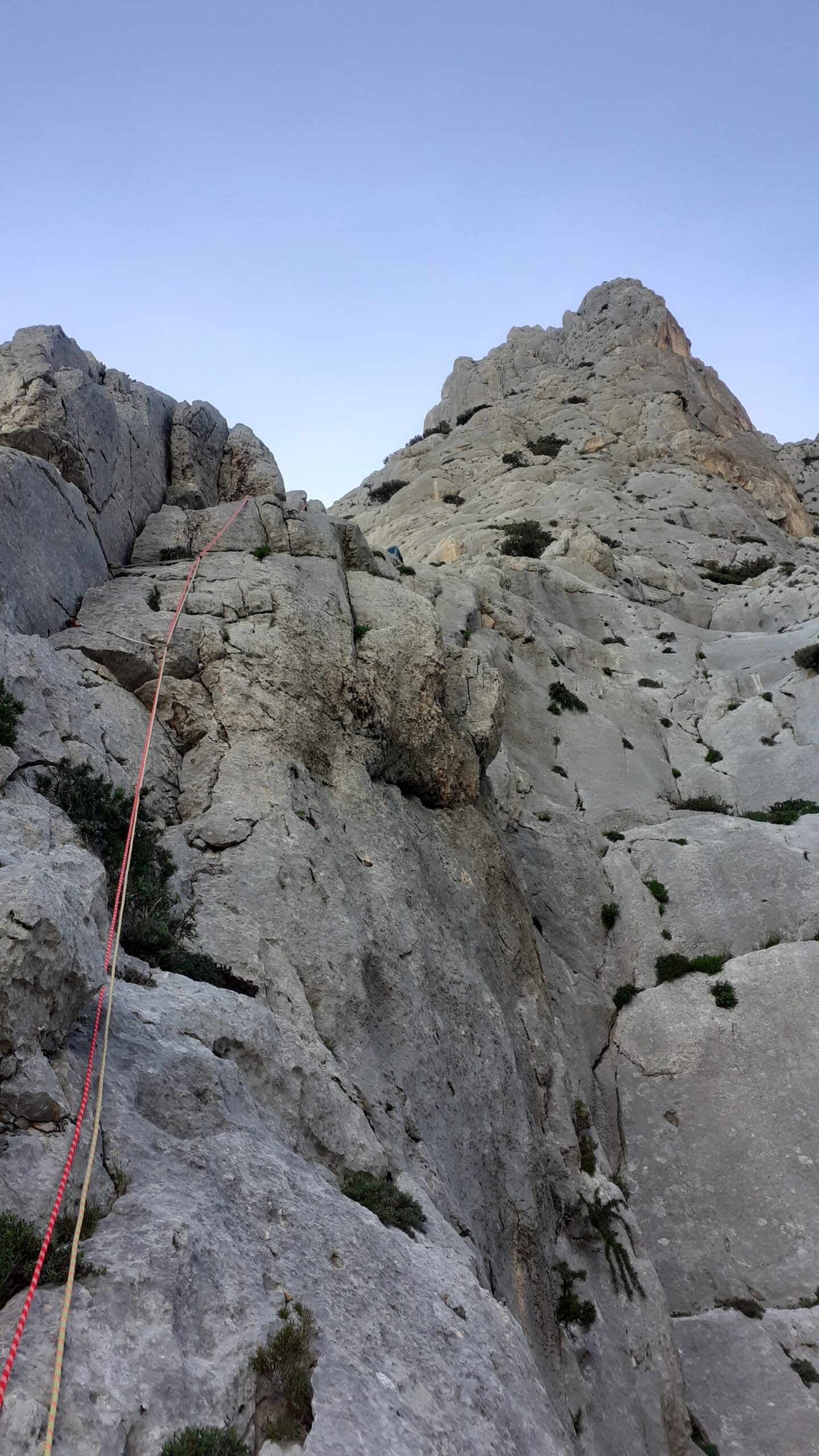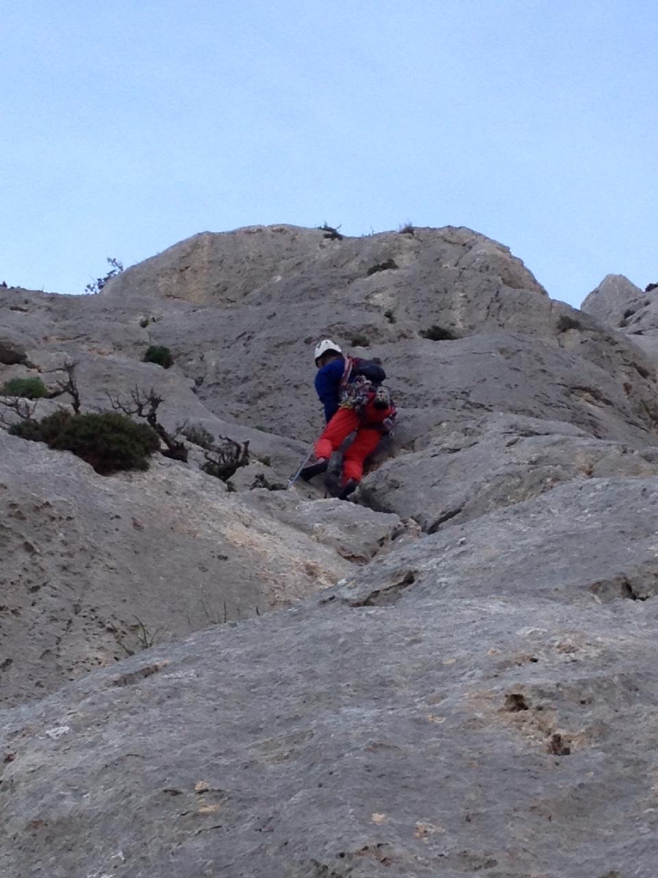- Salire la crestina lungo una fessura e sostare sulle roccette soprastanti in centro al pilastro (50 m, un passo di IV+). Salire per roccette facili sino a sostare su alberello leggermente sulla destra di un grosso blocco staccato (50 m, III).