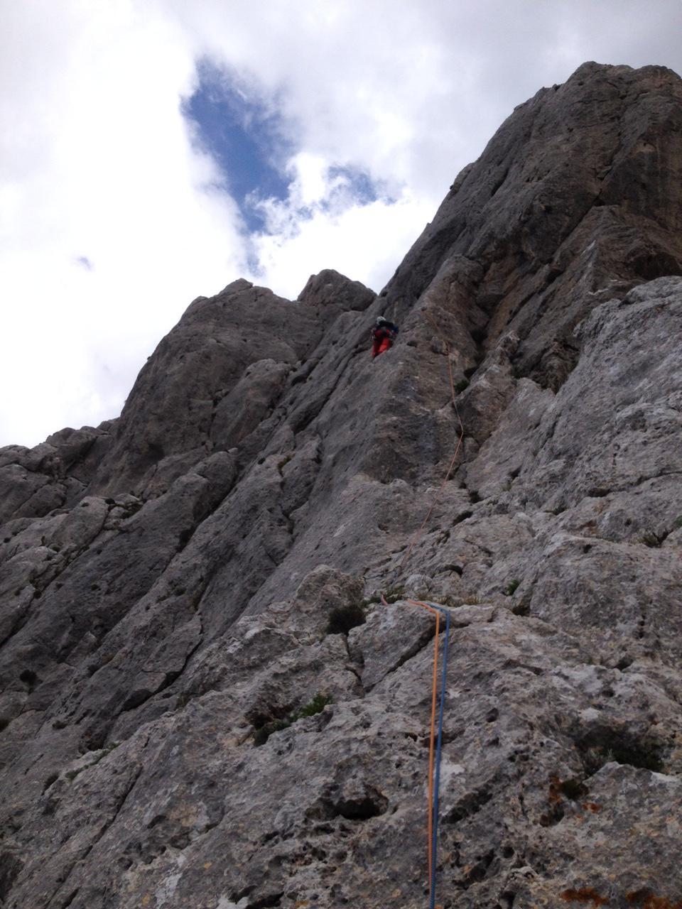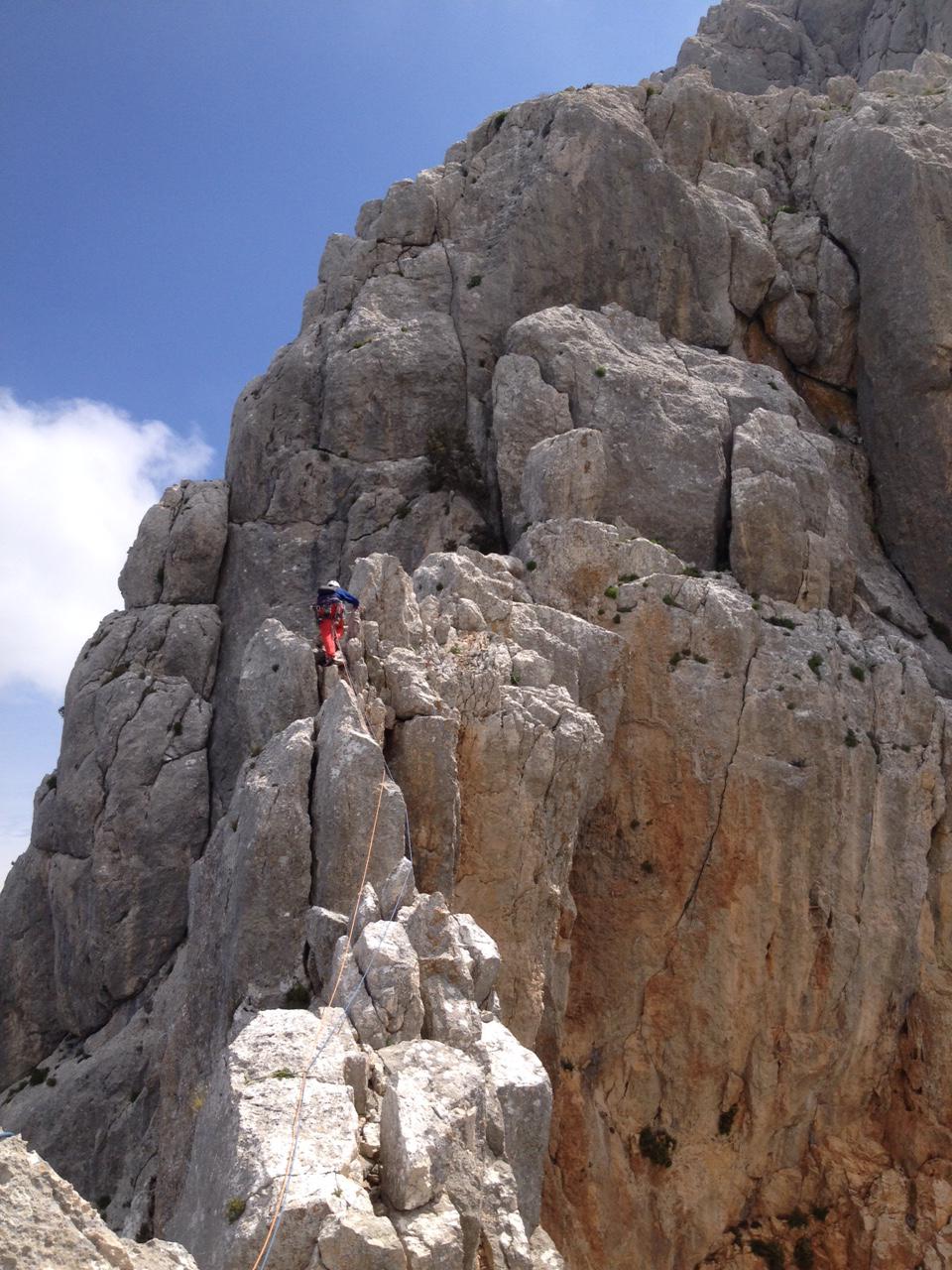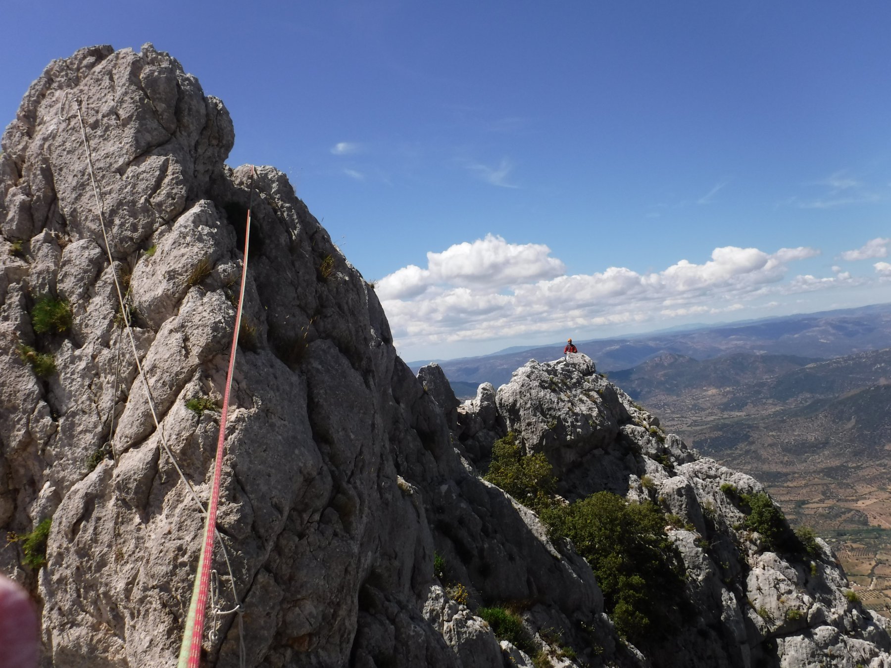 - Continuare verso destra per superare la parte terminale del pilastro senza via obbligata per belle paretine di ottima roccia, sostando su placca inclinata in cima al primo risalto (50 m, IV). Con un passaggio caratteristico spaccare su una stretta forcelletta (chiodo) e salire per fessure e risalti (tralasciando a sinistra la difficile e larga fessura con spit della via dell’Amicizia). Si sosta su una stretta crestina (50 m, III, un passaggio di IV).