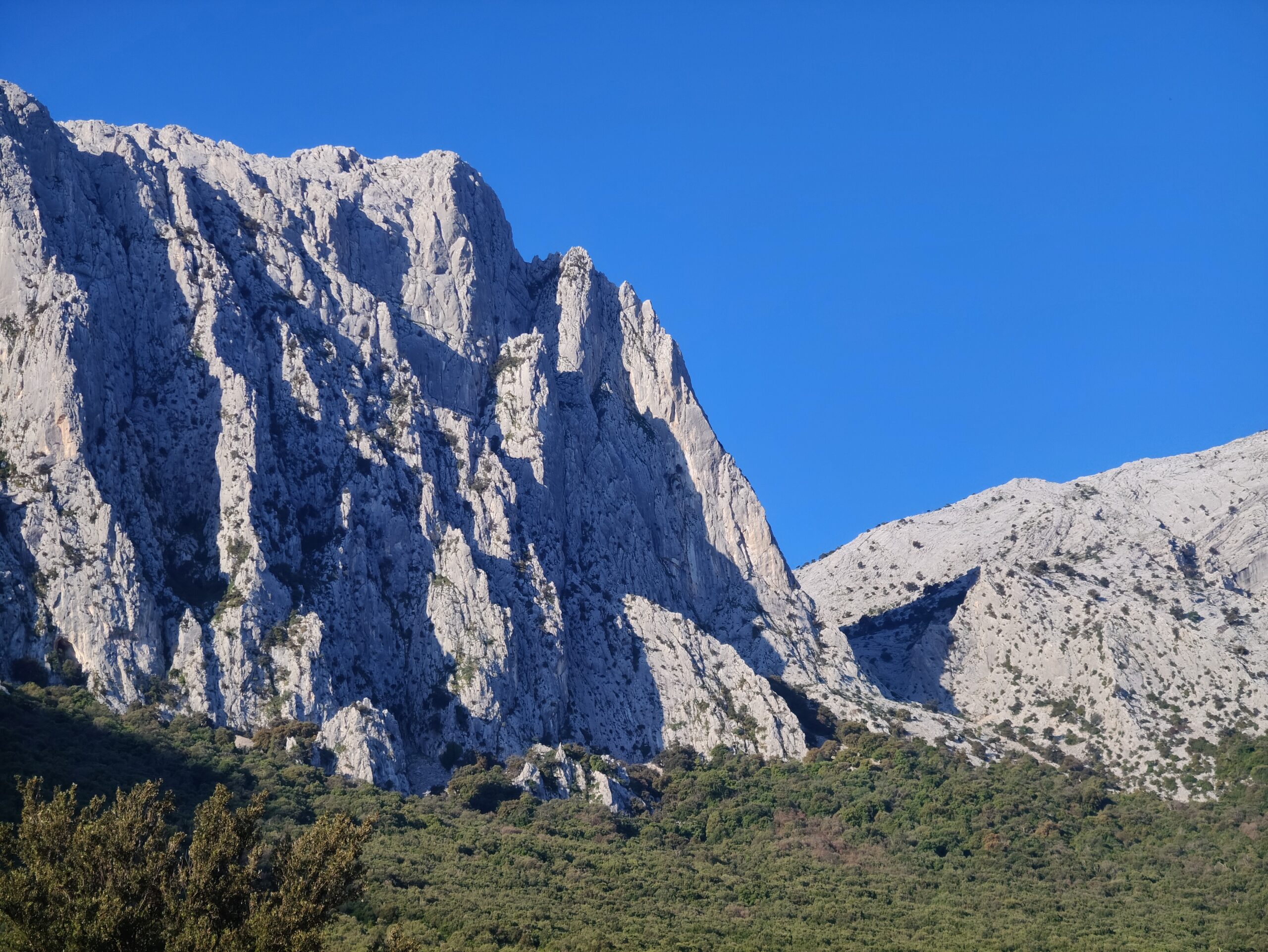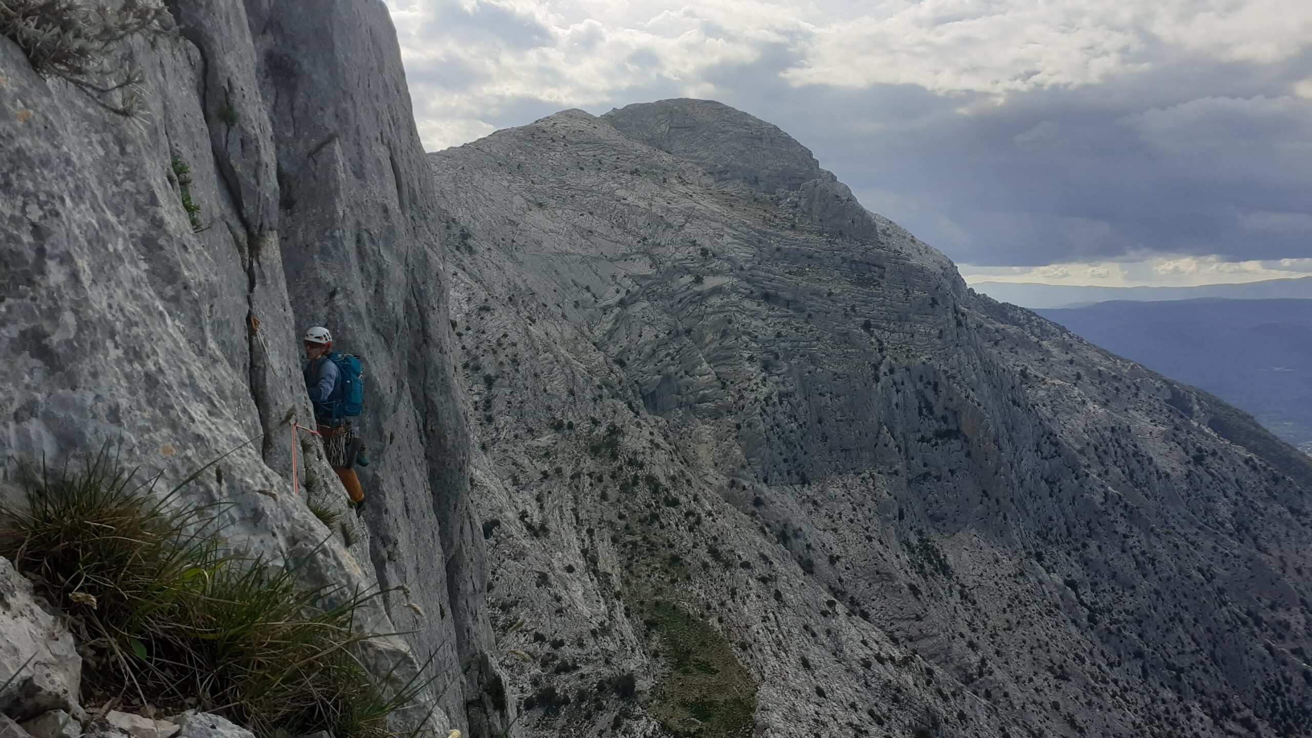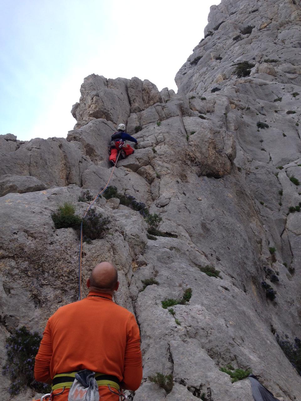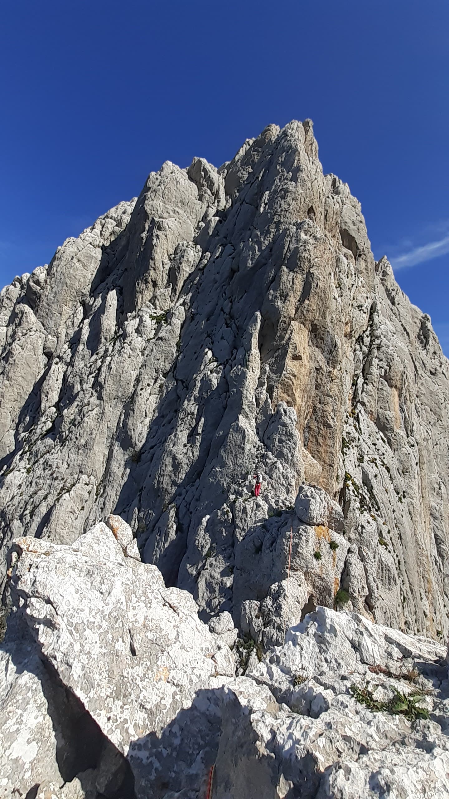 - Continuare verso destra per superare la parte terminale del pilastro senza via obbligata per belle paretine di ottima roccia, sostando su placca inclinata in cima al primo risalto (50 m, IV). Con un passaggio caratteristico spaccare su una stretta forcelletta (chiodo) e salire per fessure e risalti (tralasciando a sinistra la difficile e larga fessura con spit della via dell’Amicizia). Si sosta su una stretta crestina (50 m, III, un passaggio di IV).