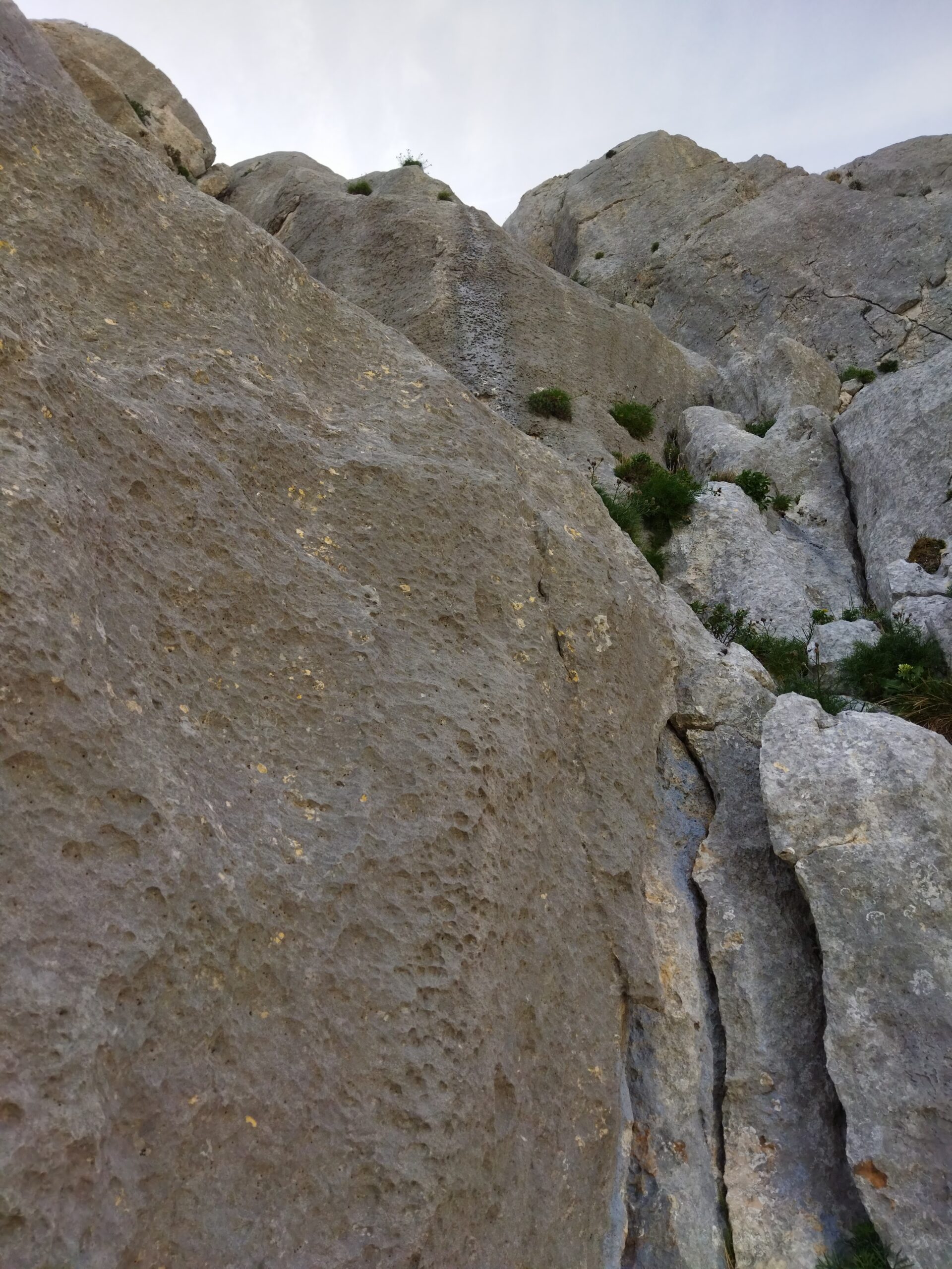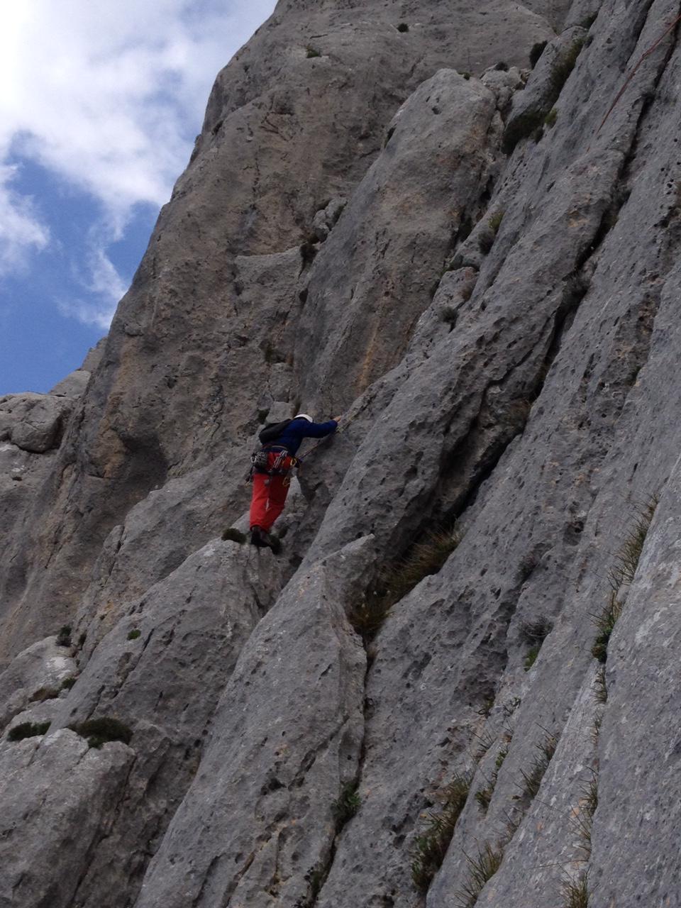 - Salire il blocco appuntito (IV) uscendo sulle belle placche soprastanti. Si salgono le placche un po’ verso sinistra sostando alla base di un diedrino su alberello (50 m, IV).