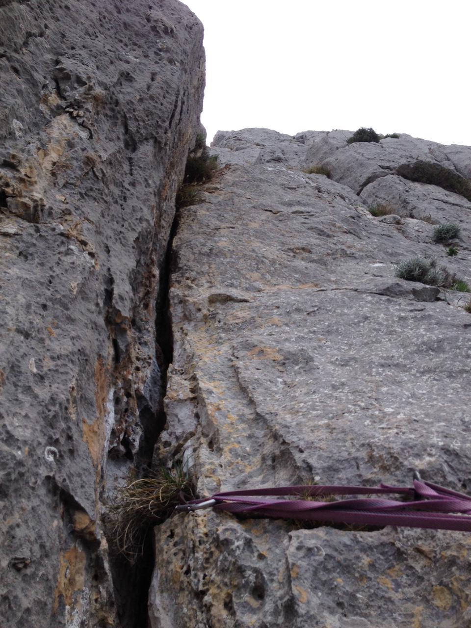 - Si riprende a sinistra la fessura che diventa in breve meno difficile e si sosta appena possibile su spuntoni (50 m, V, IV).