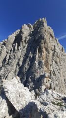 - Facilmente per crestina si scende sino a forcelletta (50 m, II e III). Si attacca ora l’ultimo risalto salendo per lo spigolo che diventa diedro, ma lo si lascia quasi subito per traversare a sinistra su cornice, lasciando invece la via dell’Amicizia che prosegue diritto. Si sosta quindi sulla parete N (25 m, V-).