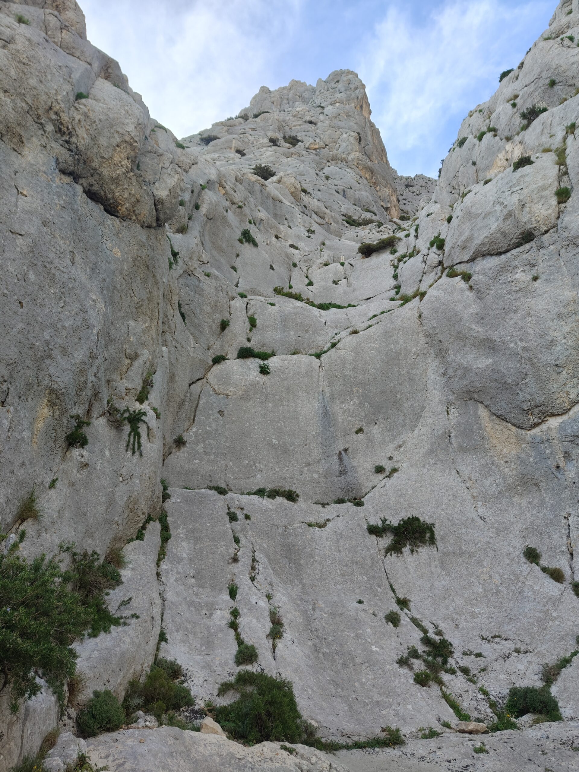 - Risalire il diedro, poi per fessure diagonali un po’ erbose sino nel canale terminale (50 m, IV e V).