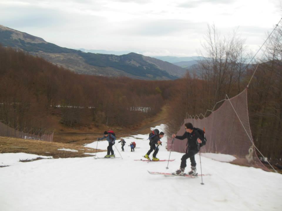 Dal parcheggio degli impianti si riescono a mettere gli sci circa a quota 1400 m, in prossimità del laghetto artificiale.