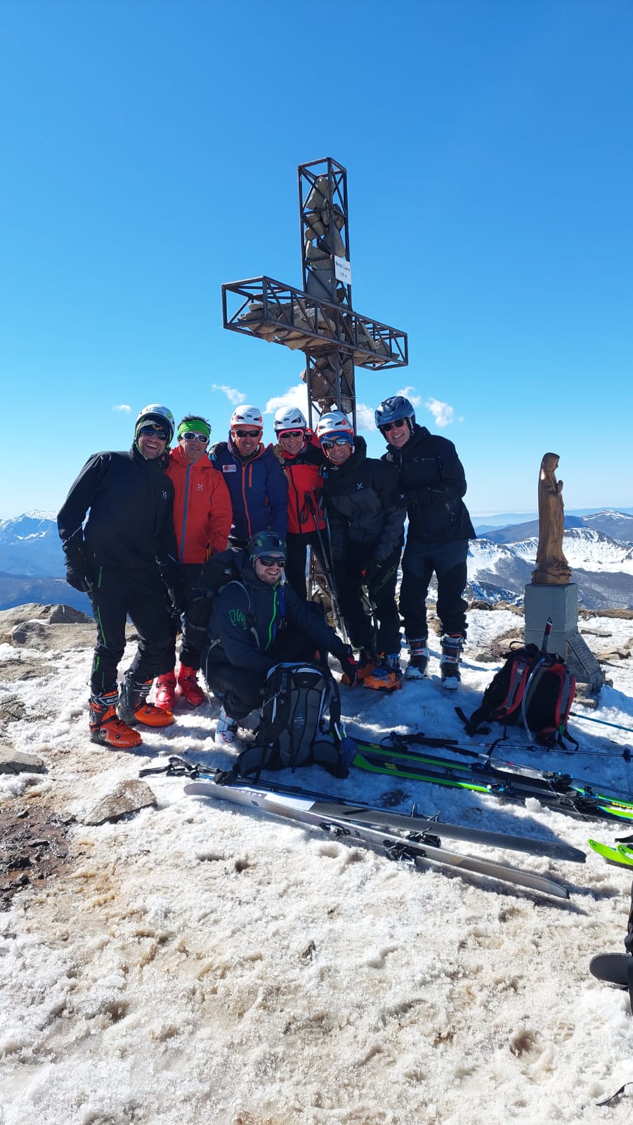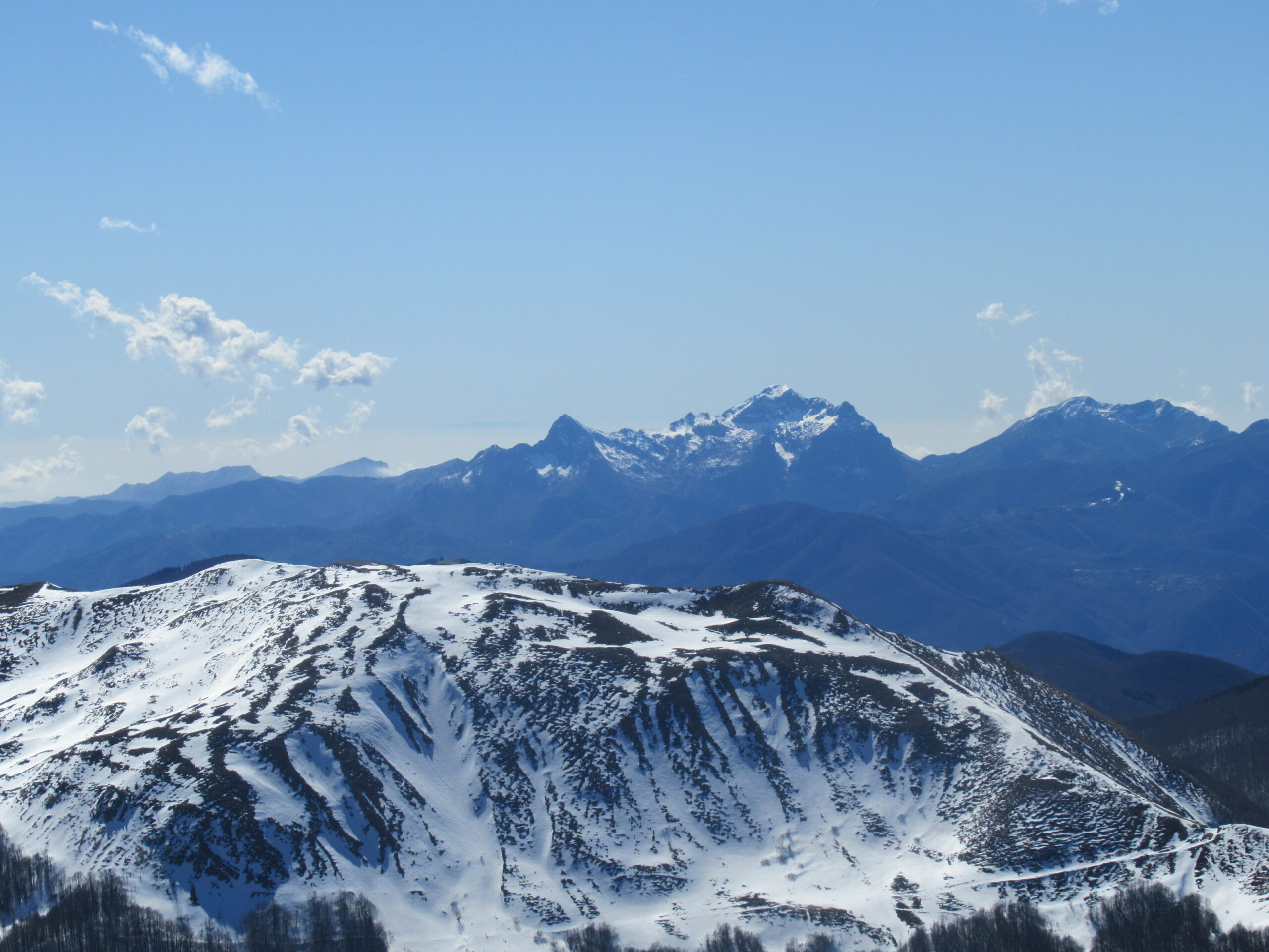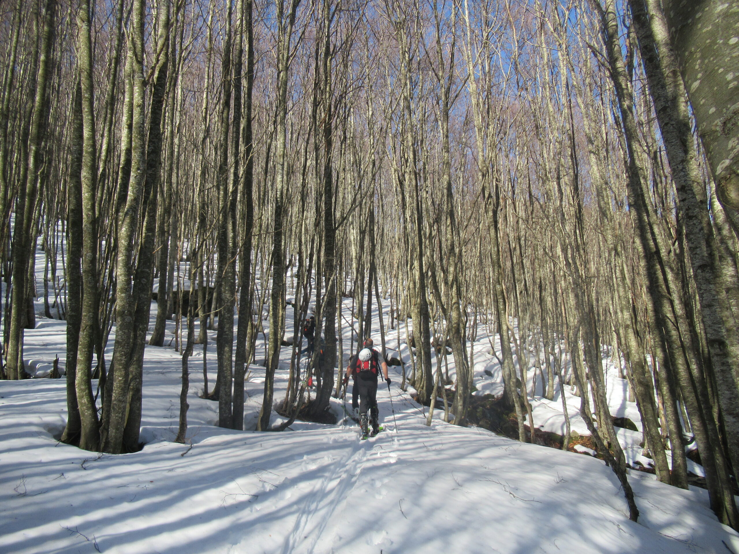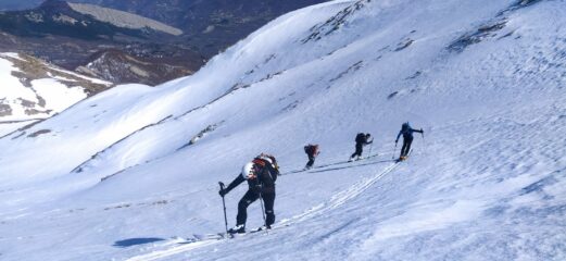 Quindici minuti di portage e poi neve continua fino in vetta, salvo qualche togli e metti lungo la prima parte sulle piste.