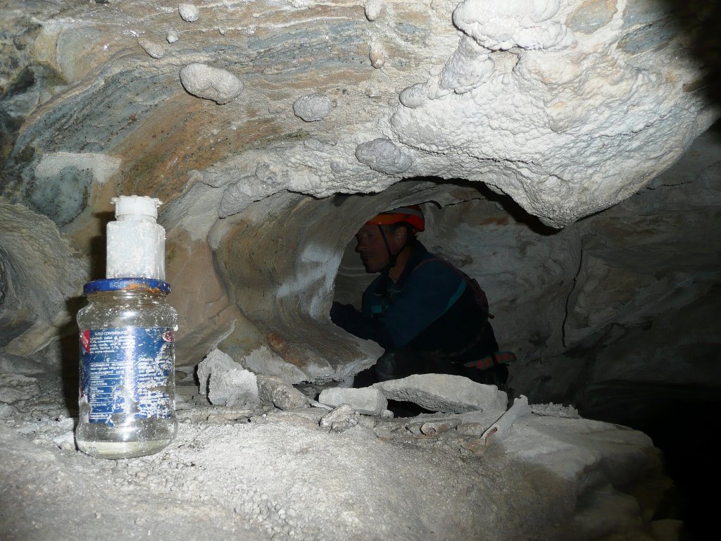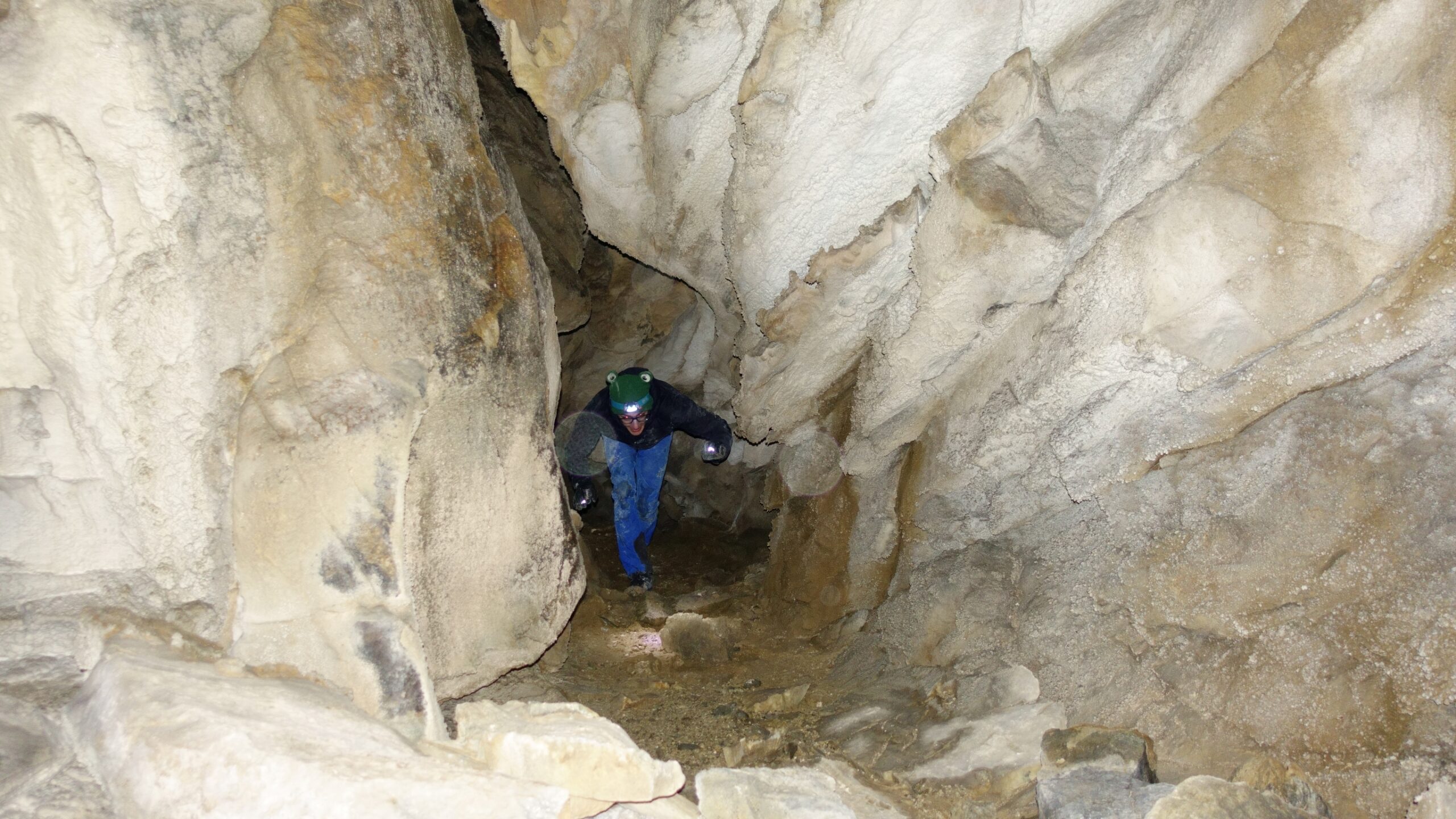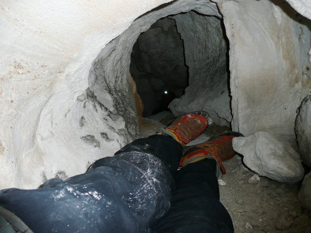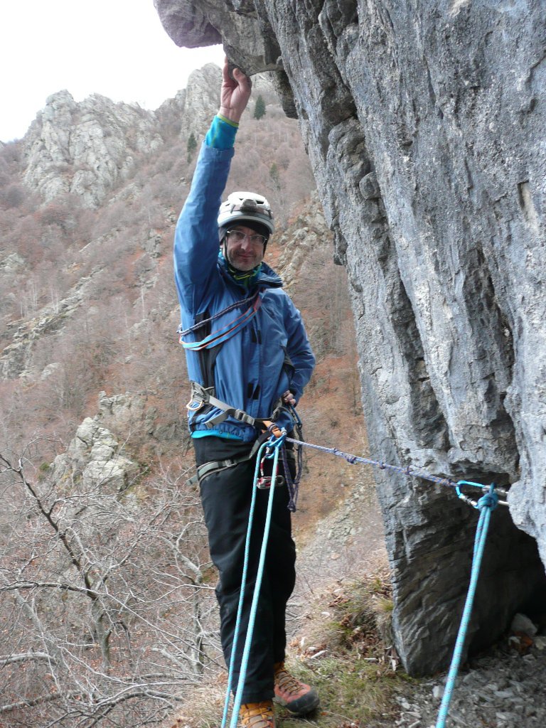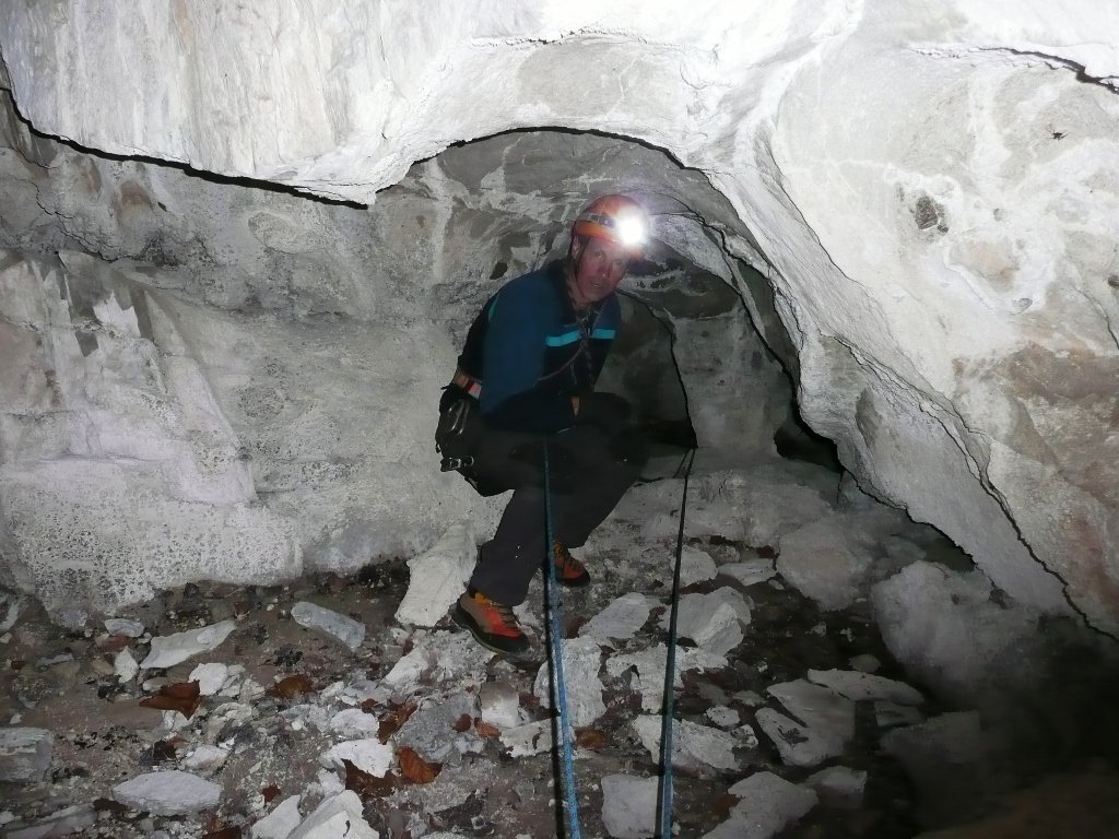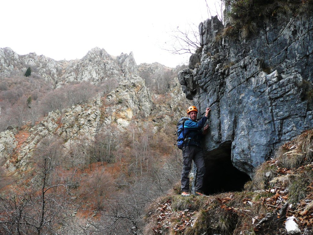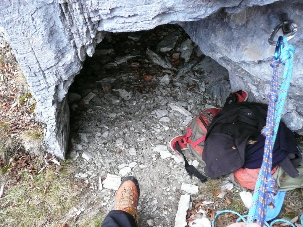 Gli ultimi metri prima di raggiungere l'ingresso (catasto grotte 1593 Pi/TO) sono serviti da una corda fissa la cui integrità è sempre da verificare. Presenti tasselli nella roccia calcarea in cima al tratto ripido sopra la corda fissa e all'ingresso della stessa grotta.