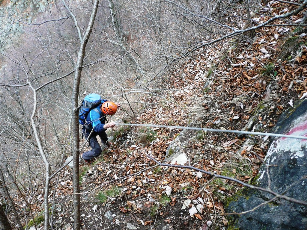 Sono presenti anche strisce di nastro da cantiere legate ai numerosi arbusti. Risalire fino a quota 1350 m con ultimo tratto molto ripido sempre segnalato da evidenti bolli rossi e frecce.