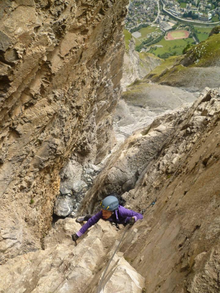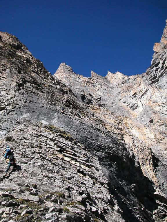 Eppure la ferrata ci passa proprio in mezzo, mentre si diffonde il passaparola: rasentare sempre la parete.