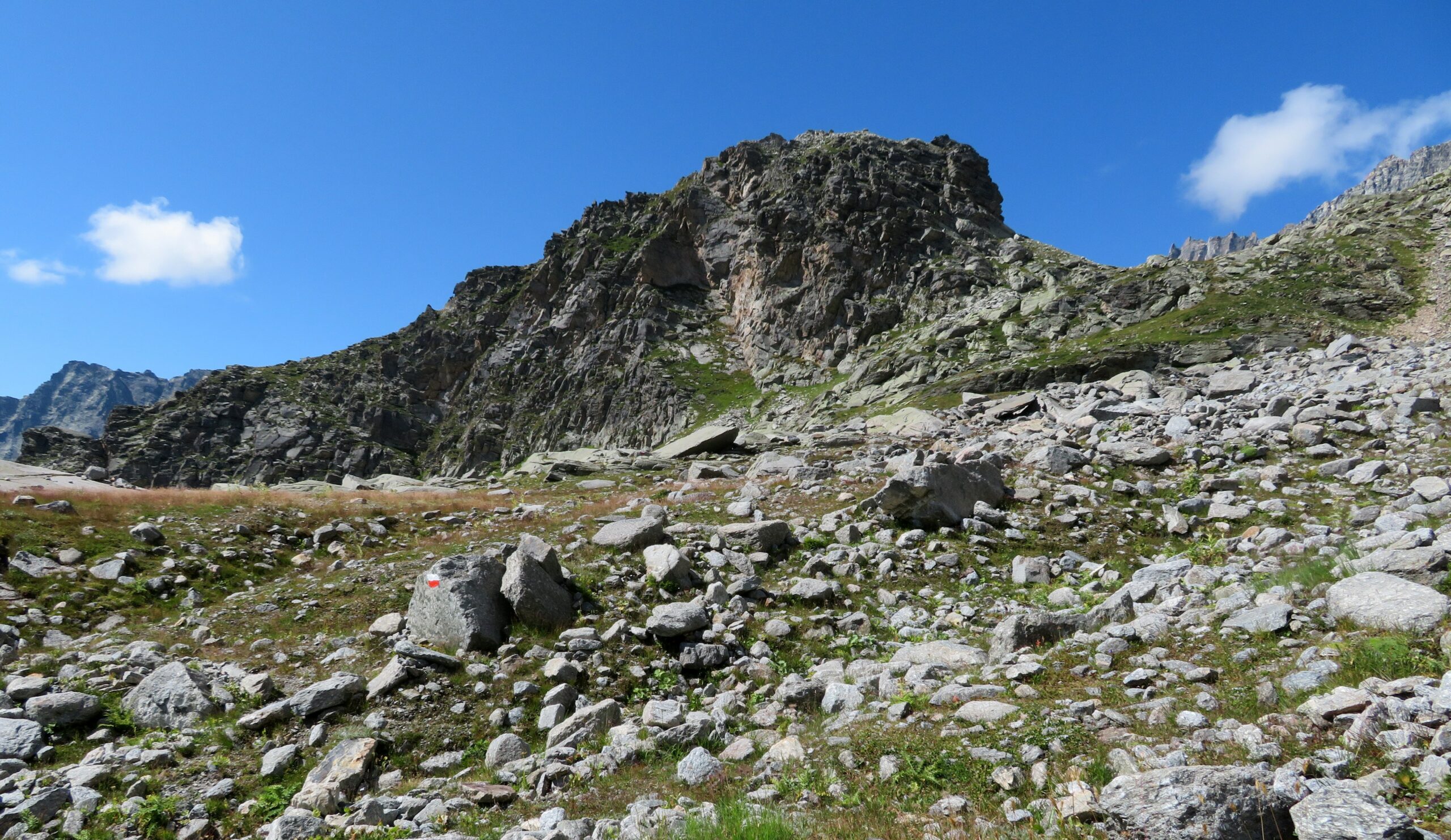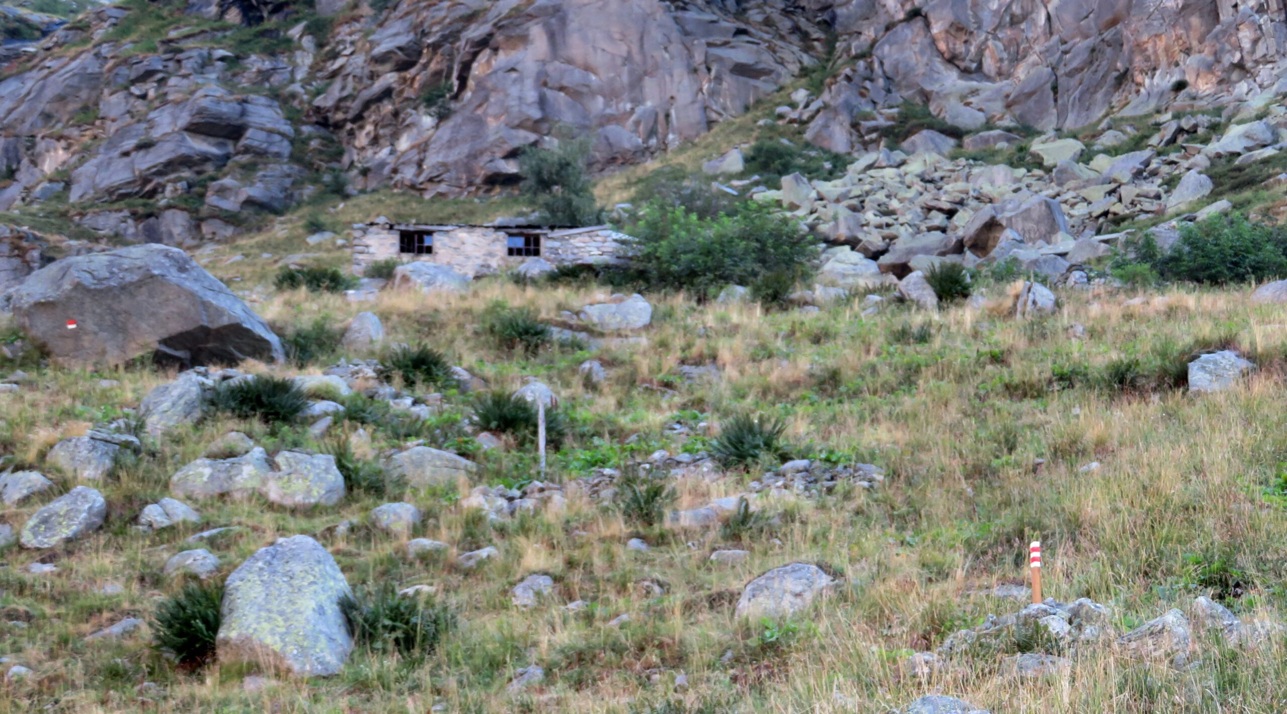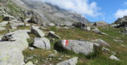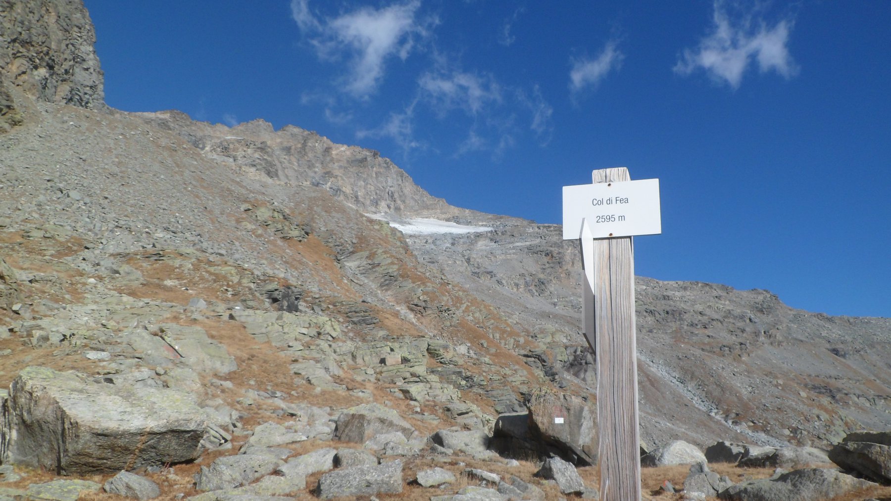Si cammina frequentemente in mezzo a rododendri ed altri bassi cespugli, senza individuare dove si appoggiano i piedi e quest’ultima parte del percorso è spesso molto ripida. Poco oltre il passaggio attrezzato, il percorso cambia direzione puntando indicativamente verso Nord-Ovest ed aumentano i segni di vernice e pure la traccia risulta finalmente visibile e ci conduce ad una vasta conca posta ad Est del Col di Fea. Pur essendo a quote relativamente basse, l’ambiente e molto selvaggio ed è quello tipico dell’alta quota. Superando possibili lingue di neve presenti fino a stagione inoltrata e sempre seguendo i segni si giunge al colle.