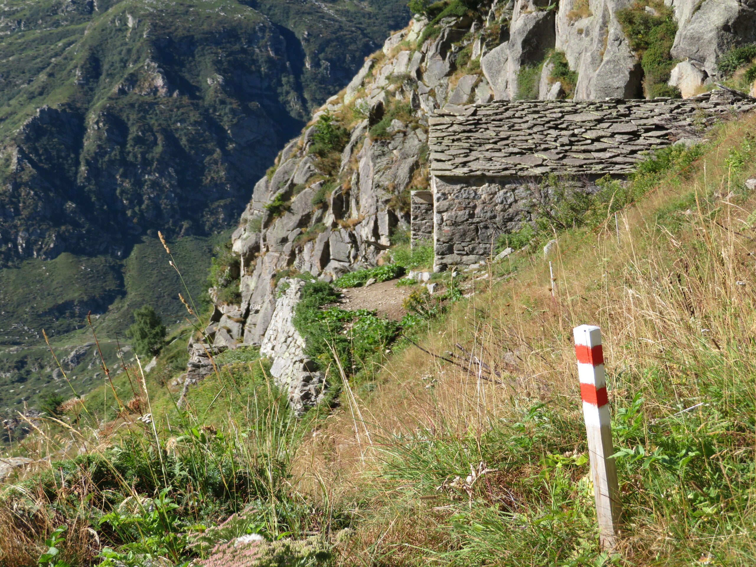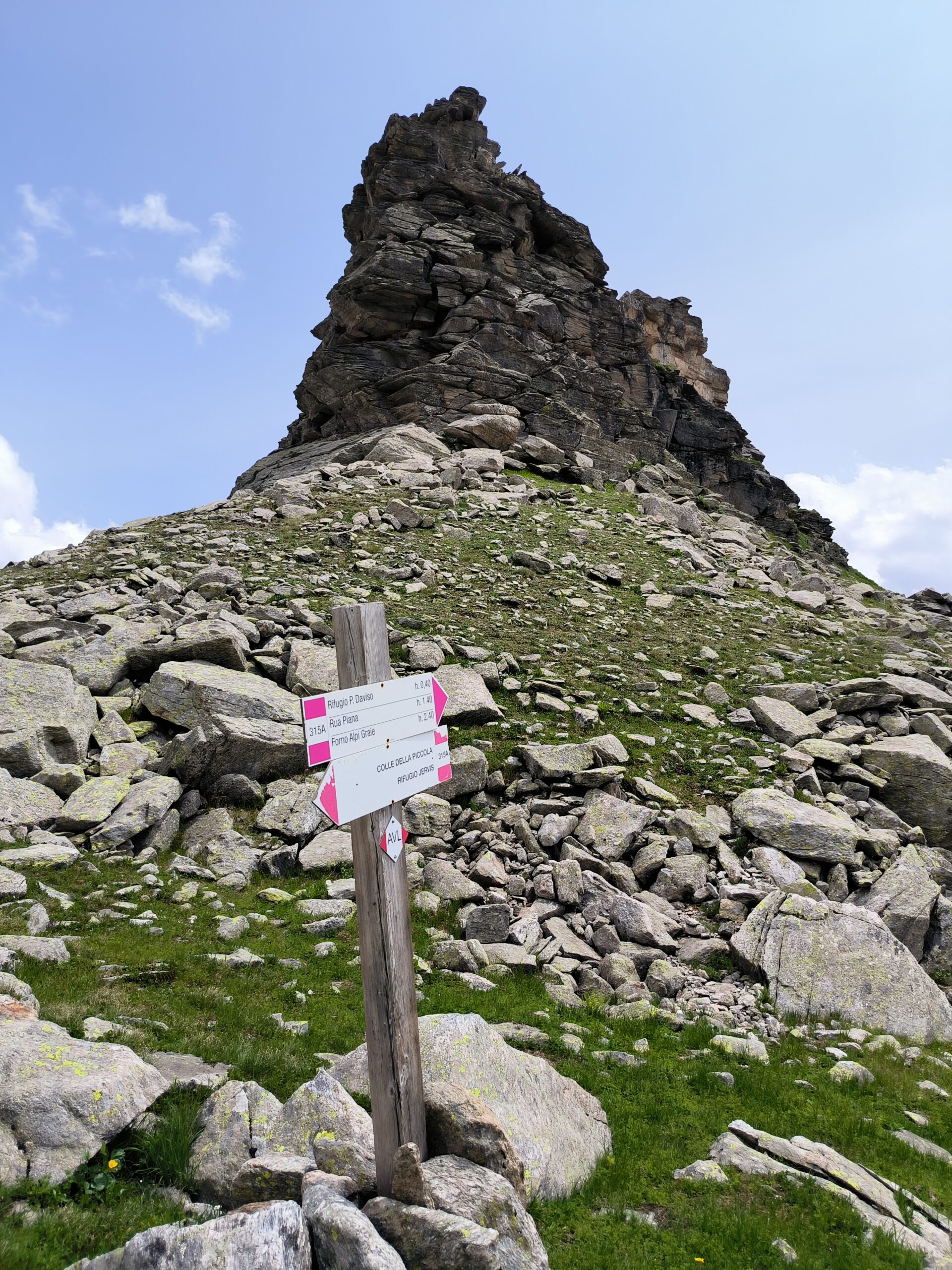 Da Forno Alpi Graie, al fondo del paese si prende a destra la mulattiera lastricata che costeggia il torrente sulla sx idrografica, si incontrano il bivio per il Sentiero Balcone che porta al Gias Travet (1259m), la palestra d’arrampicata del Gabi e il Gias Gabi (1300m). Ora il sentiero inizia decisamente a salire, si incontra la palestra d’arrampicata “La California” (1551m) e la si aggira ad ovest e si raggiunge il Gias Colombin (1670m). Si prosegue sul sentiero che via via si fa meno visibile incrociando il bivio per il col di Fea (1872m).