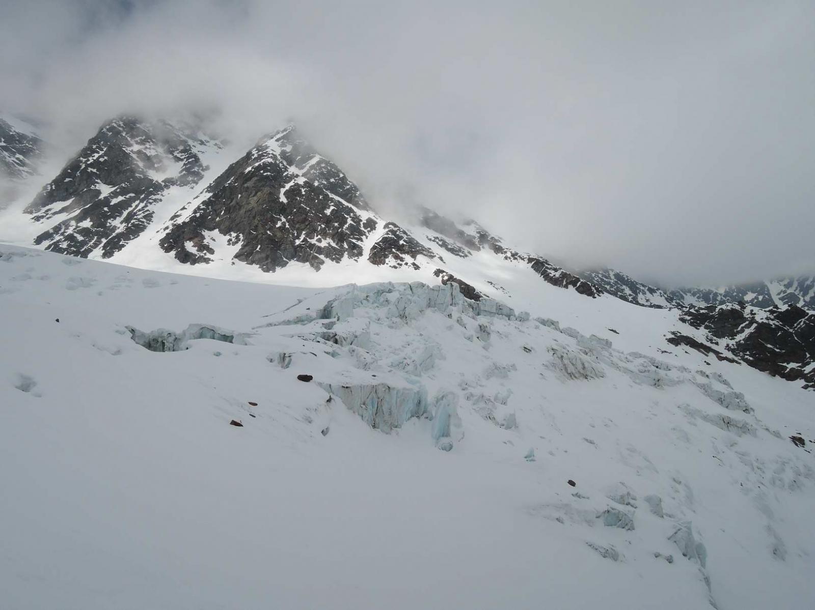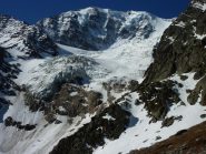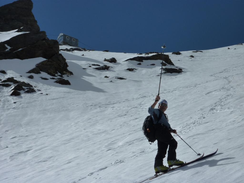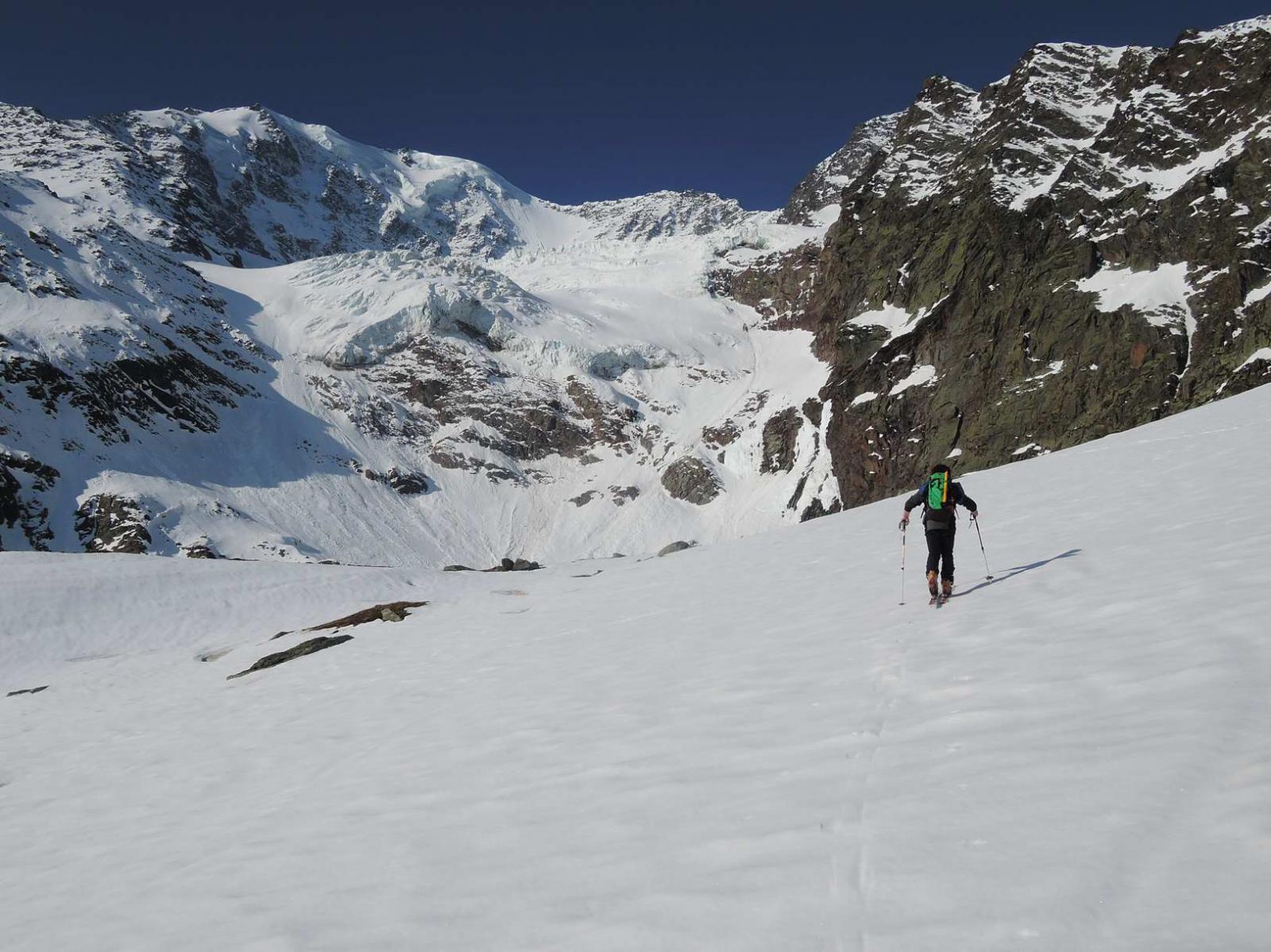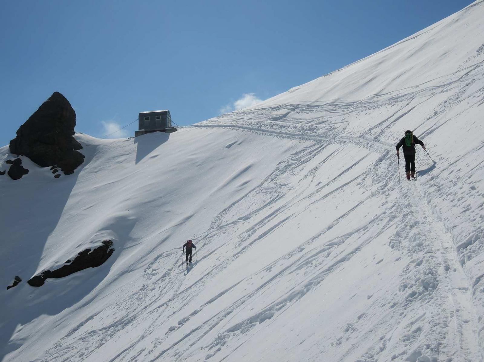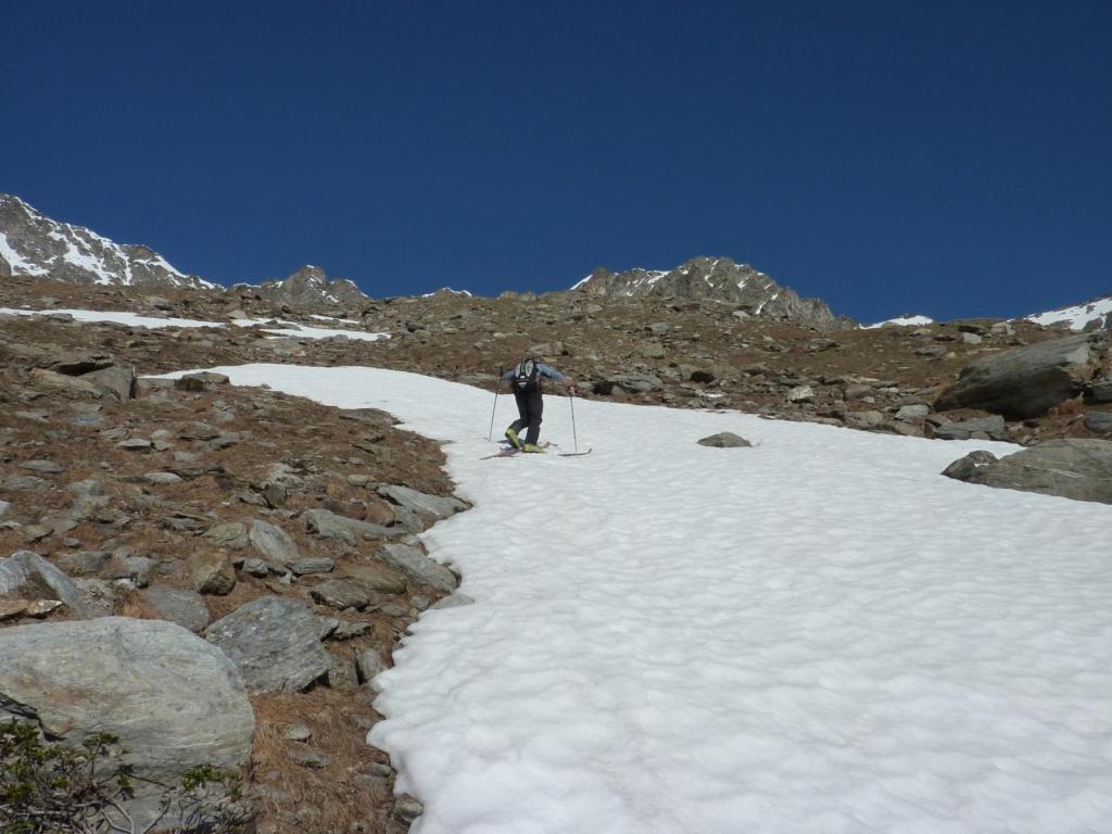 Si risale poi l’ampia morena (Griesserna) che dava sbocco all’impressionante ghiacciaio (ora in ritirata )che scende dalla Nord del Fletschorn e si rimonta il ghiacciaio che si fa via via piu’ ripido e , tenedosi sulla sinistra si esce dalla sella a quota 3015 dove e’ situato il bivacco