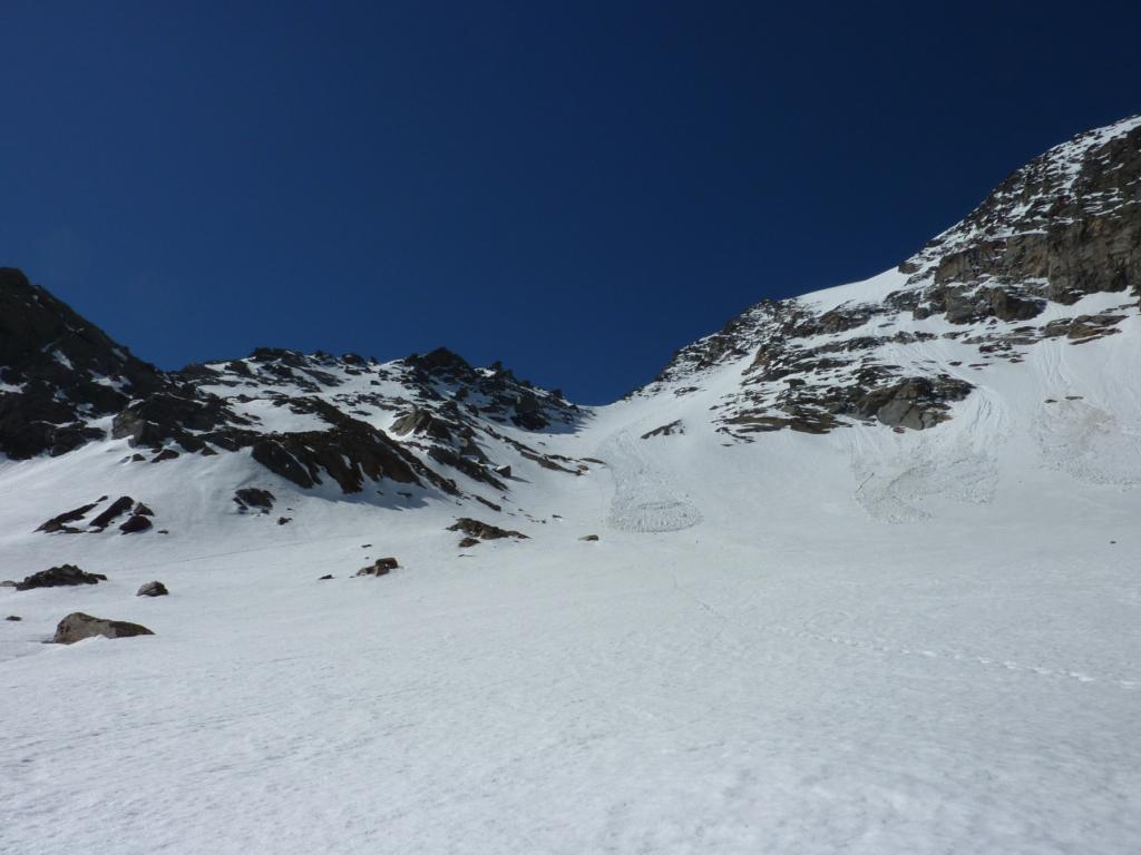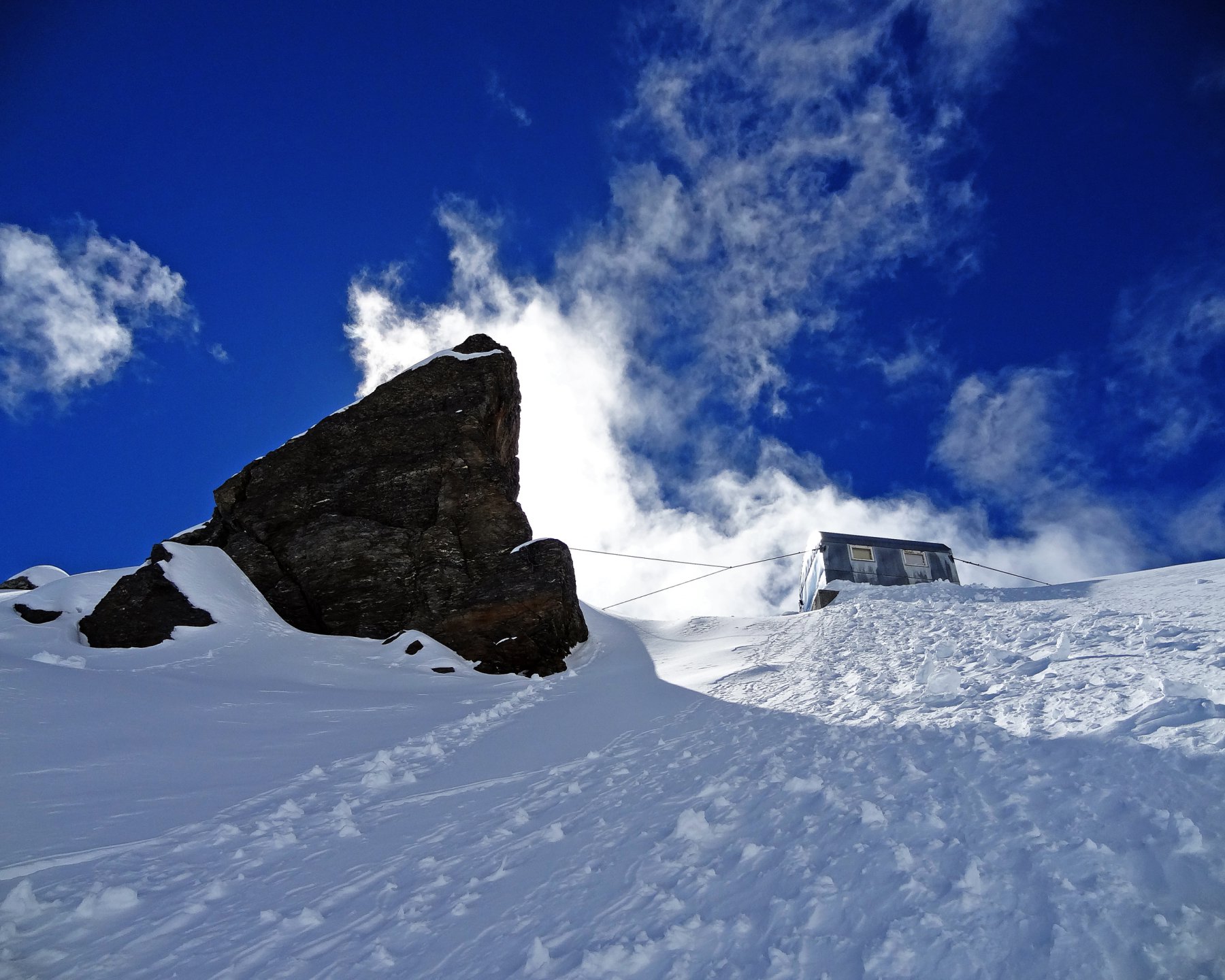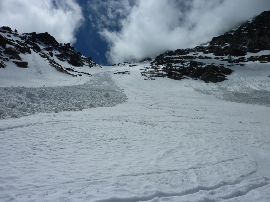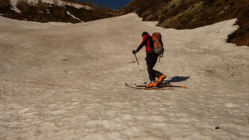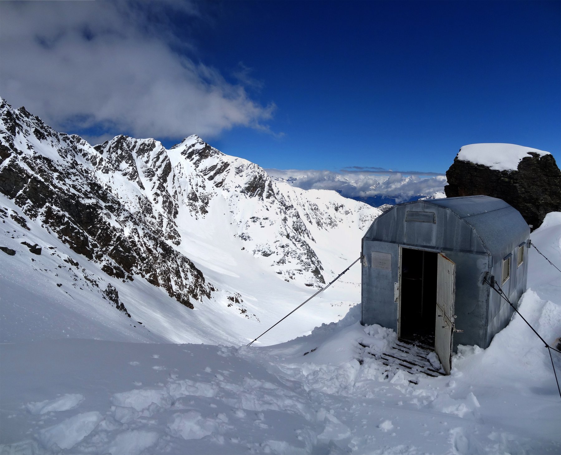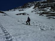 Si risale poi l’ampia morena (Griesserna) che dava sbocco all’impressionante ghiacciaio (ora in ritirata )che scende dalla Nord del Fletschorn e si rimonta il ghiacciaio che si fa via via piu’ ripido e , tenedosi sulla sinistra si esce dalla sella a quota 3015 dove e’ situato il bivacco