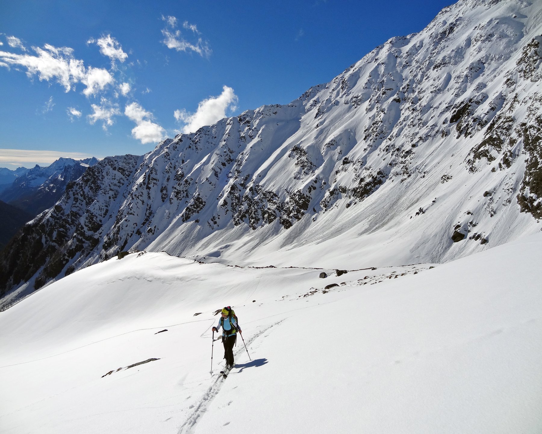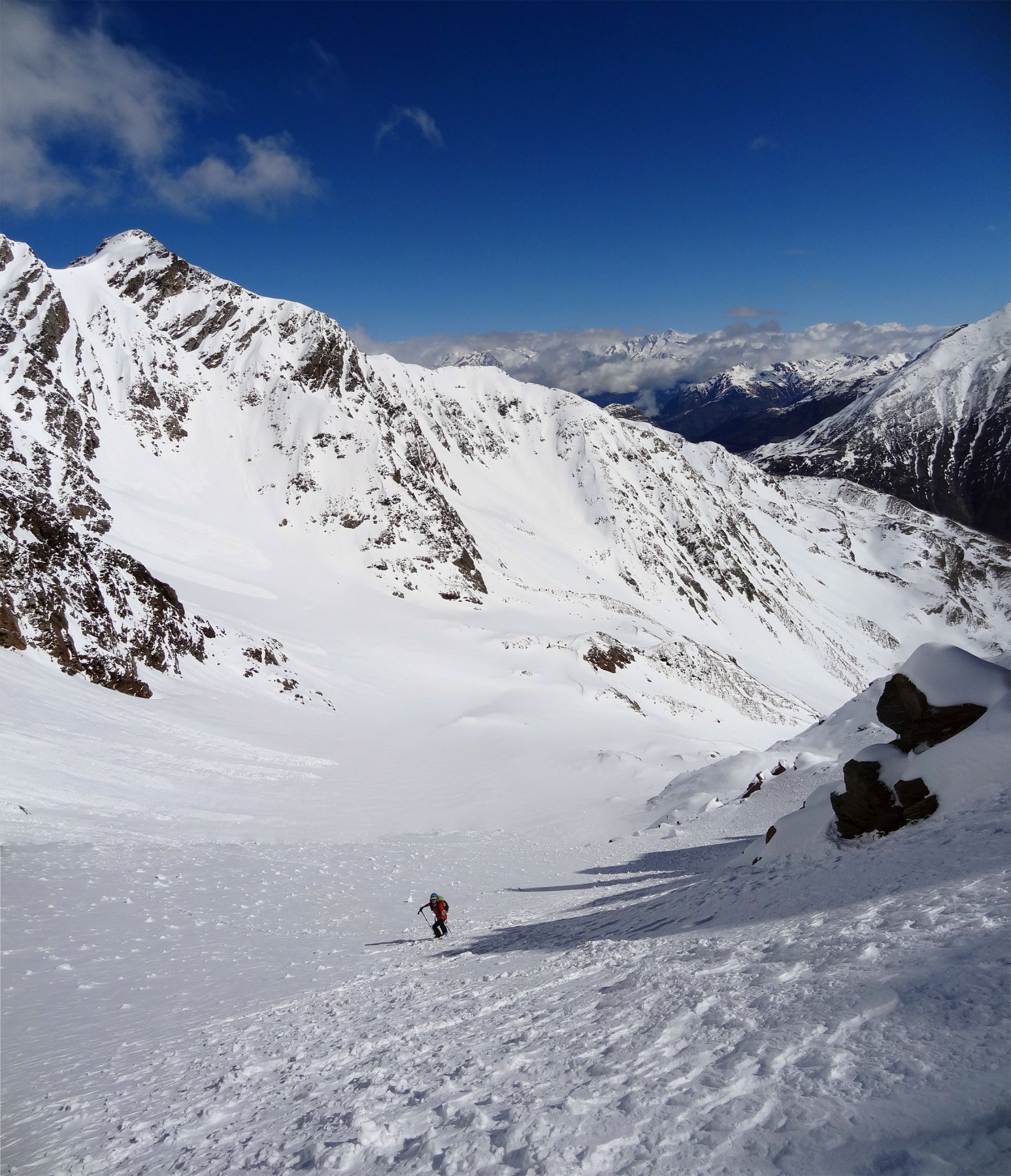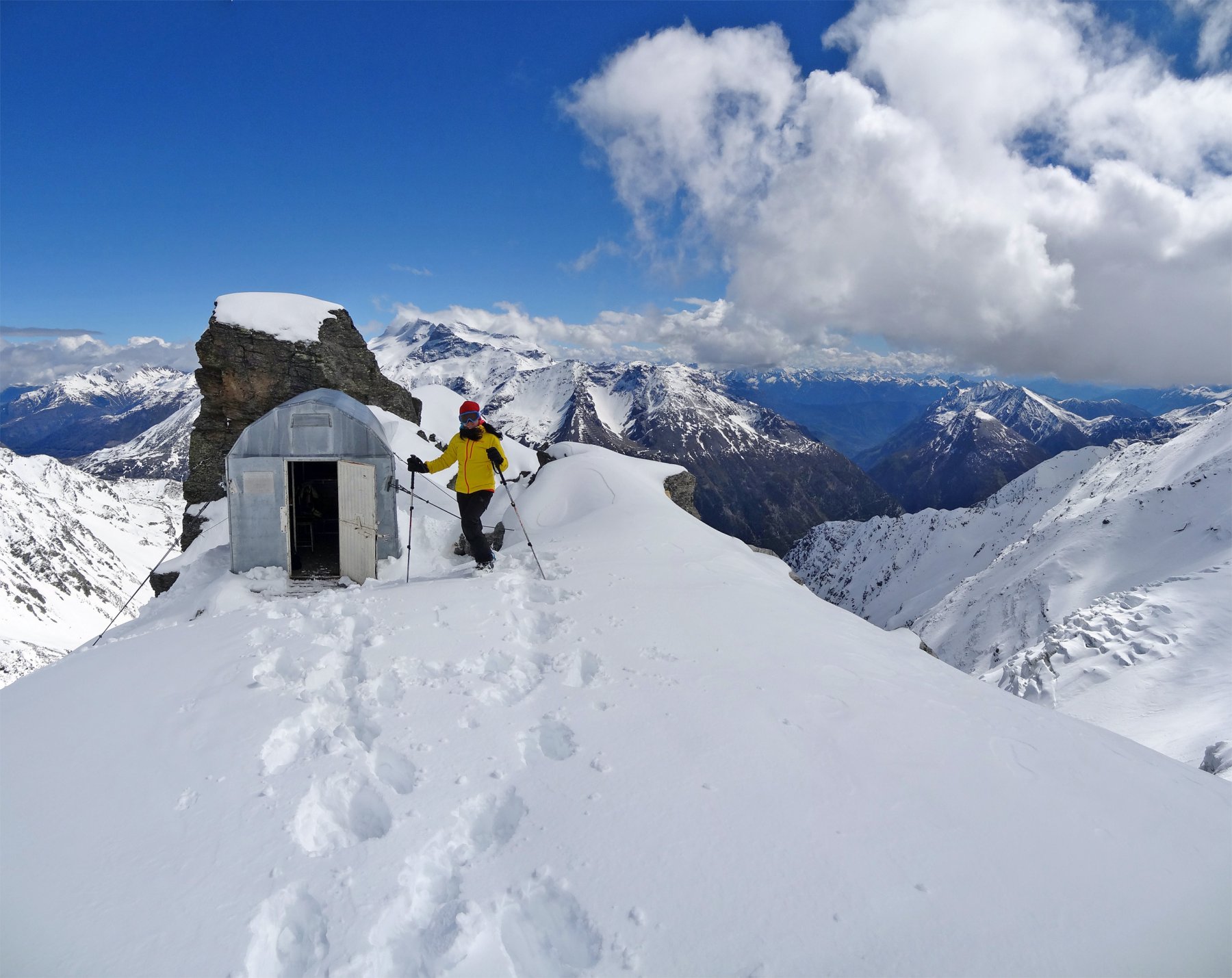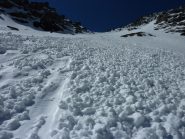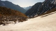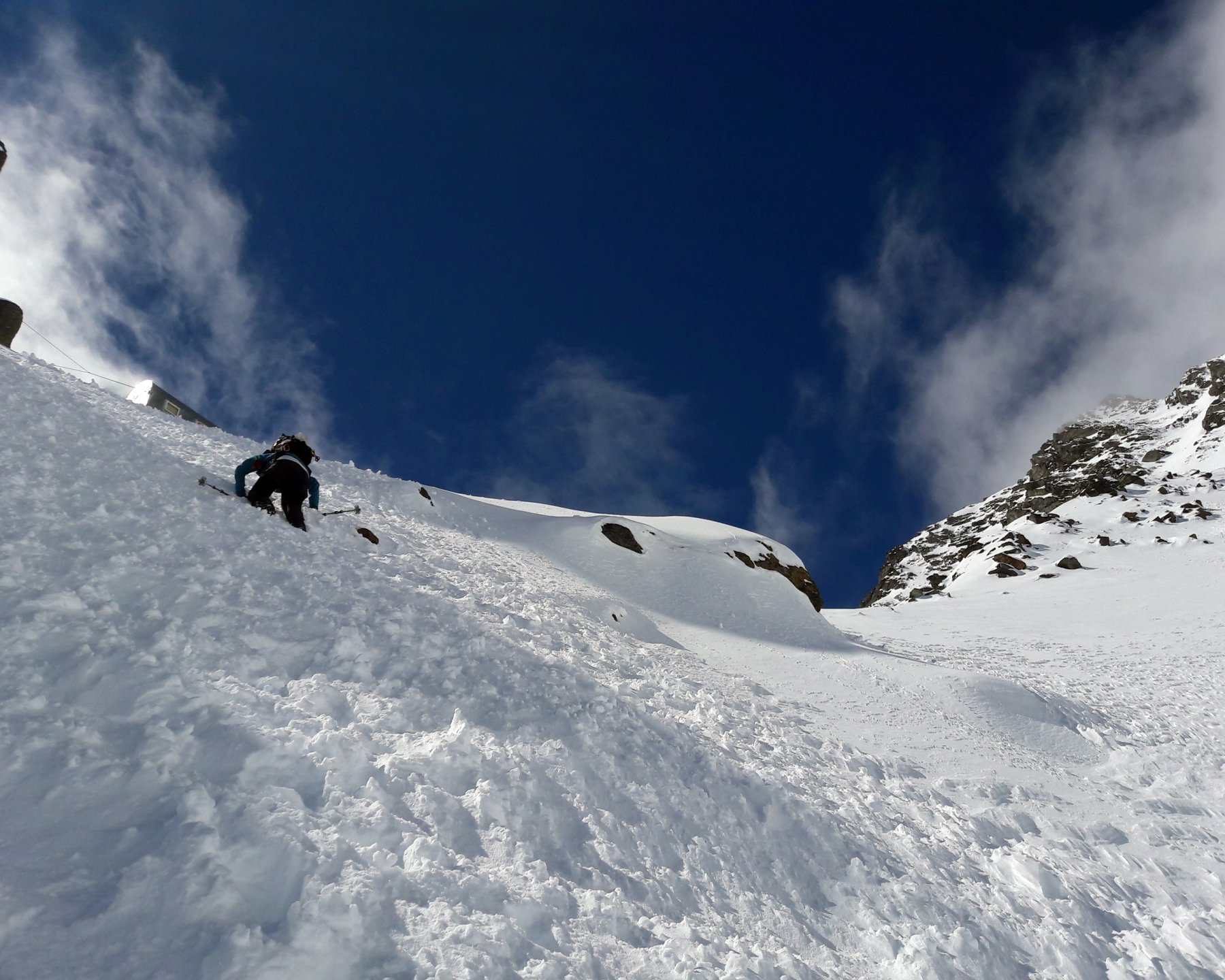 Si risale poi l’ampia morena (Griesserna) che dava sbocco all’impressionante ghiacciaio (ora in ritirata )che scende dalla Nord del Fletschorn e si rimonta il ghiacciaio che si fa via via piu’ ripido e , tenedosi sulla sinistra si esce dalla sella a quota 3015 dove e’ situato il bivacco