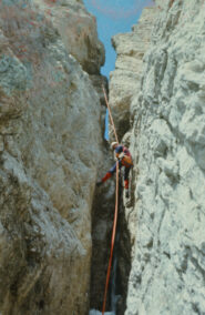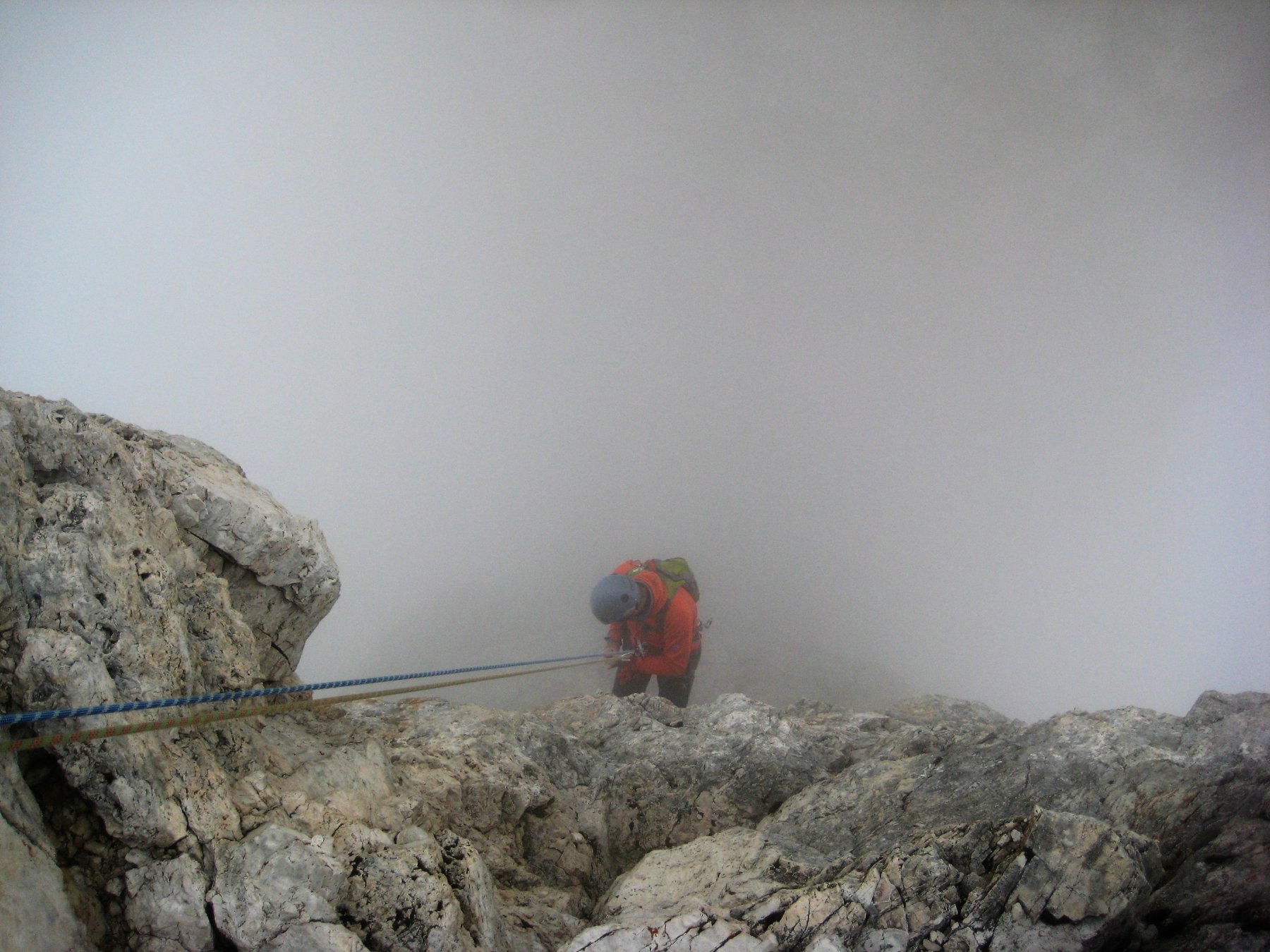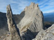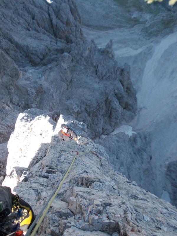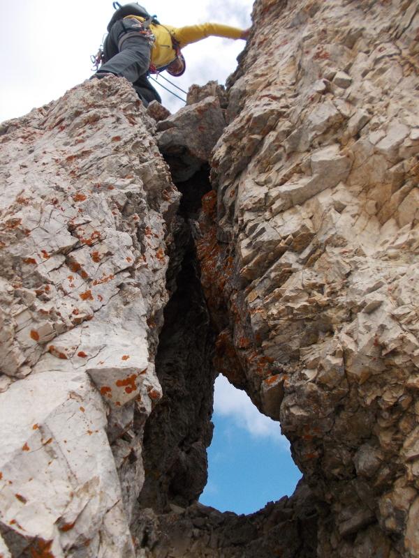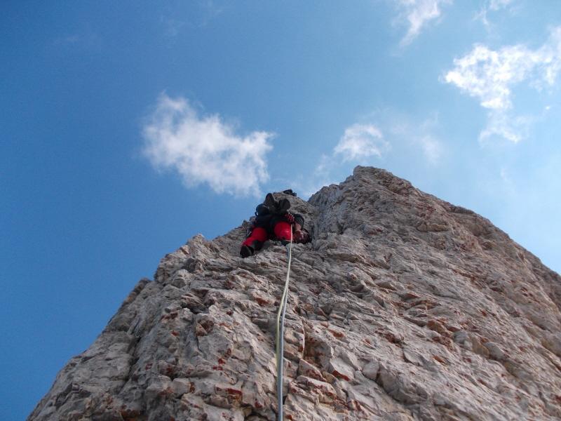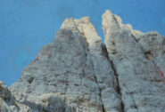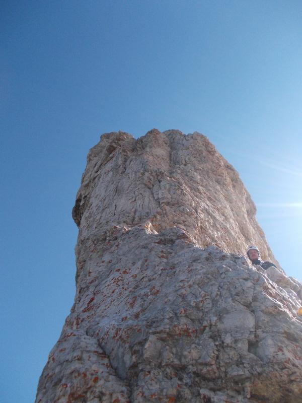 Discesa:dalla vetta proseguire in cresta 5 m. a destra (est) una serie di chiodi segna l’inizio delle corde doppie verso la Torre Stabeler e verso il basso.