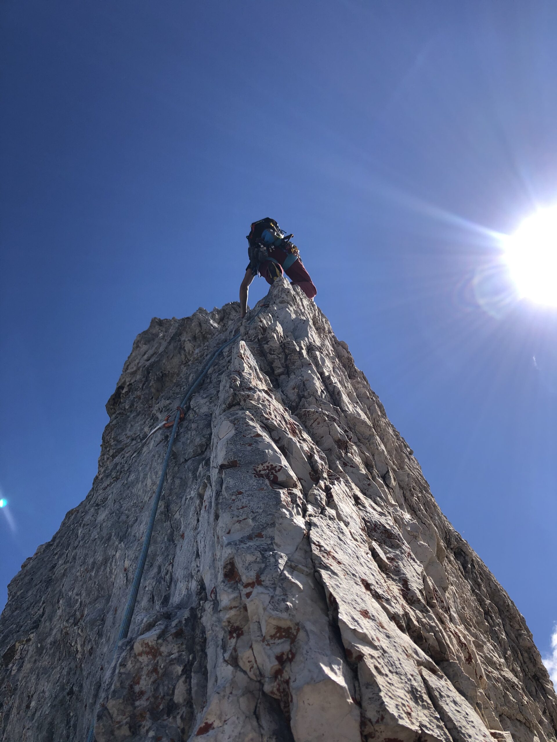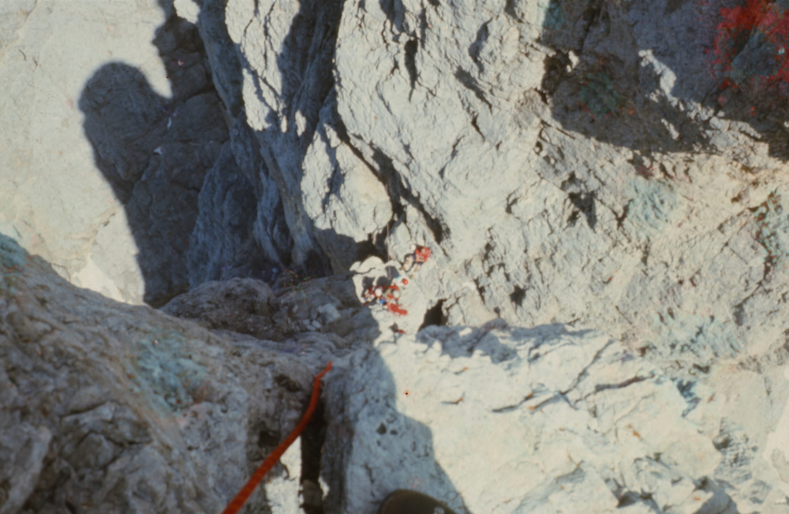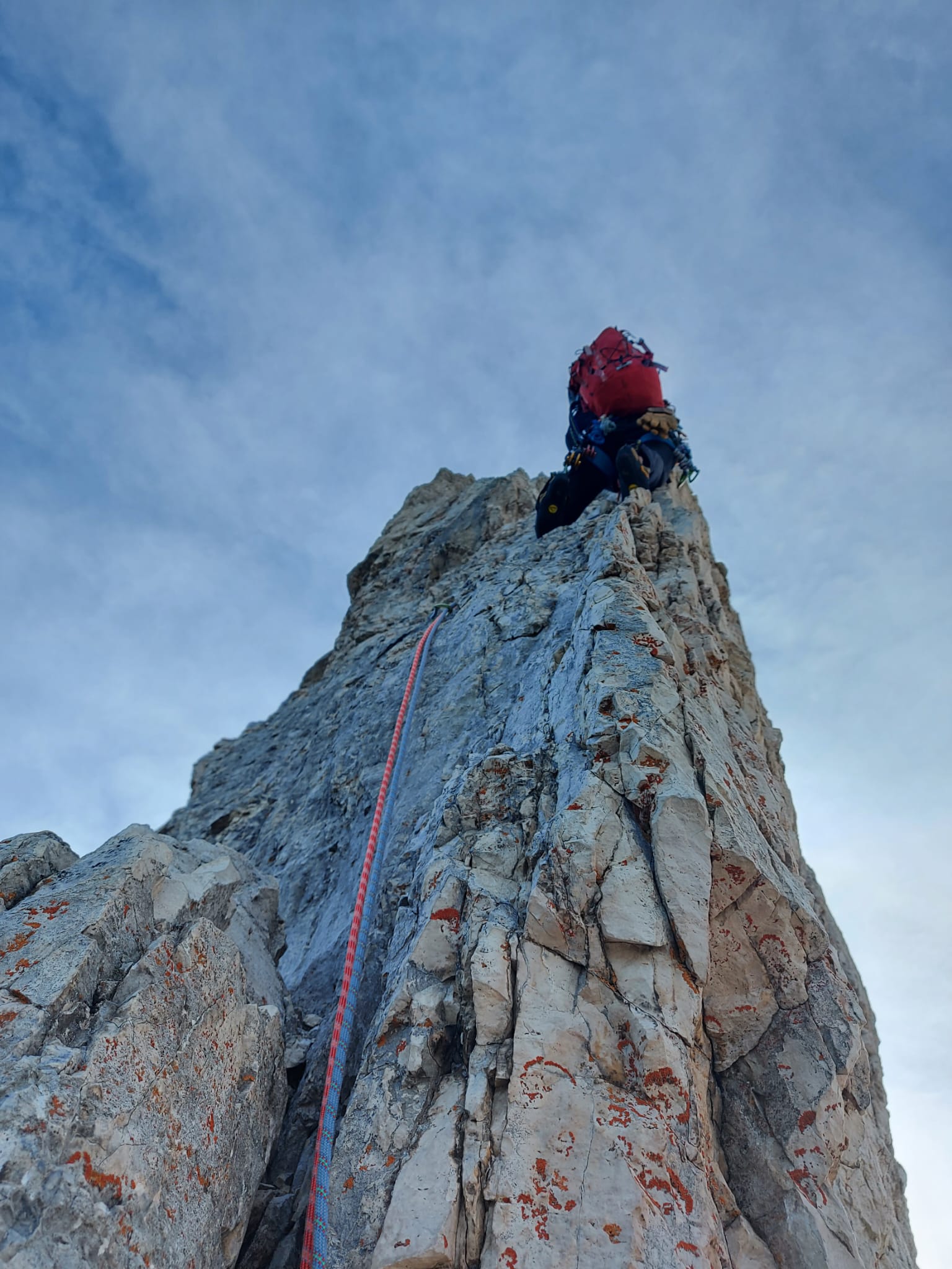 Discesa:dalla vetta proseguire in cresta 5 m. a destra (est) una serie di chiodi segna l’inizio delle corde doppie verso la Torre Stabeler e verso il basso.