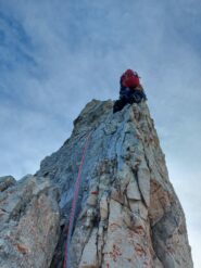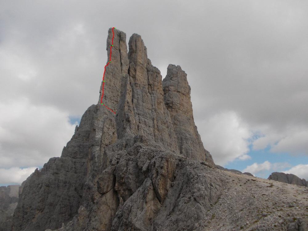 Giunti alla base dello spigolo, salire qualche metro traversando leggermente a destra ad un chiodo visibile.Superare un duro passaggio e portarsi sullo spigolo(40m.,4°).Seguirlo per 50m.(4°).Terrazzini per recuperi intermedi.Scalare una lama liscia(4°) e seguire altri 40 m. il filo con opportuni spostamenti, in estrema esposizione(3°/4°).Con altri 40 m.(3°/4°-)si arriva in vetta.