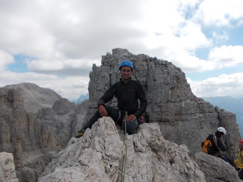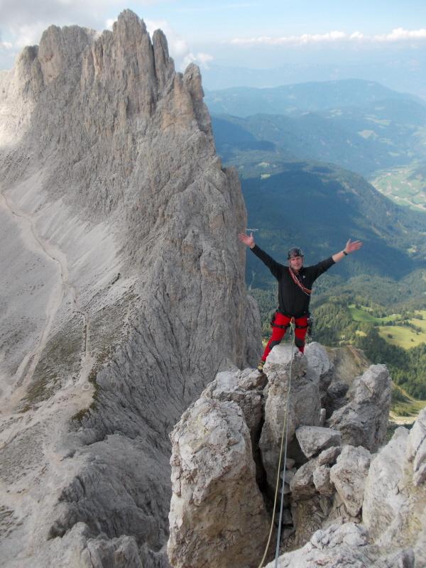 La sera abbiamo dormito all’accogliente rif. Re Alberto. Al mattino, all’attacco della via, il mio socio è completamente indisposto per la scalata. Provo a chiedere alle altre cordate davanti, ma non ‘desiderano’ un terzo con loro. Per mia fortuna, un tedesco poco sotto ha lo stesso mio problema, il compagno che non vuole salire. Dopo la mia domanda ‘climb with me?’ si parte, e dopo 4 tiri siamo in vetta nonostante le difficoltà a capirci. Siamo saliti a tiri alterni e a me sono toccati i tiri pari; il secondo tiro è stupendo, sul filo dello spigolo con un vuoto impressionante a sinistra; in questo punto una cordata è tornata indietro. Dalla vetta con due calate giuste da 50 mt si arriva alla base. Soste nuove a resinati e qualche chiodo sui tiri; utili alcuni friend e cordini per clessidre. Ottima scalata breve su una delle più belle cime delle dolomiti. Un saluto a Martin, il tedesco che ha condiviso con me la salita……