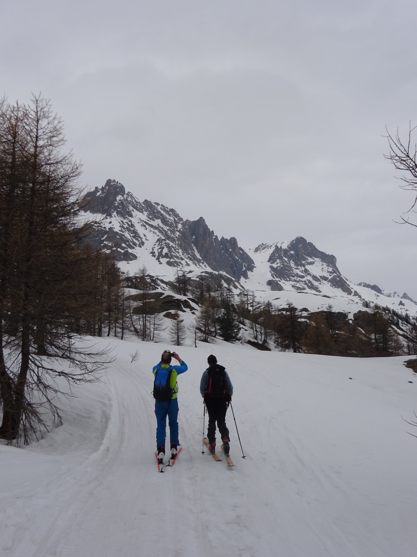 Con strada aperta da Fontcouverte in prossimità dell’Auberge (ampio parcheggio a destra appena superato il ponticello). Attraversato il ponte in prossimità dell’Auberge de la Fruitiere si sale a sinistra oltrepassando la sbarra del camping (cartello indicatore Refuge du Chardonnet) imboccando il sentiero estivo nel lariceto che tocca un bel pianoro con baite, e poi si sposta verso destra raggiungendo il corso del torrente, e quindi si perviene alla conca sotto il Refuge du Chardonnet 2223 m (che non si raggiunge ma si lascia a sinistra in alto). Dalla conca appare di fronte il bellissimo vallone con al centro il Col du Raisin, e a sinistra il Pic Ombiere. A destra invece i pendii soleggiati che conducono alla Pointe du Demi.