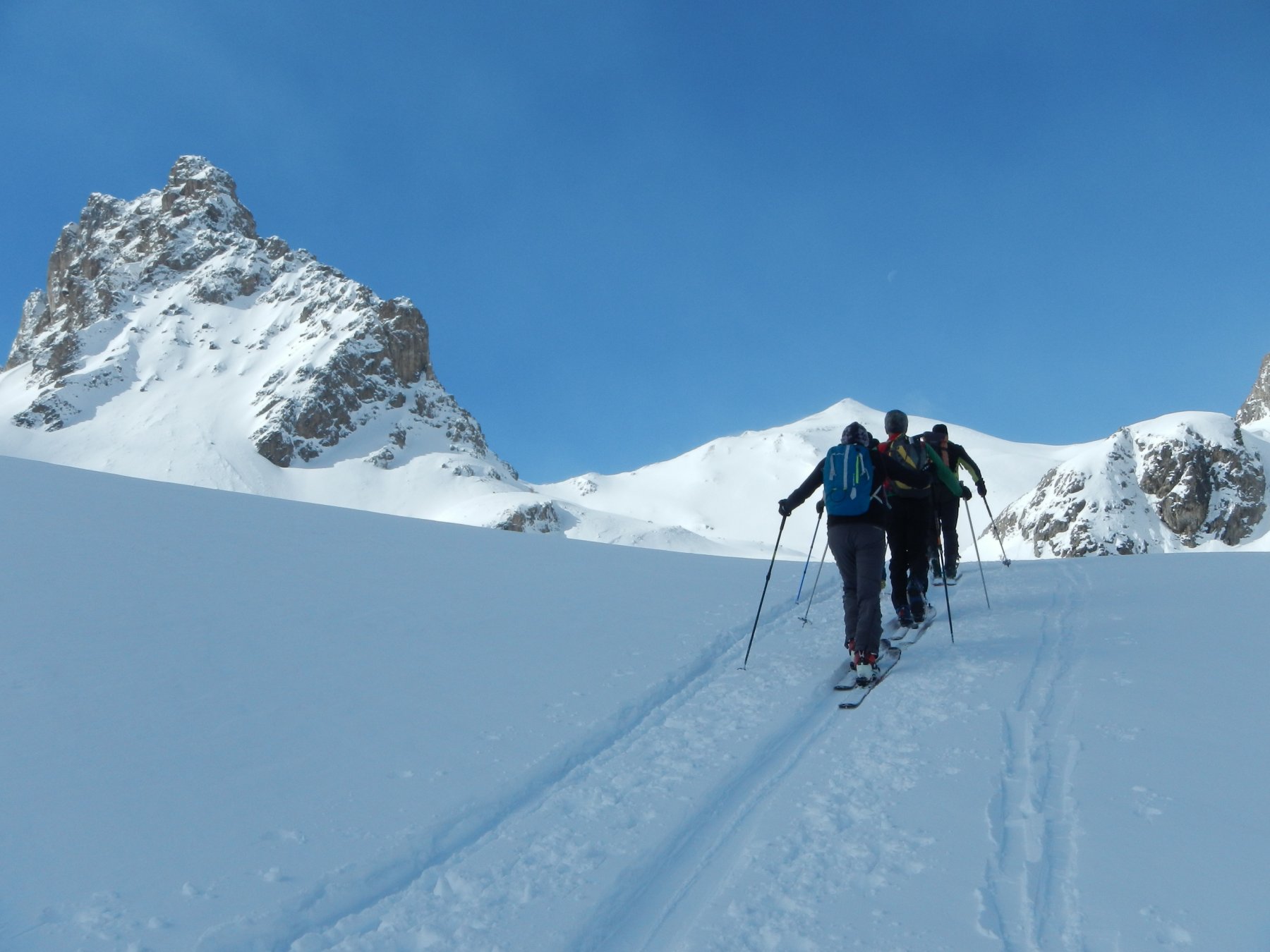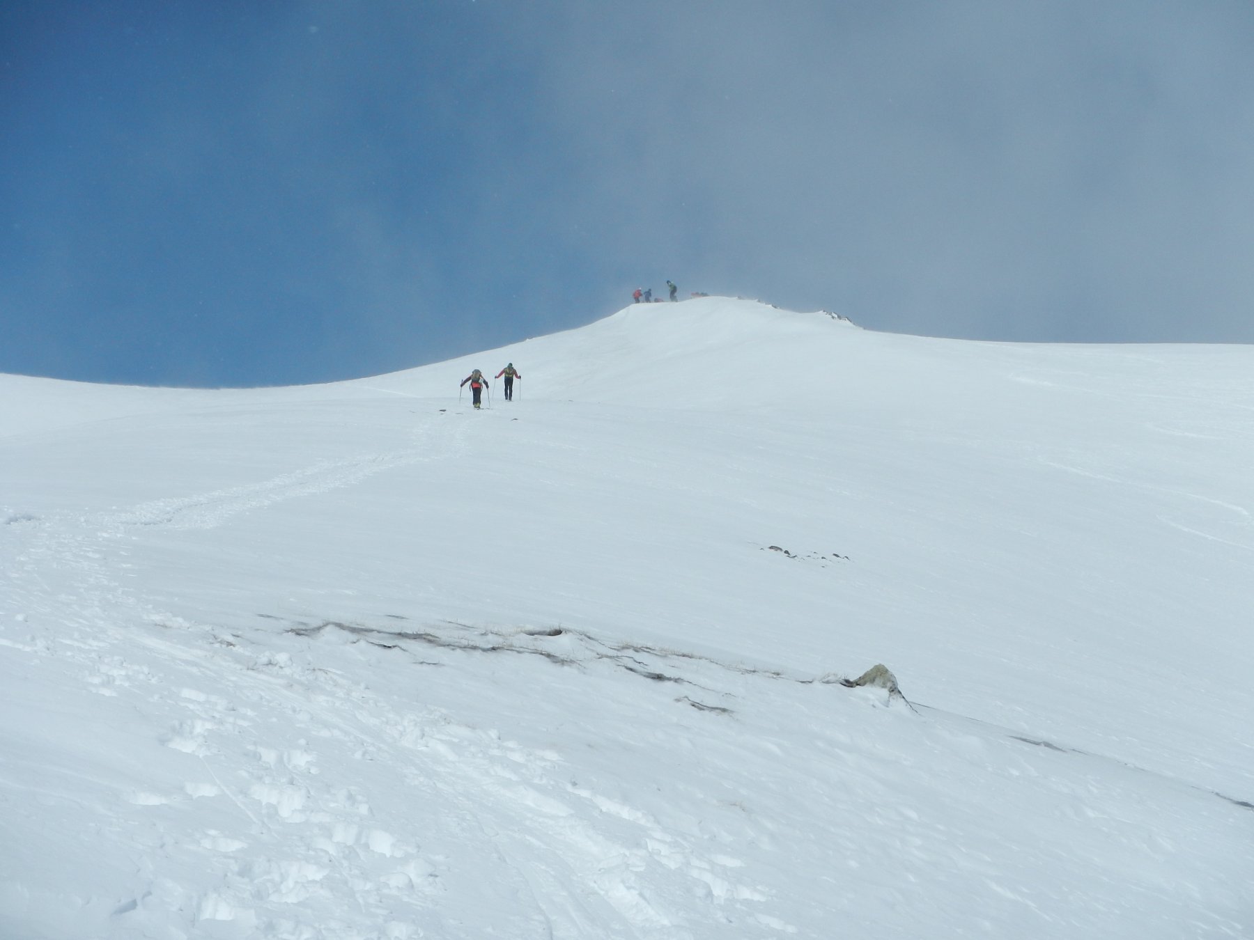 Si attraversa il pianoro andando a imboccare un avvallamento sulla destra, che rappresenta il punto di ingresso alla parte alta del vallone. Si risale per un breve tratto sul fondo dell’avvallamento (sotto scorre il torrente) per poi spostarsi verso destra per facili pendii intervallati da brevi falsopiani, sino a raggiungere una piccola conca a 2550 m, proprio dinanzi al pendio E/NE proveniente dalla cima. Qui si può decidere se salire il pendio al centro (percorso più ripido), oppure più facilmente salire una poco marcata dorsale a sinistra, di pendenza un po’ meno marcata. La dorsale a metà presenta un minuscolo ripiano, prima dell’impennata per accedere alla dorsale Est. Da qui verso destra, con un ultimo facile strappo, si giunge in cima (ometto di pietre).