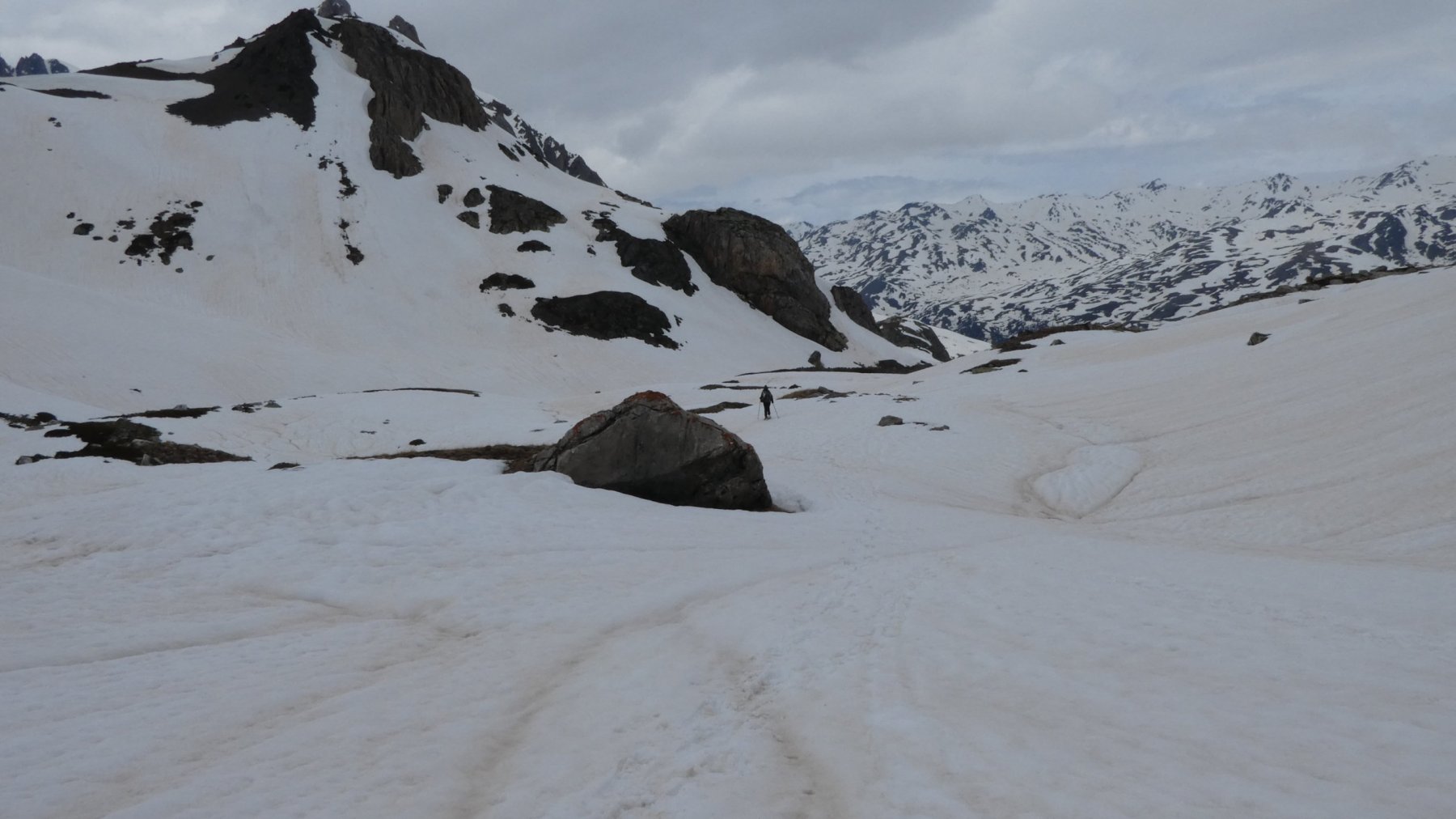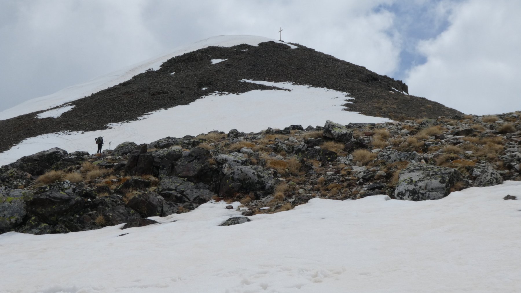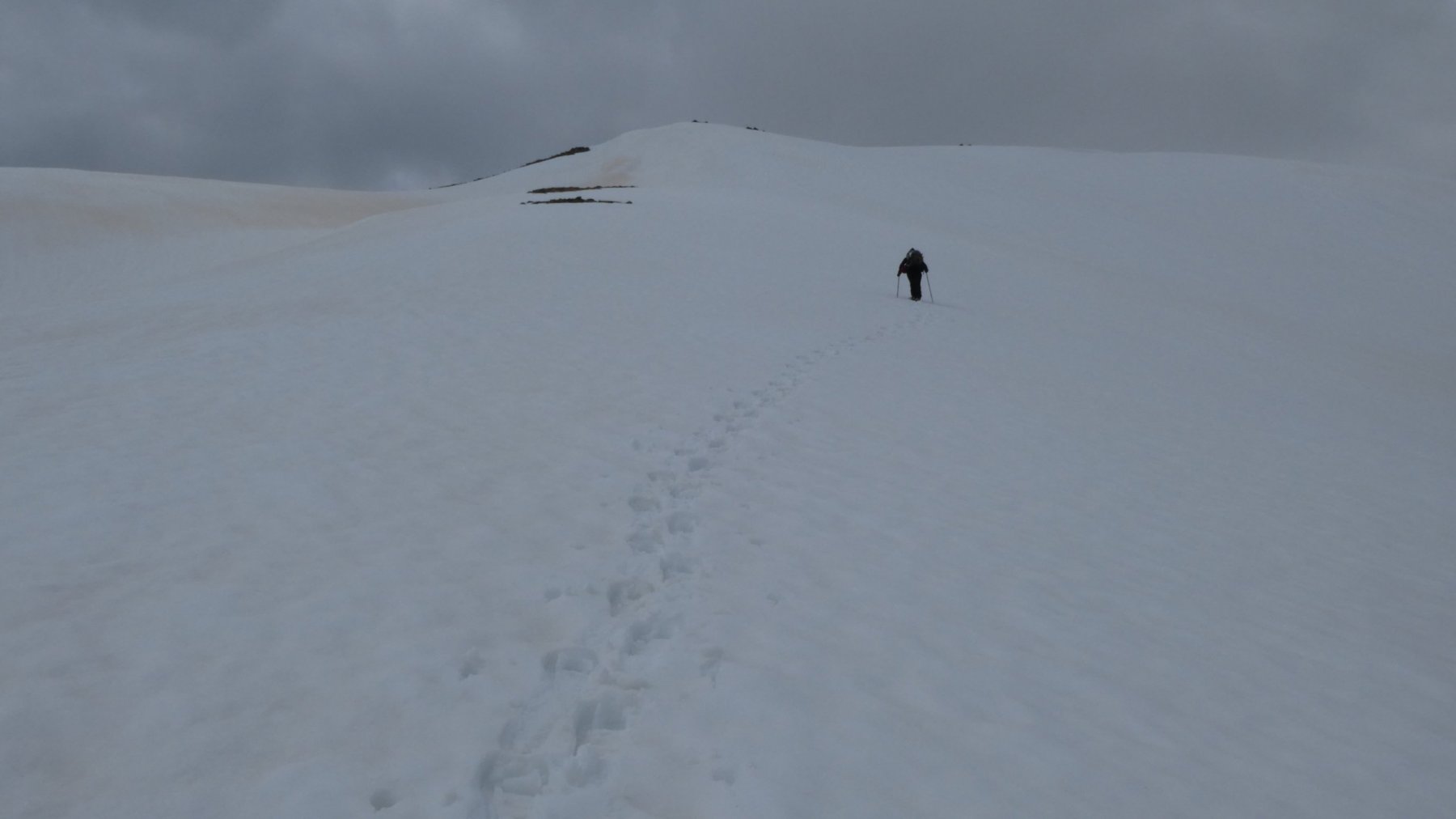 Si attraversa il pianoro andando a imboccare un avvallamento sulla destra, che rappresenta il punto di ingresso alla parte alta del vallone. Si risale per un breve tratto sul fondo dell’avvallamento (sotto scorre il torrente) per poi spostarsi verso destra per facili pendii intervallati da brevi falsopiani, sino a raggiungere una piccola conca a 2550 m, proprio dinanzi al pendio E/NE proveniente dalla cima. Qui si può decidere se salire il pendio al centro (percorso più ripido) eventualmente calzando i ramponi, oppure più facilmente salire una poco marcata dorsale a sinistra, di pendenza un po’ meno marcata e con possibilità di compiere serpentine. La dorsale a metà presenta un minuscolo ripiano, prima dell’impennata per accedere alla dorsale Est. Qui si può valutare se continuare verso sinistra con un tratto di traverso (scomodo con le racchette) oppure se proseguire per la massima pendenza (ramponi) sino a scollinare alla piatta dorsale nevosa. Da qui verso destra, con un ultimo facile strappo, si giunge in cima (ometto di pietre).