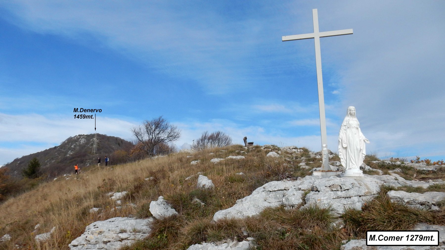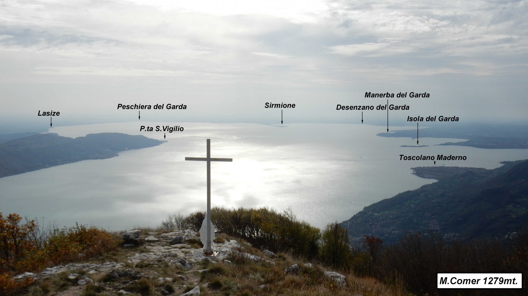 A Gargnano si sale tra le case del paese, subito dopo attraversata la strada statale Gardesana in vicinanza delle scuole elementari sulla strada che sale verso Musaga prendere le indicazioni 37 Musaga S.Valentino che sale la mulattiera tra le limonaie di Quarcina. Il sentiero sale abbastanza ripido e dopo vari attraversamenti della strada asfaltata si arriva a Musaga 454mt. e poco dopo a il bel paese di Sasso 546mt. Dal paese di Sasso si prende il sentiero 31 per il M.Comer che passa inizialmente tra culture di olivi entrando poi con pendenze più accentuate nei boschi soprastanti portandosi verso l’eremo di S.Valentino. Dall’eremo si sale per il breve e facile ma ripido tratto attrezzato che sbuca su un caratteristico torrione calcareo panoramico denominato il Pulpito dove continuando sempre nei boschi sul sentiero 31 si arriva senza problemi alla panoramica cima del M.Comer contraddistinta da una croce con madonna. Proseguendo dalla cima ci sia abbassa di pochi metri entrando di nuovo nel bosco intercettando il sentiero 32 che porta con un’ultimo sforzo passando sotto un’enorme traliccio dell’alta tensione alla cima sud del M.Denervo contraddistinta da una piccola croce metallica, proseguendo ulteriormente passando una vecchia baita e passando enormi faggi monumentali si arriva alla cima nord del M.Denervo1459mt. riconoscibile da un cumulo di pietre. Dalla cima ci si abbassa rapidamente verso Malga Denervo 1373mt. dove si prende il sentiero 35 con indicazione Muslone Piazze che scende inoltrandosi nei boschi portandosi alla Cascina Piazze 1111mt. dove si prende la strada carrale intercettando poco dopo l’indicazione 36 che su ripida strada cementata porta al piccolo paese di Muslone. Dal paese seguendo i segni bianco rossi scendere su tratti di strada e vari tratti di sentiero tra olivi intercettando poi il sentiero 265 che scende traversando senza problemi a Gargnano dove si conclude l’anello.