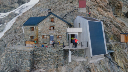 Sotto al Rifugio nell’ultimo tratto di ghiacciaio/nevaio avvicinamento faticoso in mezzo a neve ormai sciolta. Fantastica dotazione del locale in uso quando il rifugio è chiuso: bottiglie di acqua, caffé e latte solubile e qualsiasi tipo di comodità.