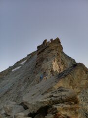 Il giorno dopo siamo partiti intorno alle 5, raggiungendo la vetta poco prima delle 8:30. Salita complessivamente molto facile: si parte con un sentiero a gradoni per raggiungere il primo tratto di ghiacciaio, dove abbiamo messo i ramponi: nessun crepaccio visibile. Si raggiunge nuovamente la roccia, dove conviene togliere i ramponi, arrampicata molto facile. Il secondo tratto nevoso è molto breve, noi abbiamo preferito farlo senza ramponi, ma va valutato. Dopo di che cresta tutta pulita tranne qualche mini pezzetto con neve, evitabile. Fatta tutta in conserva, spit e cordini dove servono, avevamo dei friends ma non li abbiamo minimamente usati. I passaggi di III si contano sulle dita di una mano, aggirando il gendarme.