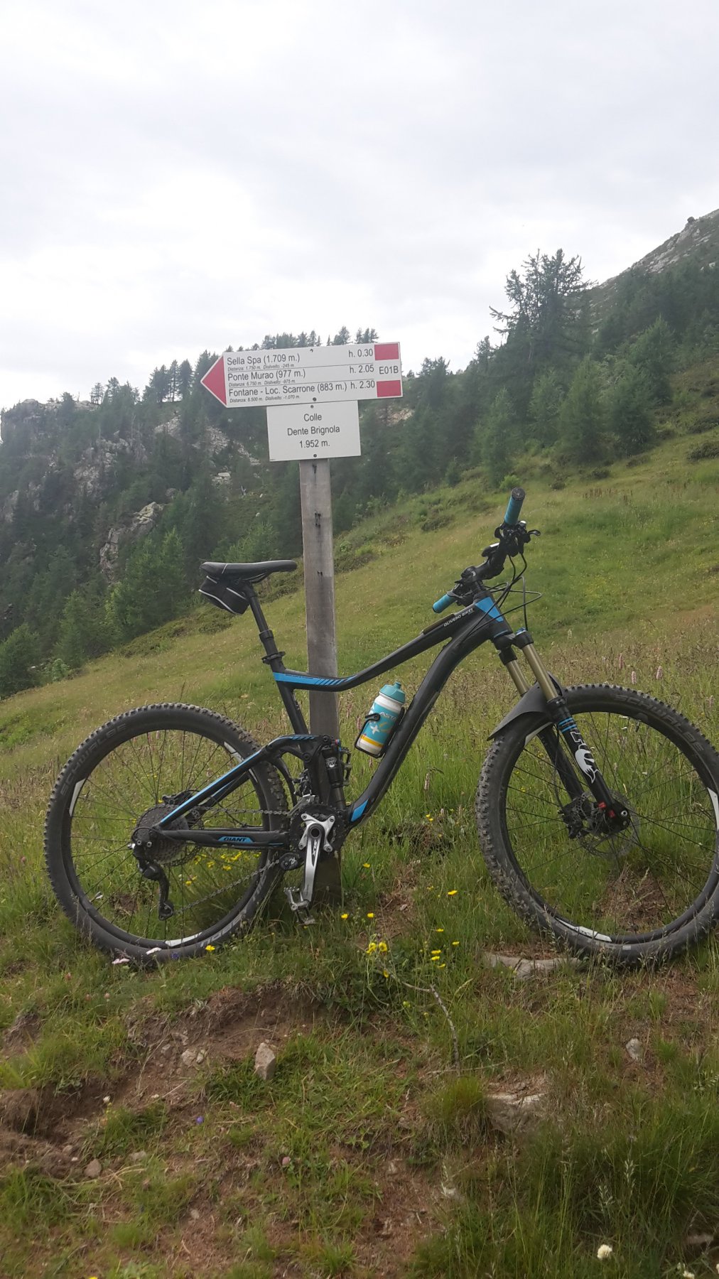 Dal parcheggio (m. 885) si prende l’evidente sterrata che punta verso sud-ovest (segnavia E06).Si pedala su questa sterrata in direzione ovest fino al cosiddetto Ponte Murao, che non si attraversa, proseguendo diritti sulla sterrata (segnavia E01) fino alla Stalla Buorch, dove il tracciato svolta verso sud. Si segue sempre questo tracciato in mezzo ai boschi, sulla destra idrografica del Rio della Crosa, con un fondo accettabile e una pendenza già sensibile. Più avanti la sterrata, sempre evidente, uscendo dal bosco aumenta la pendenza ed il fondo peggiora, rendendo così difficile la pedalata ed obbligando in diversi tratti a scendere e spingere la bici, pur in assenza di ostacoli che fisicamente impediscano la progressione ciclistica. Si arriva così a Sella Piagna (m. 1400), oltre la quale la sterrata compie alcuni tornanti e conduce alla Sella Spa (m. 1658; sentiero E01B), mentre sulla destra si nota l’imponente mole del Monte Fantino (m. 2064). Qui finalmente il fondo migliora, diventando praticamente erboso, e la pendenza scende, cosicché si può pedalare meno difficilmente di prima. Inoltre da qui si comincia a vedere la sommità del colle, dominata da due curiose formazioni rocciose a forma di corna. Ancora alcuni tornanti e si arriva finalmente al Colle Dente Brignola (m. 1952), che costituisce il punto più alto dell’escursione, avendo percorso un dislivello di 1067 m.