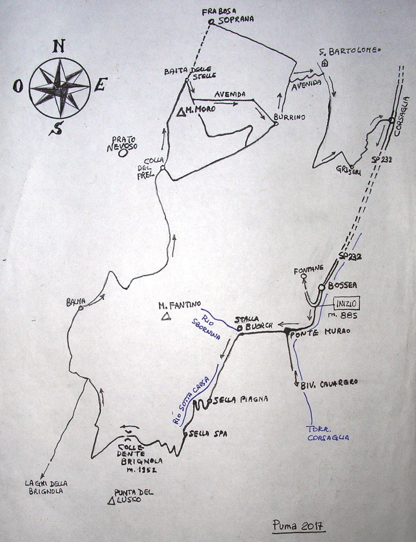 Dalla Baita delle Stelle, tornando indietro per circa 200 m., si prende una sterrata in discesa sulla sinistra (indicazione per Frabosa e Avenida), e la si percorre per un certo tratto fino ad incontrare, sulla sinistra, l’inizio del un single track Avenida (una delle tante piste del bike park di Frabosa Soprana). Lo si prende e lo si segue sino ad incrociare una sterrata inerbita, che svoltando a destra conduce alla località Burrino, dove c’è uno skilift e un bar (se si proseguisse su Avenida, si finirebbe a Frabosa Soprana). Da qui si prosegue in discesa sino ad un incrocio, dove si deve svoltare a sinistra. Si continua su questa sterrata finché si nota, sulla destra, un altro single track, già descritto in un altro dei miei itinerari, che conduce alla Cappella di S. Bartolomeo (m. 1045). Dalla cappella si segue a destra l’asfalto per un breve tratto, lasciando sulla sinistra una costruzione isolata; dopo poche decine di metri, si imbocca un sentiero sulla sinistra (E24) in direzione “Griseri” (palina indicatrice). Il sentiero, in pratica un single track, procede dapprima in discesa nei boschi di faggio e castagni, in un ambiente molto suggestivo; purtroppo, in alcuni punti è rovinato dalla presenza di tronchi d’alberi sradicati e messi di traverso, che obbligano a scendere dalla bici e a portarla a spalla per superare l’intoppo. Anche oltre, in corrispondenza di rigagnoli scendenti dalla montagna, il fondo è irregolare e costringe a manovre poco fluide. In generale, tuttavia, si tratta di un ottimo e piacevole sentiero. Si giunge così ad incrociare il tracciato che dalla località “Seccata” conduce ai Griseri e al pilone del Padre Trona (palina). Si segue questo percorso sempre in discesa fino al pilone, apprezzabile per la presenza di una fonte d’acqua. Dal pilone si diparte sulla destra un sentiero in direzione Corsaglia (palina), ma conviene invece proseguire diritti in direzione Partiaré – SP Val Corsaglia (cartello indicatore). Il sentiero procede in discesa in mezzo ai boschi, sino a sboccare su un tornante asfaltato, dove occorre svoltare a destra e procedere in discesa sino all’abitato di Corsaglia. Da qui ci sarebbe un sentiero (E20) che conduce quasi a Bossea, ma attualmente è franato in diversi punti; non resta quindi che tornare al punto di partenza sulla SP 232,