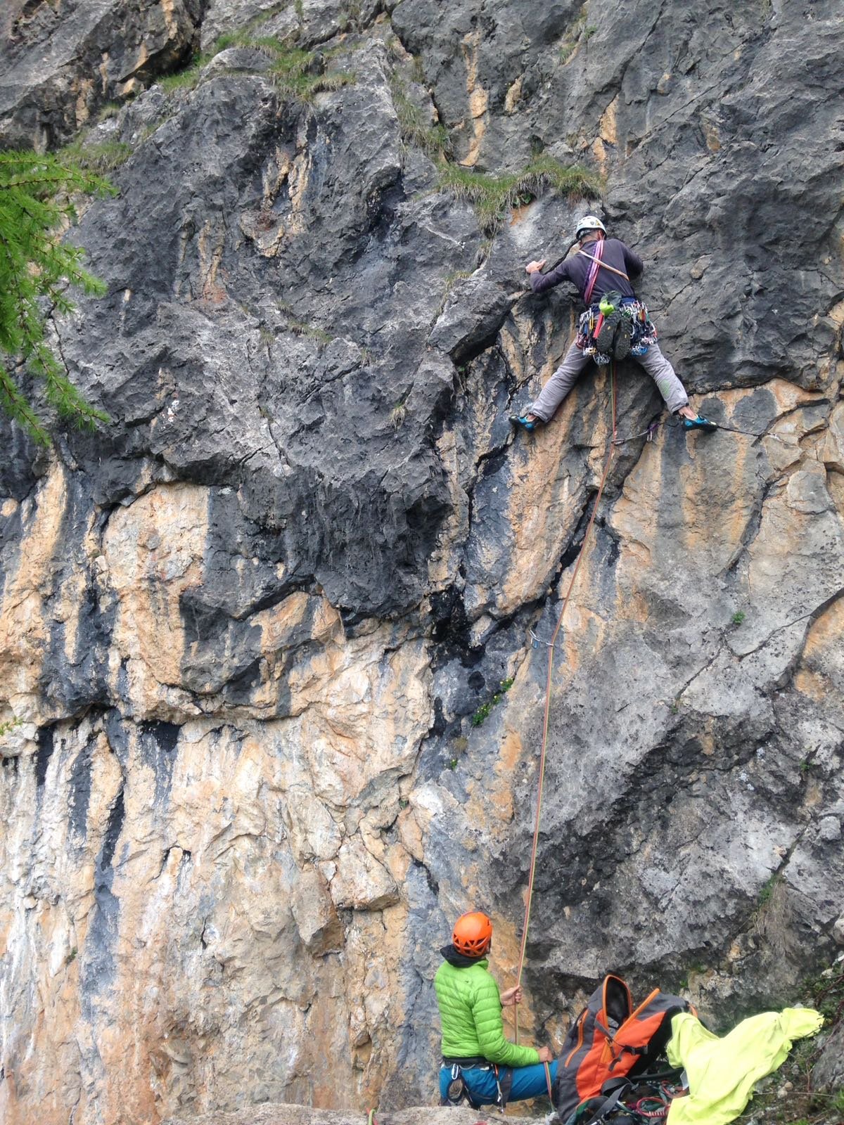 L4: Rientrare nel diedro (V+) puntando alla grande lama strapiombante. Superarla con passo atletico e di decisione (VI, poco proteggibile) e andare a sostare sulla sx al termine del breve diedro canale che segue. 20 mt.