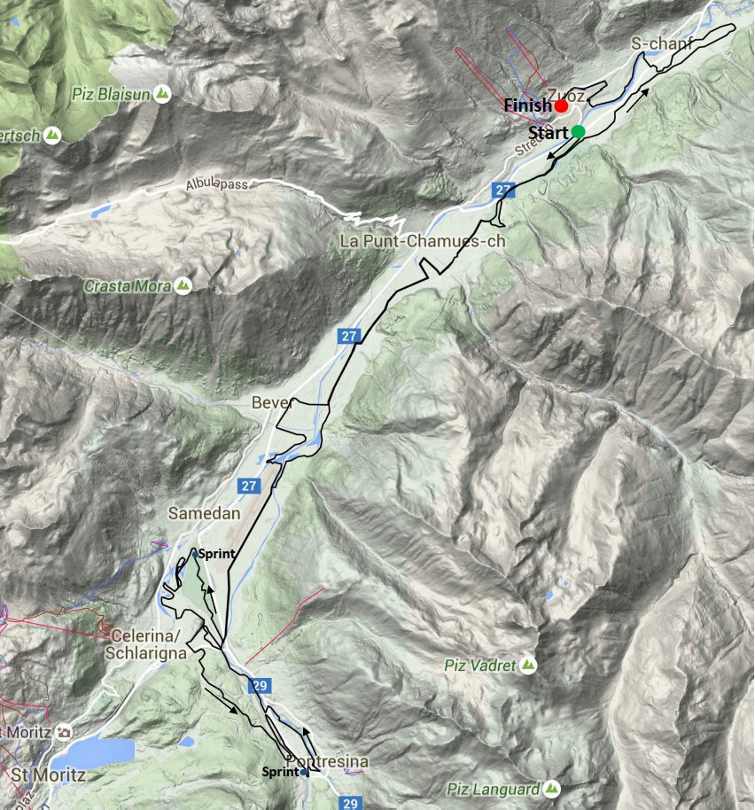 Il tracciato originario prevede la partenza e l’arrivo al villaggio di Zuoz passando per Saint Moritz e Pontresina, per una percorrenza totale di 65Km.