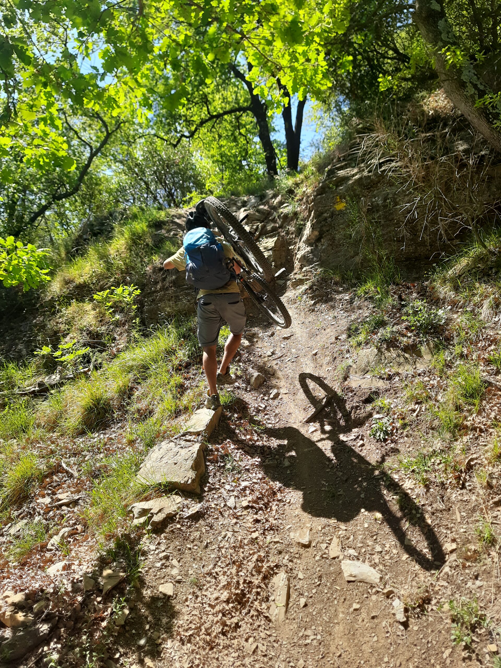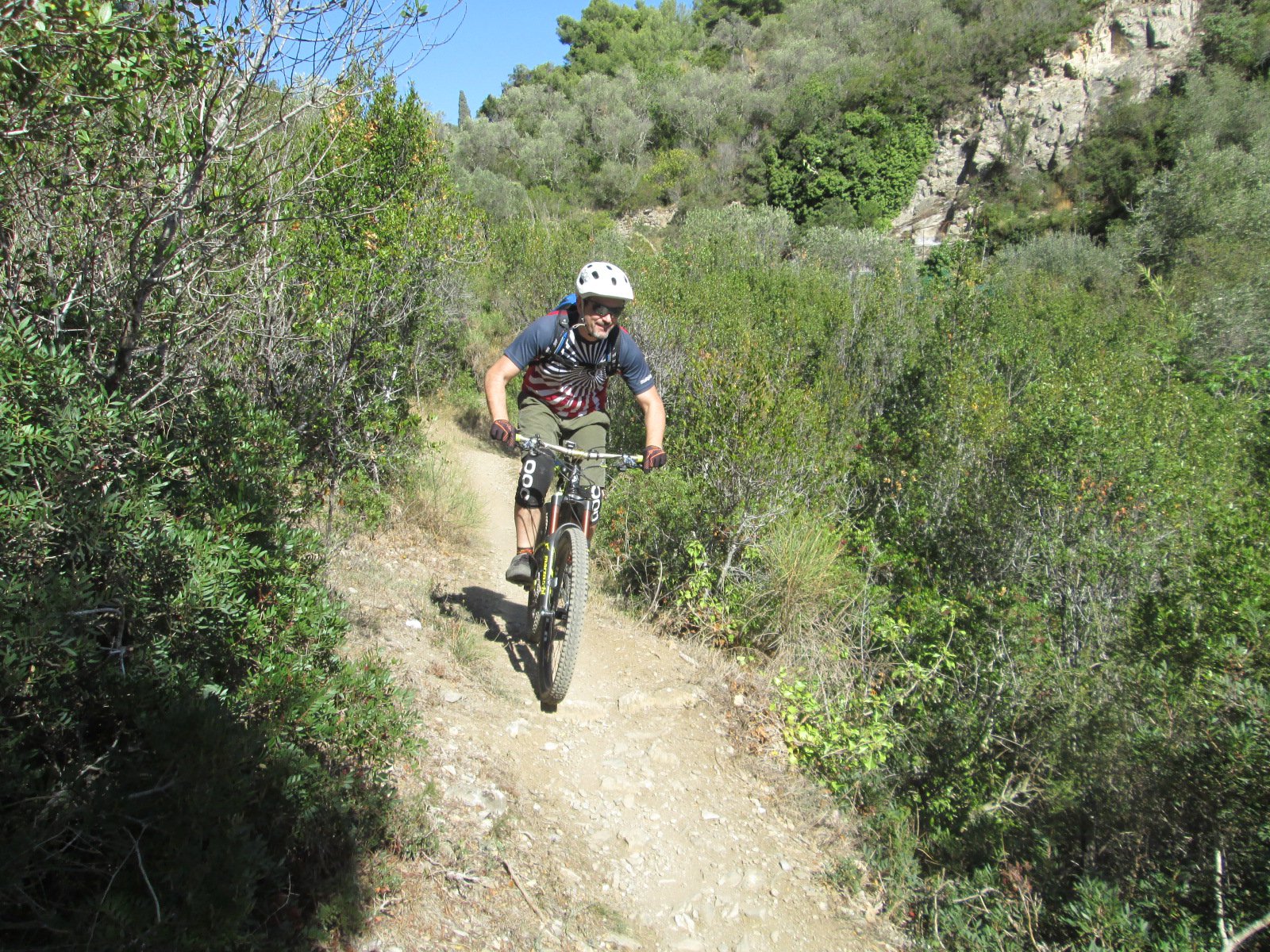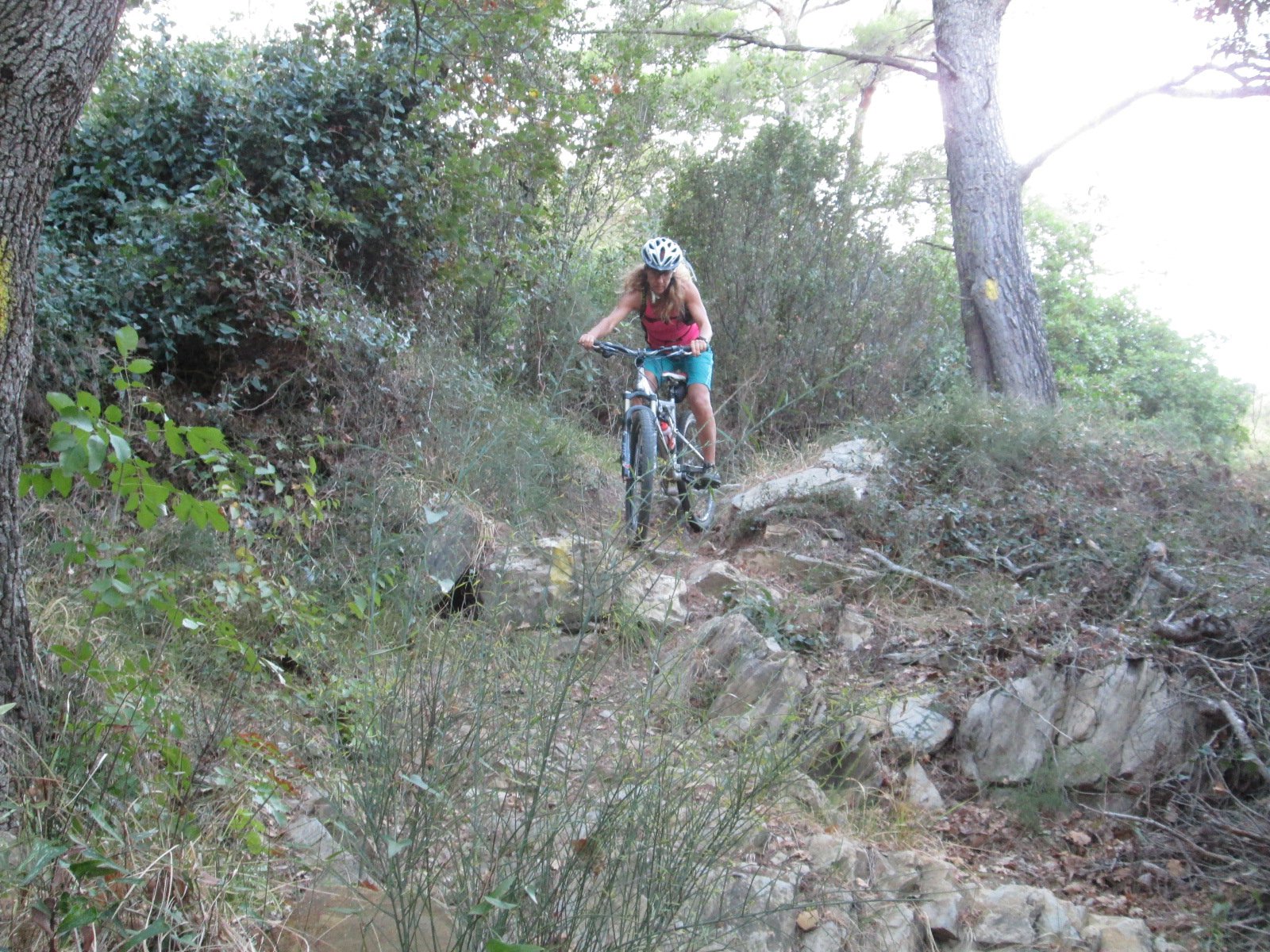 Si scende su quello più a destra (soprannominato “I Maiali”), molto bello e non particolarmente impegnativo, con fondo compatto e poco pietroso e con parecchi salti tutti evitabili. Il sentiero termina su una strada asfaltata, si svolta a destra e con parecchi saliscendi si ritorna sulla strada di salita poco dopo Colla.