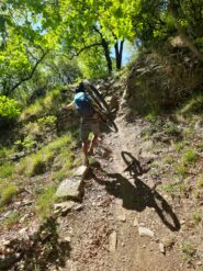 Si risale nuovamente allo spiazzo sterrato e si imbocca lo sterrato sulla destra, che in breve termina e inizia il sentiero dei “Molini”; la prima parte è molto tecnica e impegnativa (parecchi tratti OC), con tornanti e tratti rocciosi, poi nella parte bassa diventa più facile.