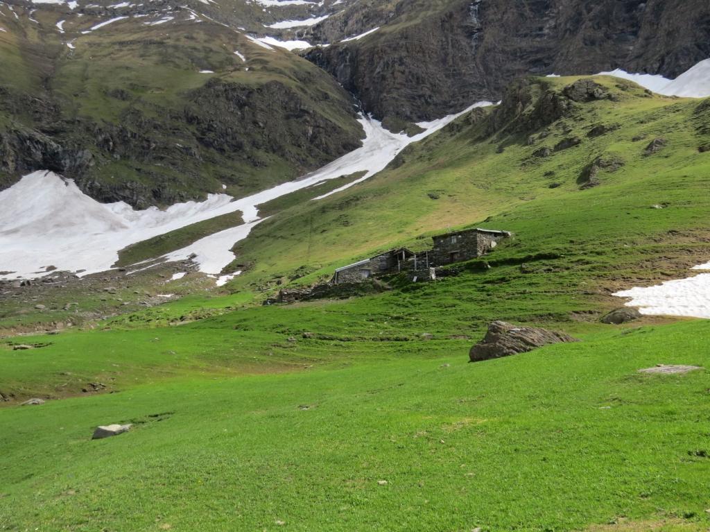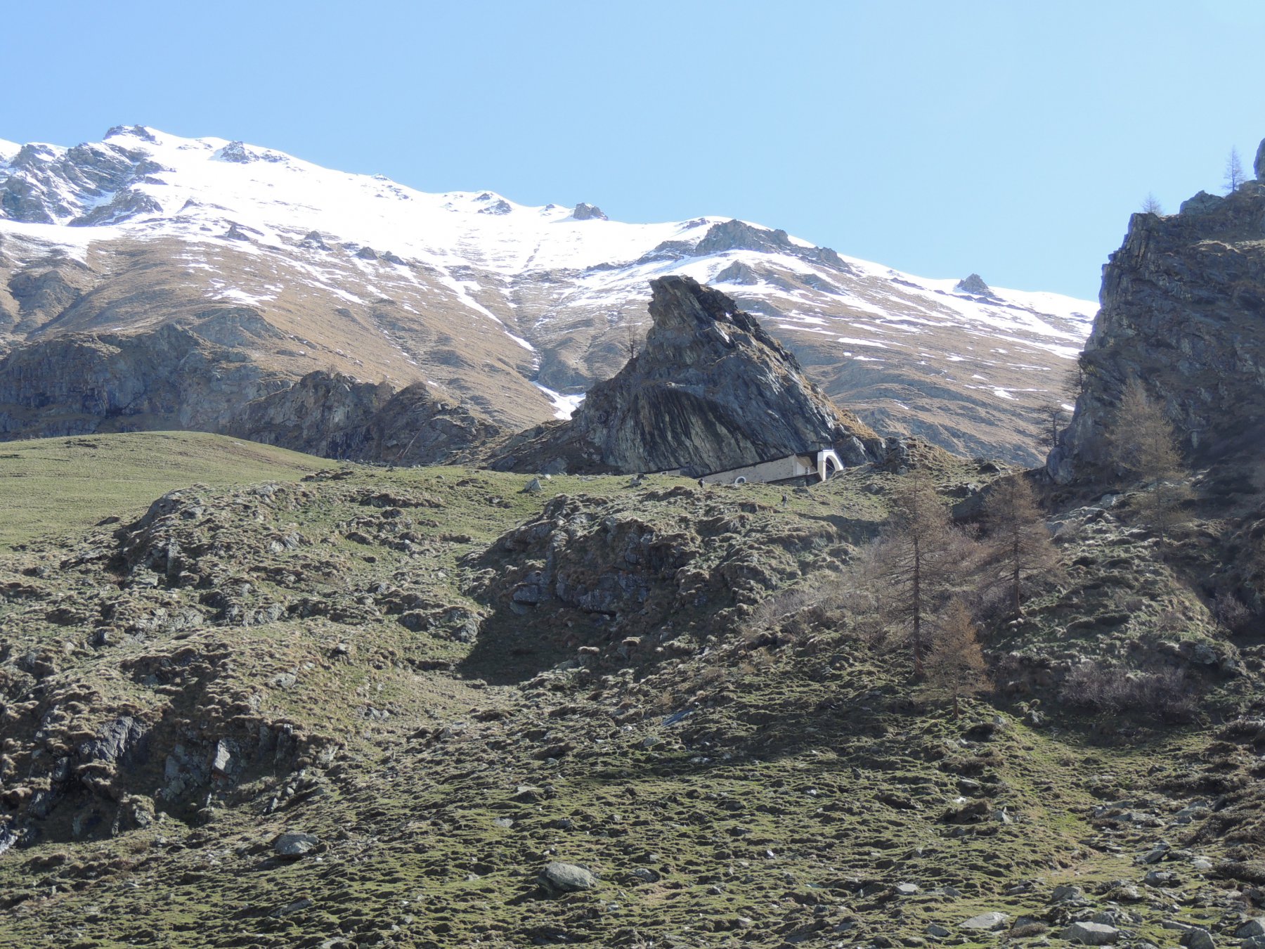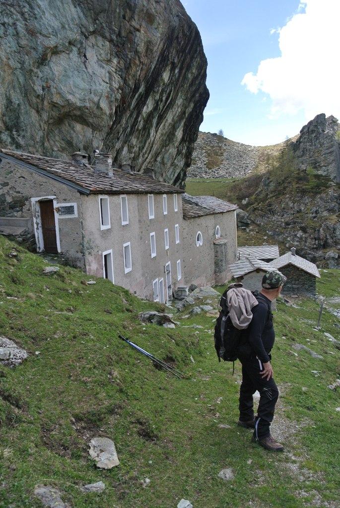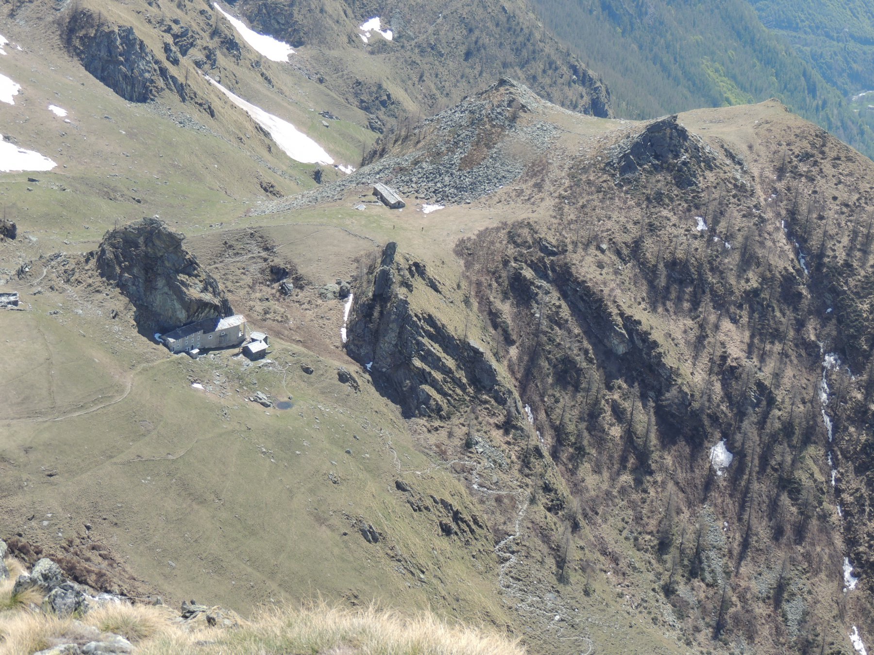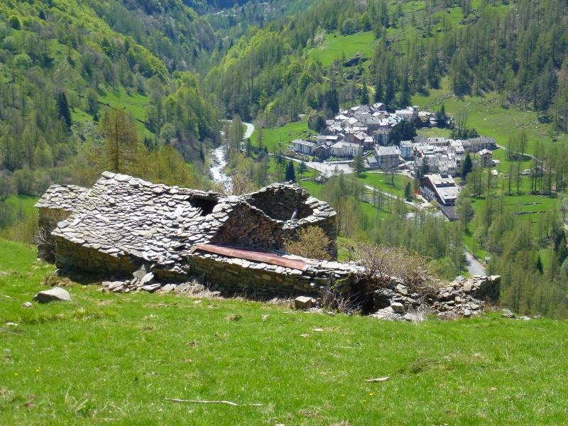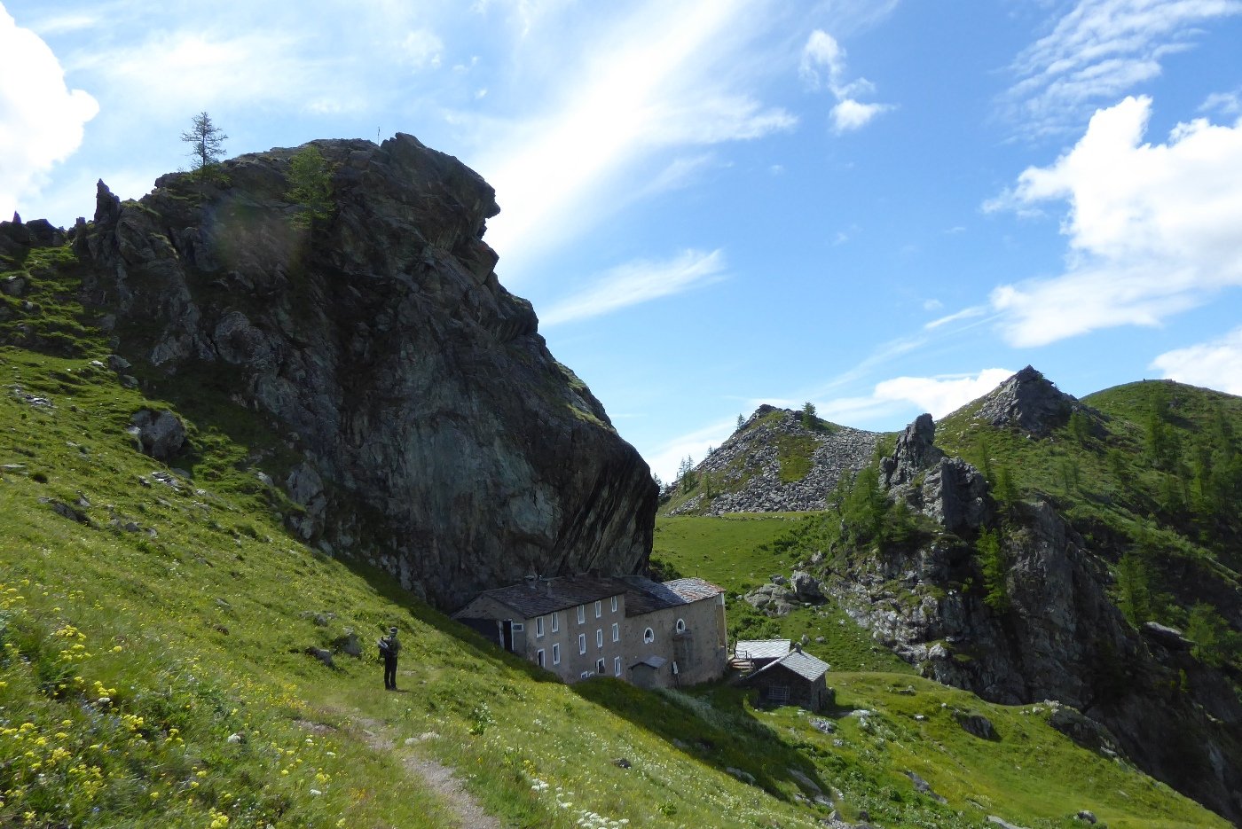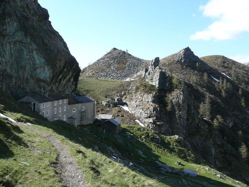 Se invece non si vuol compiere questo giro più lungo, ma solo un mini-anello più breve, si ritorna a San Besso, lasciandolo a destra per proseguire seguendo le indicazioni del sentiero 628 che scende nel selvaggio vallone a sinistra sotto la Punta dell’Orletto; rapidamente si perde quota seguendo il corso del Rio Fanton, che poi resta a sinistra. A quota 1630 m si arriva a Pugnon, dove si può sia andare a destra per giungere al bivio del sentiero 625 lungo la strada di Pian d’Azaria, oppure meglio ancora proseguire sulla traccia principale che continua a scendere ripida per prati toccando alcuni ruderi e poi un pilone votivo. Si scende ancora fino ad un prato che precede un bell’alpeggio, qui si segue la traccia a destra (non indicata ma evidente) che in breve porterà direttamente al ponticello appena dopo il parcheggio. Se invece si continua sul sentiero 628 fino al termine, si arriva al centro di Campiglia, quindi poche centinaia di metri in risalita e si torna all’auto.