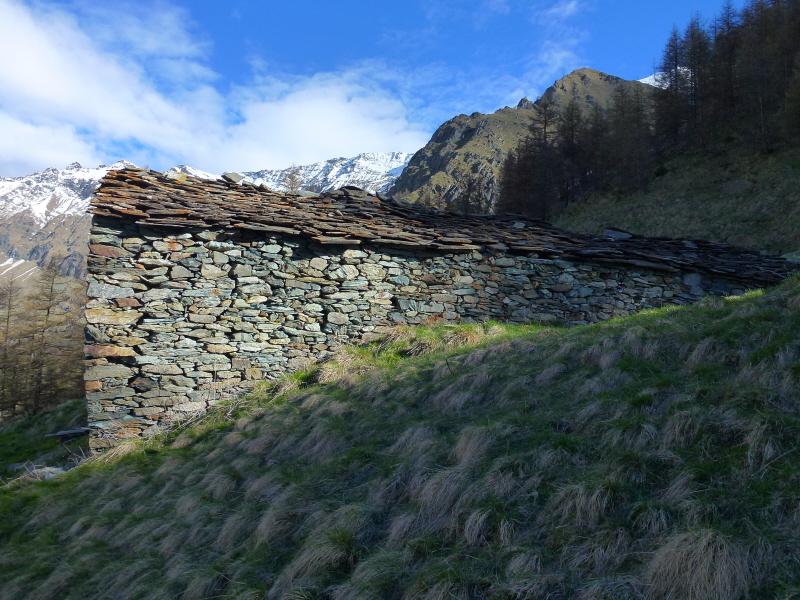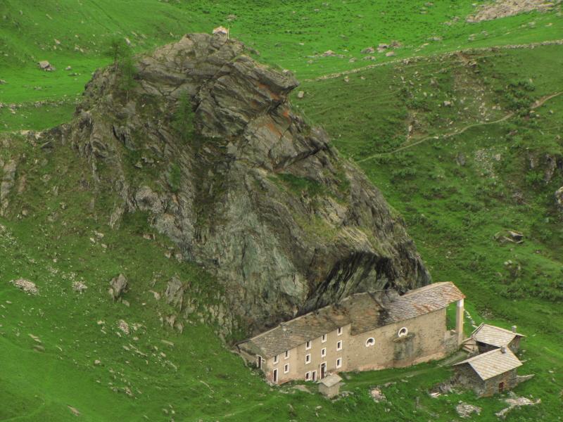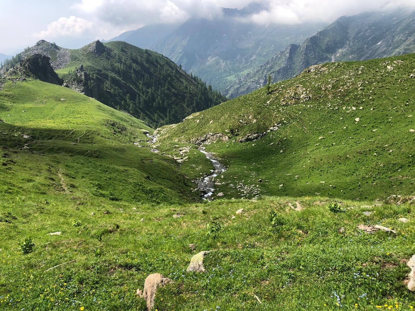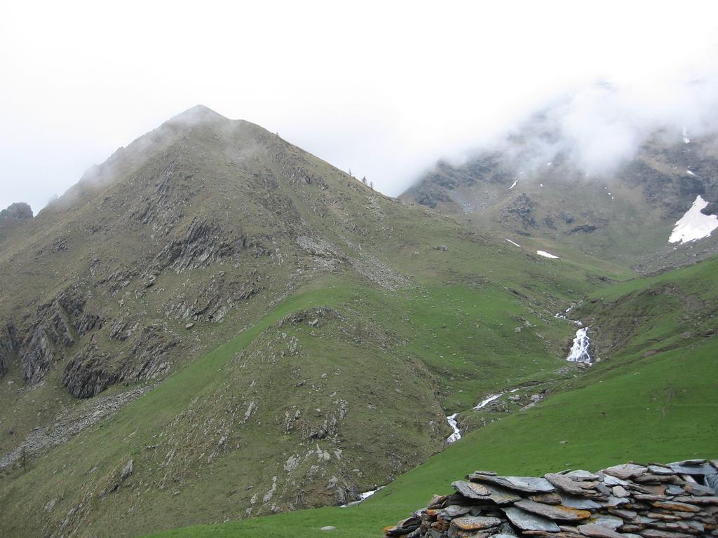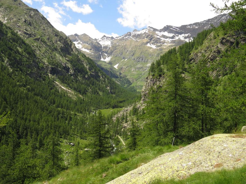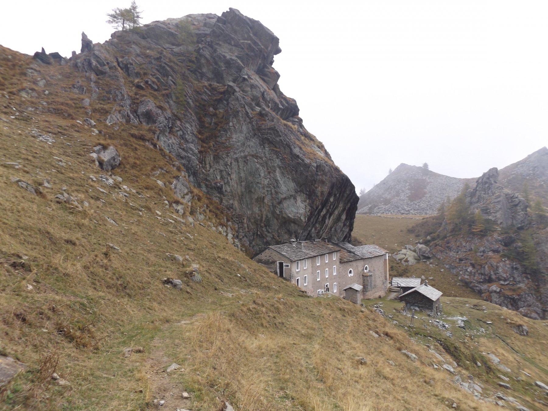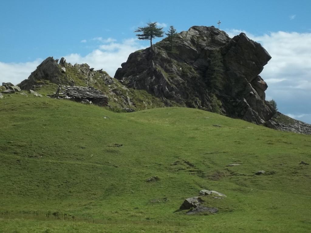 Se invece non si vuol compiere questo giro più lungo, ma solo un mini-anello più breve, si ritorna a San Besso, lasciandolo a destra per proseguire seguendo le indicazioni del sentiero 628 che scende nel selvaggio vallone a sinistra sotto la Punta dell’Orletto; rapidamente si perde quota seguendo il corso del Rio Fanton, che poi resta a sinistra. A quota 1630 m si arriva a Pugnon, dove si può sia andare a destra per giungere al bivio del sentiero 625 lungo la strada di Pian d’Azaria, oppure meglio ancora proseguire sulla traccia principale che continua a scendere ripida per prati toccando alcuni ruderi e poi un pilone votivo. Si scende ancora fino ad un prato che precede un bell’alpeggio, qui si segue la traccia a destra (non indicata ma evidente) che in breve porterà direttamente al ponticello appena dopo il parcheggio. Se invece si continua sul sentiero 628 fino al termine, si arriva al centro di Campiglia, quindi poche centinaia di metri in risalita e si torna all’auto.