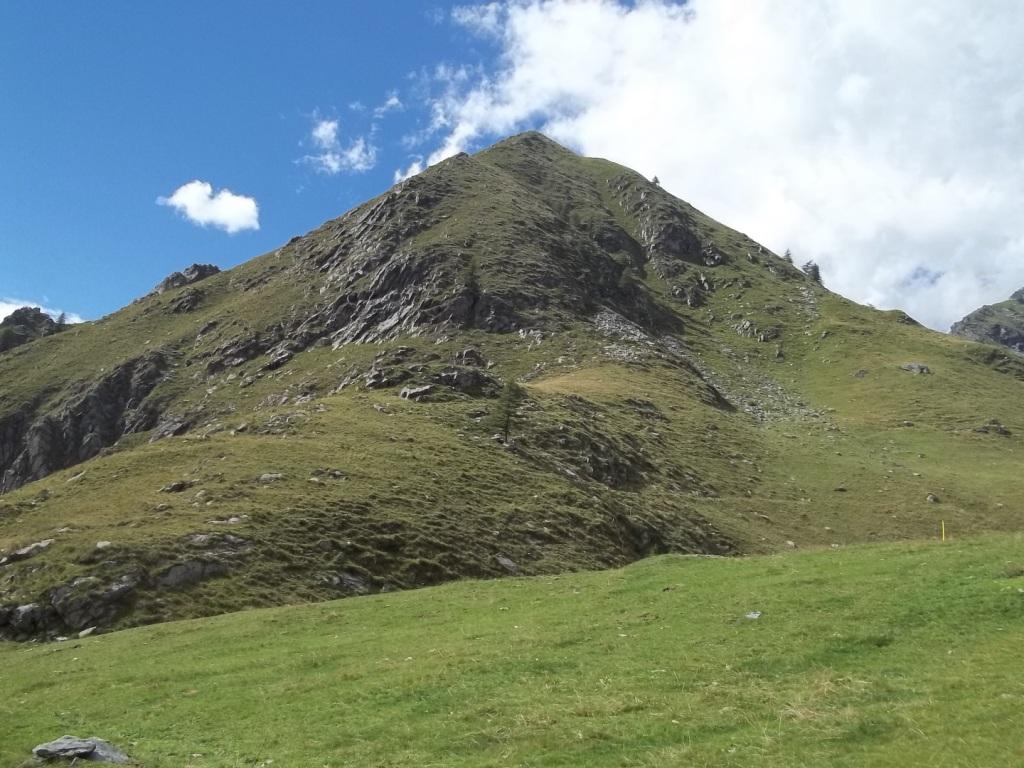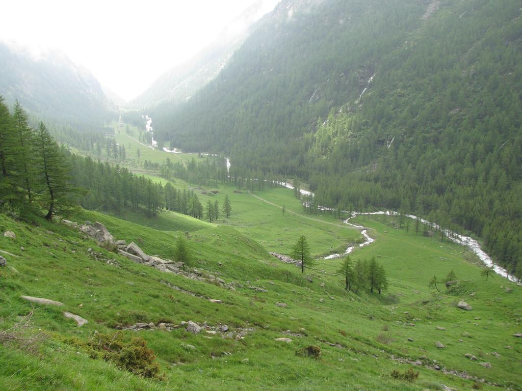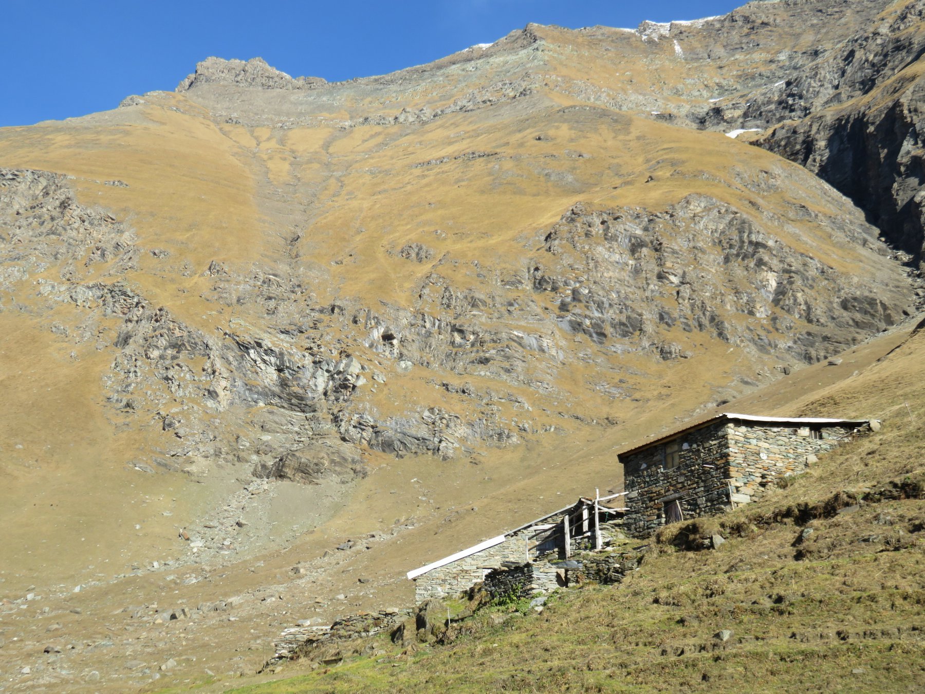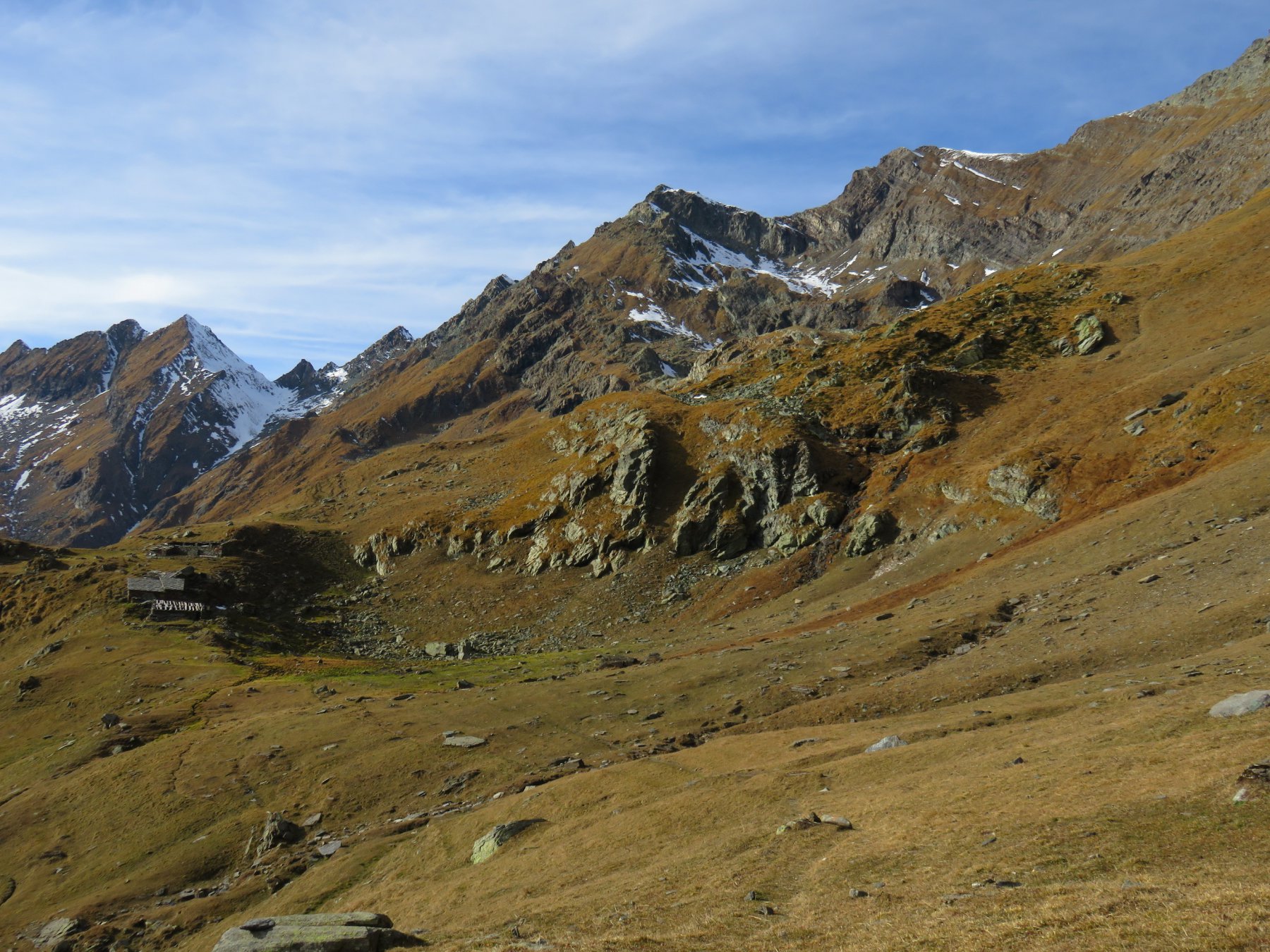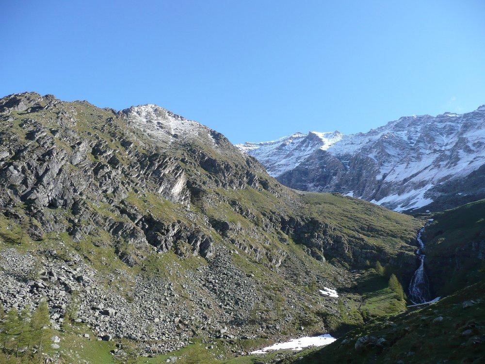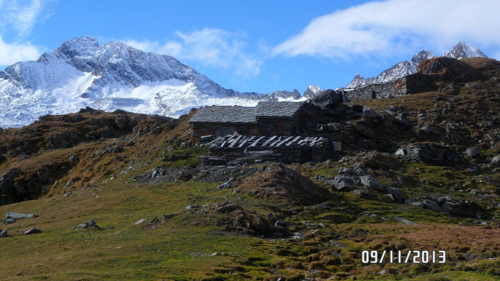 Se invece non si vuol compiere questo giro più lungo, ma solo un mini-anello più breve, si ritorna a San Besso, lasciandolo a destra per proseguire seguendo le indicazioni del sentiero 628 che scende nel selvaggio vallone a sinistra sotto la Punta dell’Orletto; rapidamente si perde quota seguendo il corso del Rio Fanton, che poi resta a sinistra. A quota 1630 m si arriva a Pugnon, dove si può sia andare a destra per giungere al bivio del sentiero 625 lungo la strada di Pian d’Azaria, oppure meglio ancora proseguire sulla traccia principale che continua a scendere ripida per prati toccando alcuni ruderi e poi un pilone votivo. Si scende ancora fino ad un prato che precede un bell’alpeggio, qui si segue la traccia a destra (non indicata ma evidente) che in breve porterà direttamente al ponticello appena dopo il parcheggio. Se invece si continua sul sentiero 628 fino al termine, si arriva al centro di Campiglia, quindi poche centinaia di metri in risalita e si torna all’auto.