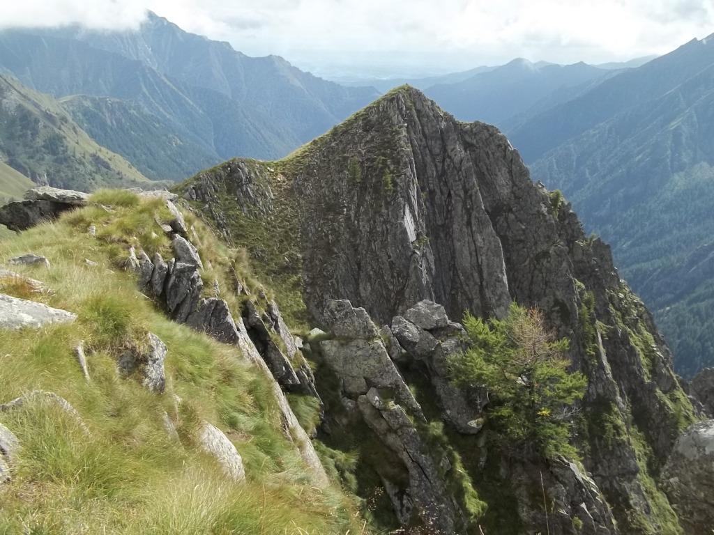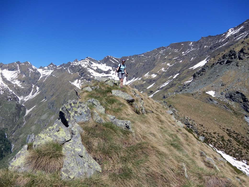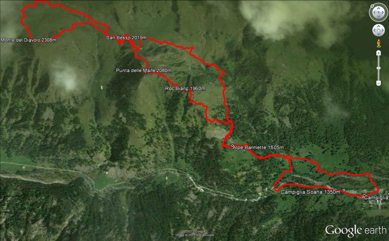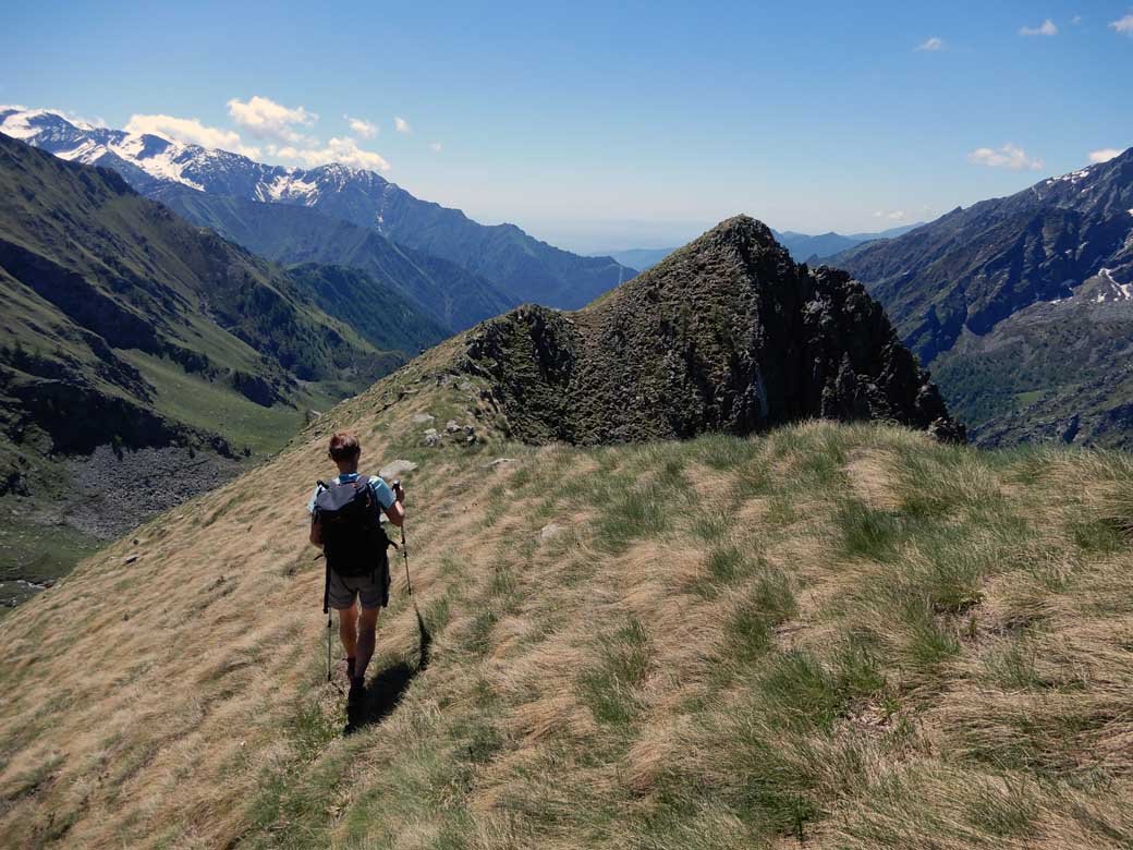 Con dolci avvallamenti si segue il vallone superando l’Alpe della Balma 2147 m e con ampio semicerchio da destra a sinistra si arriva al Colle Balma Arietta 2335 m. Da qui si prosegue per vaghe tracce sul costone di rocce ed erba verso sud (sinistra) mantenendosi sempre sul versante di San Besso (attenzione in caso di neve) toccando la quota 2341 m, punto più alto del crinale che culmina in fondo con il Monte del Diavolo. Si segue il facile crinale prevalentemente erboso perdendo quota sino ad una selletta proprio sotto il Monte del Diavolo, che si sale senza problemi su zolle erbose 2308 m. In autunno attenzione all’erba olina !