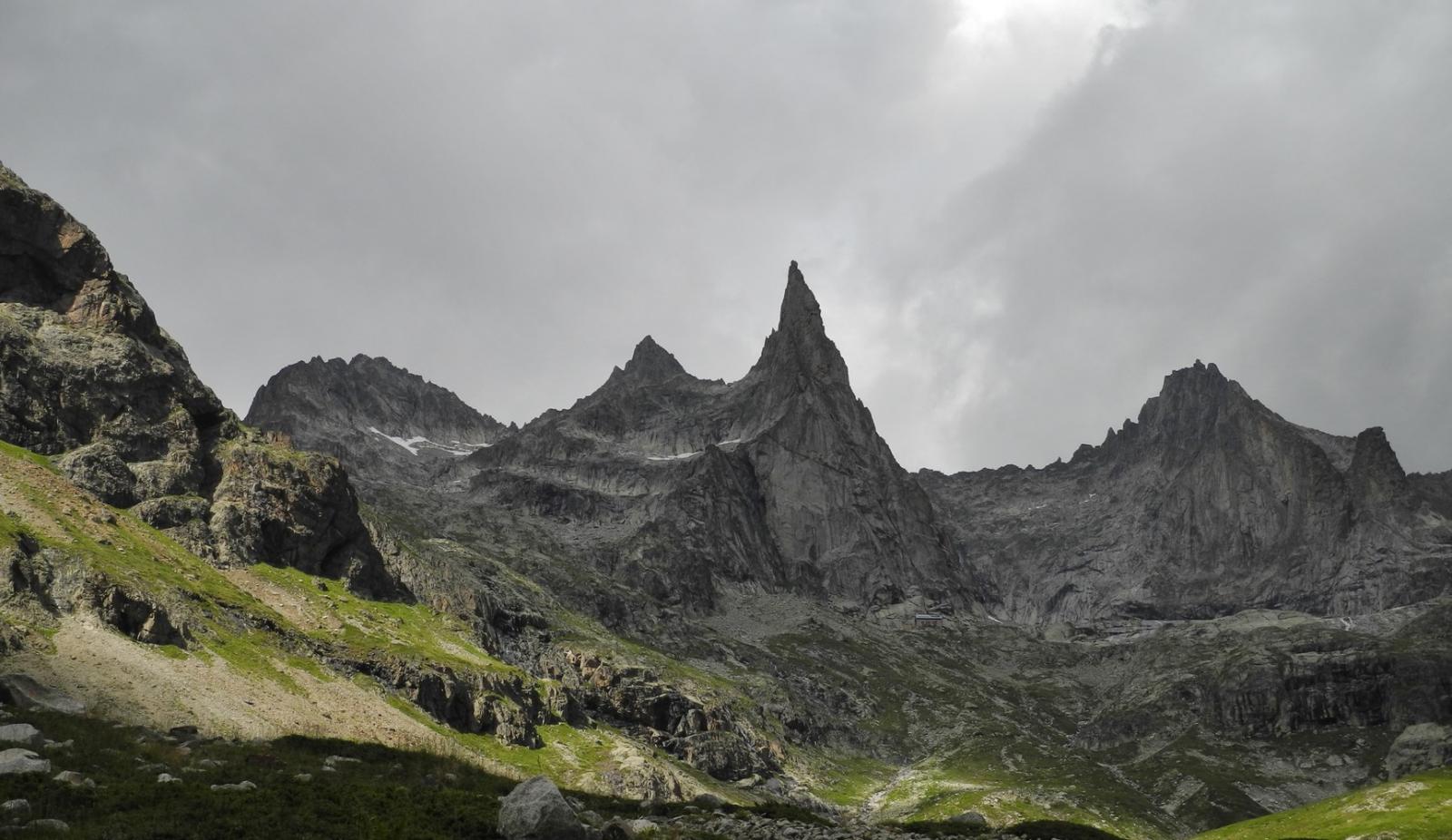 Si risale per pietraie sino al nevaio sul versante sud del Colle occidentale di Soreiller costeggiando lo zoccolo della Ovest dell’Aiguille.