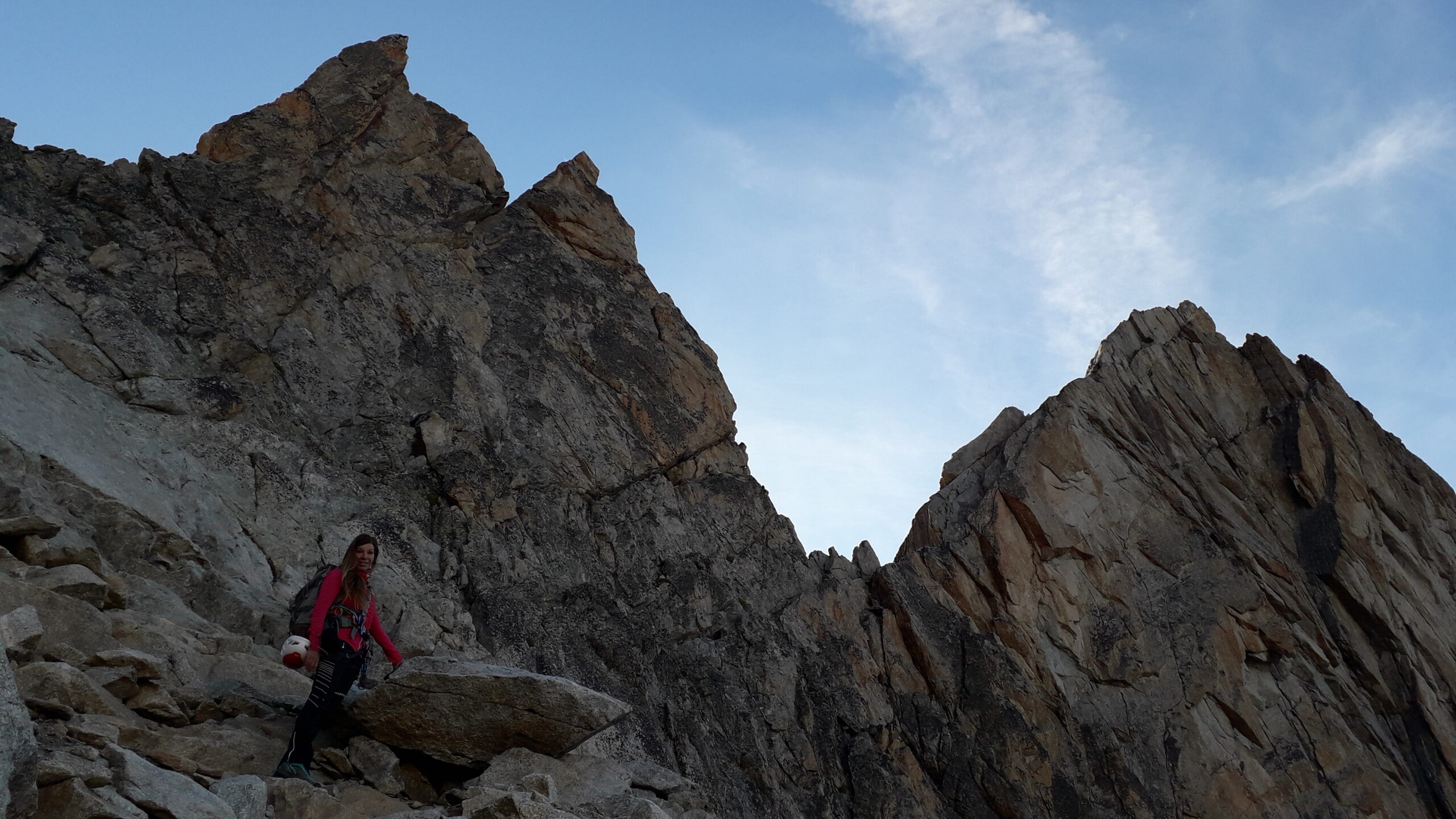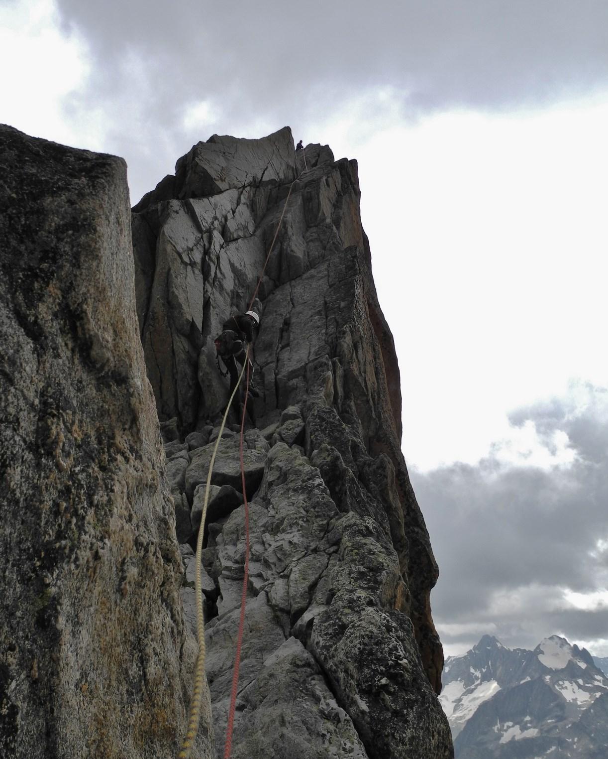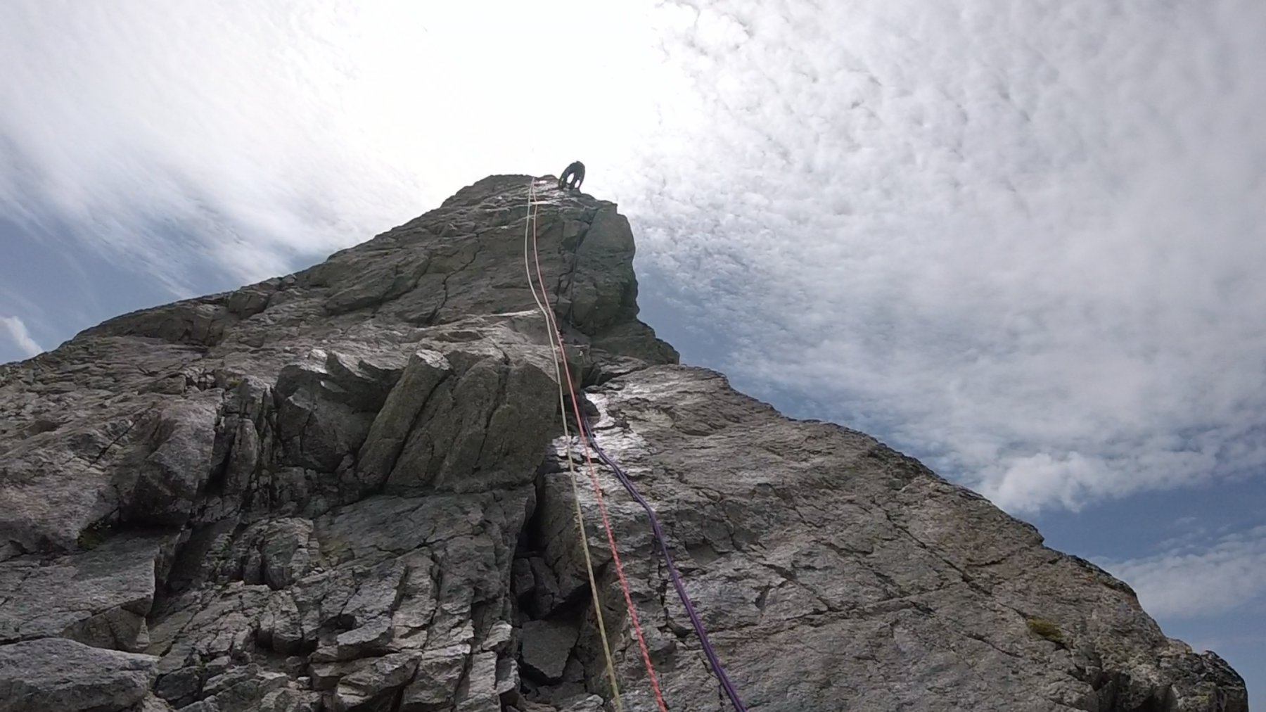 Si prosegue lungo le placche grige sempre sul filo (III) fino alla esigua vetta.