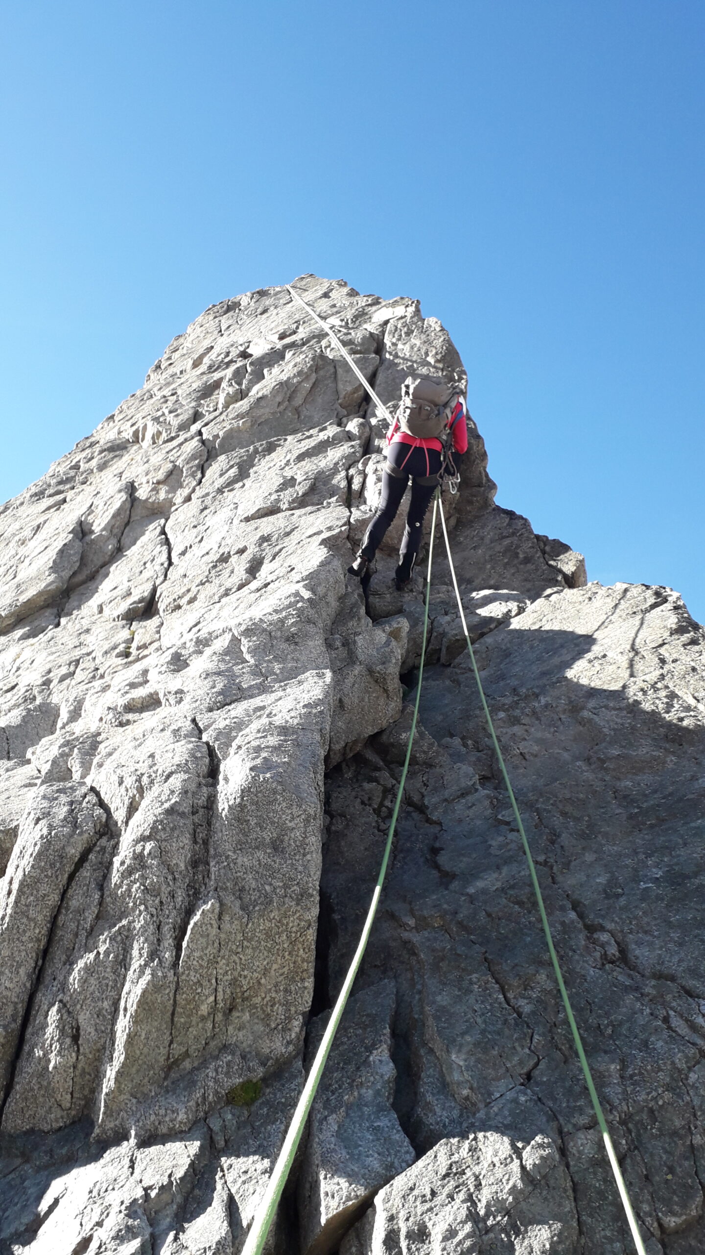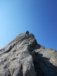 Da quì si sale dritti sul fianco ovest della cresta, lungo un diedro di 20 metri (III+)che porta sul filo di cresta al livello di un grosso masso.