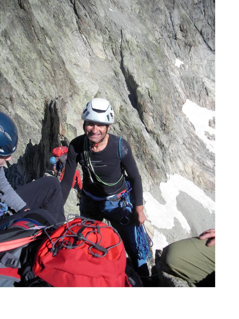 Giusto per la soddisfazione di visitare un luogo nuovo, tenere alto il grado di allenamento con salita diretta dal basso, e cosi concludere un profiquo tour di tre giorni in Delfinato, con un’aerea e breve arrampicata al seguito. E dove se non su questa ardita Guglia nel massiccio dei Soreiller. Gia’ invasa da cordate al mio arrivo tutte intente nell’uso persino spropositato della corda, usata dal sottoscritto solo per la fase di calata alla Breche dall’appuntita vetta. Cosa non da tutti, salire in libera slegati su passi di 3°+ con sotto un vuoto impressionante, almeno non per chi non ritiene che il rischio vada eliminato del tutto. Rientro con veloce spuntino, consumato all’esterno del rifugio in posizione favorevole per la scalata alla Guglia posta a ridosso del rifugio stesso. Ma ora il tempo e’ scaduto..si ritorna a casa..!