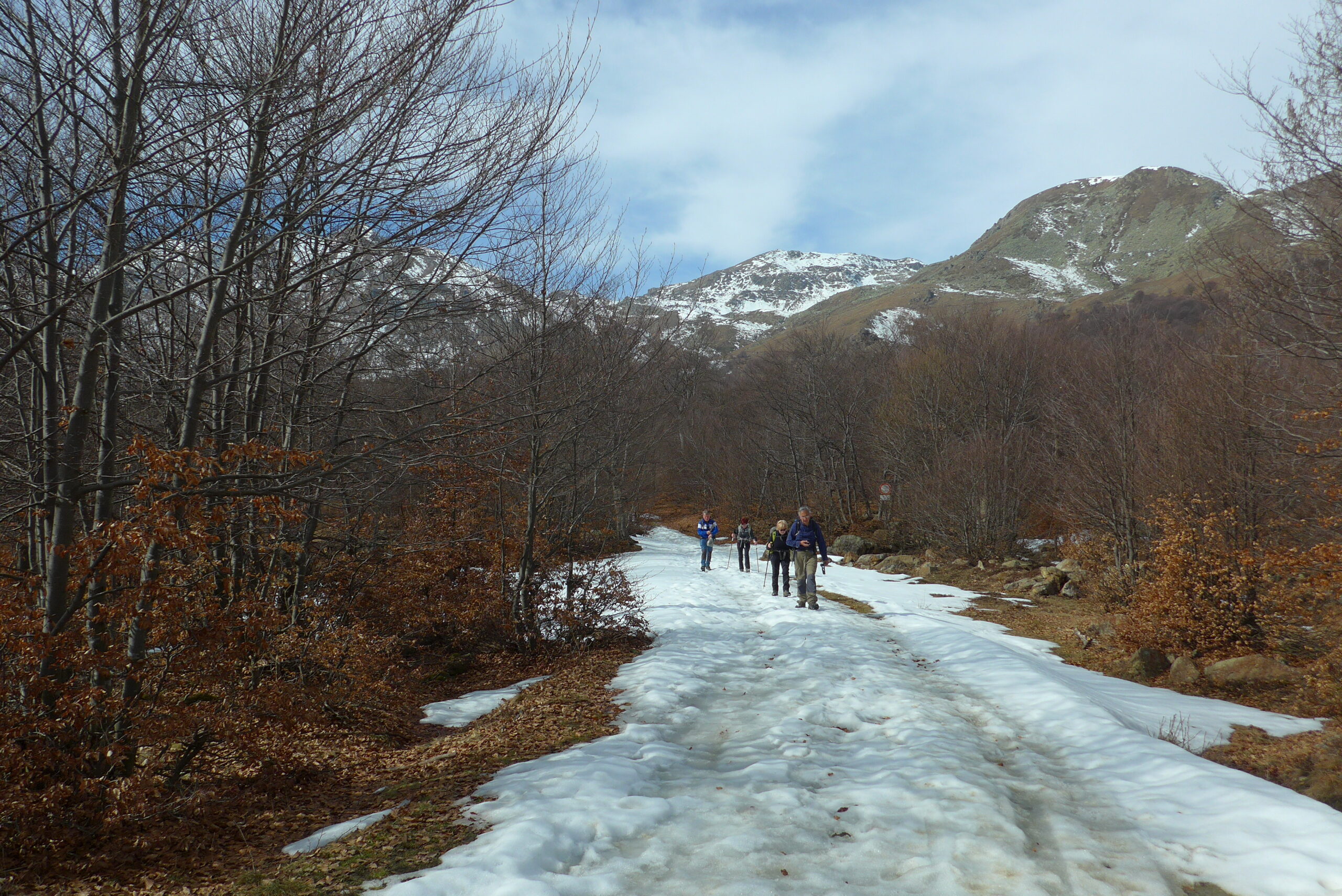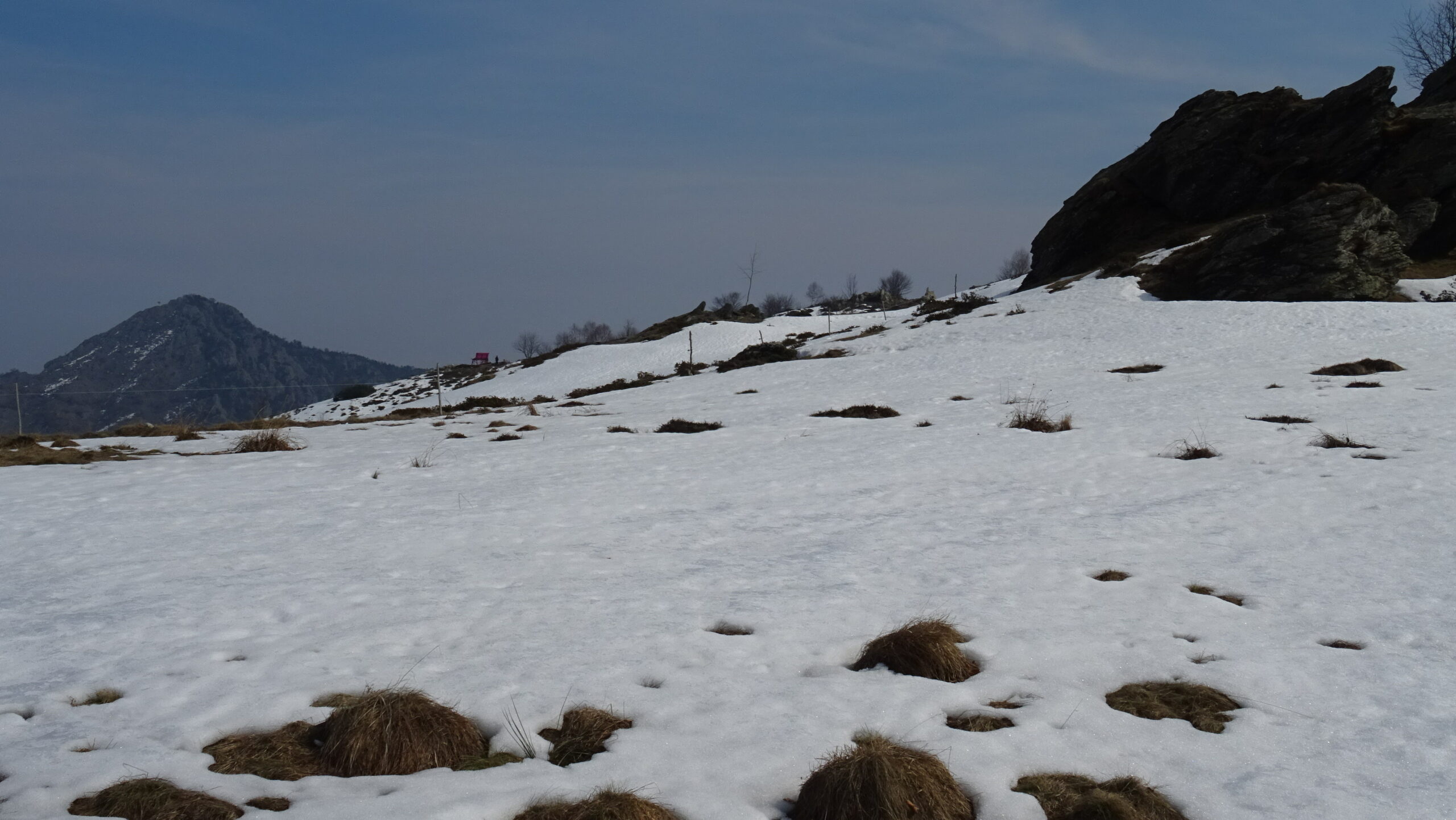 Da qui si percorre la strada asfaltata in leggera discesa che arriva da Viù. Si giunge subito al bivio dove a sinistra si va all’Alpe Bianca. Si imbocca questa strada fino al primo tornante da dove parte a destra una traccia poco evidente (cartello abbattuto, 25/2/2023). La traccia attraversa con qualche saliscendi il bosco superando il rio Viana con un attraversamento un po’ difficoltoso, prosegue e sbuca sulla sterrata che sale verso il Roc Sapai.